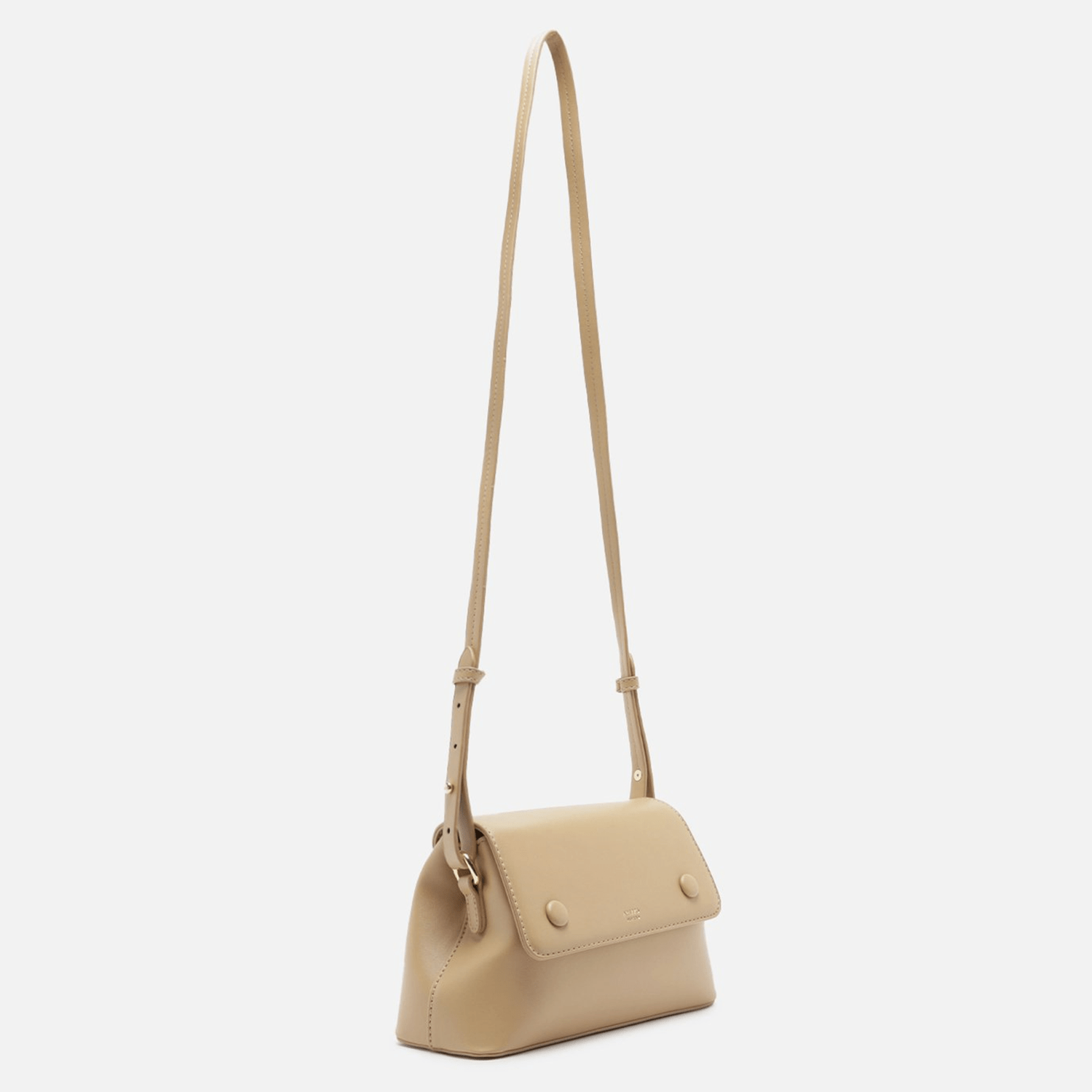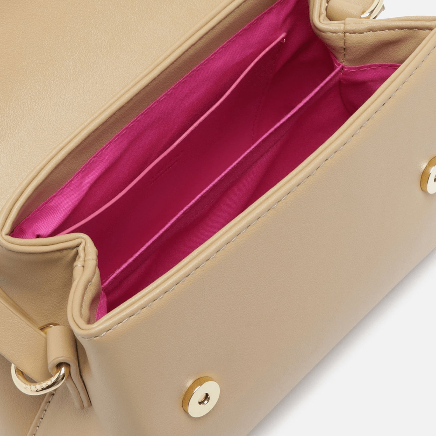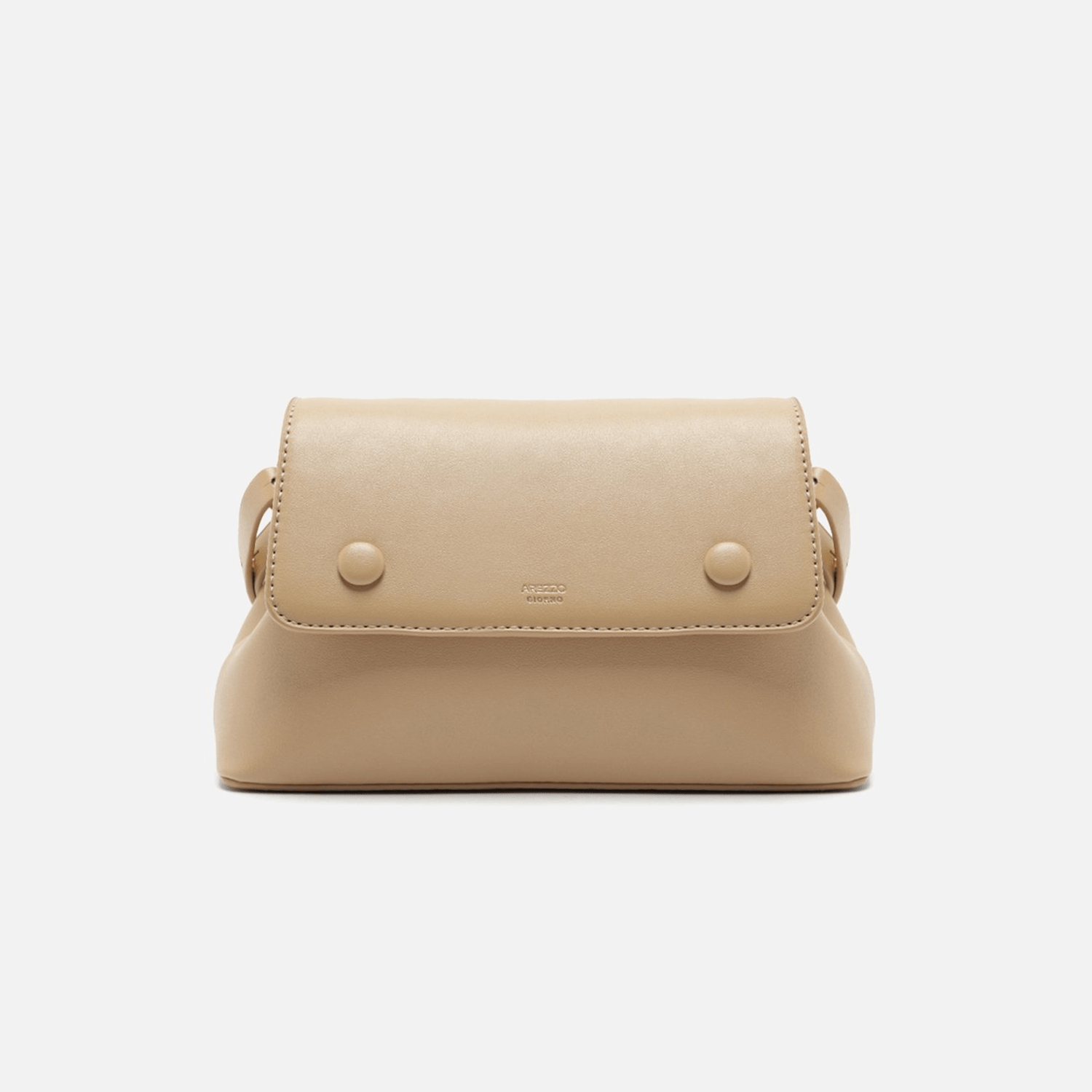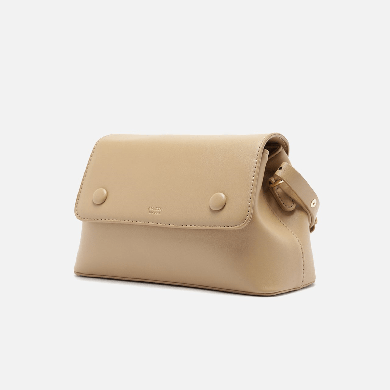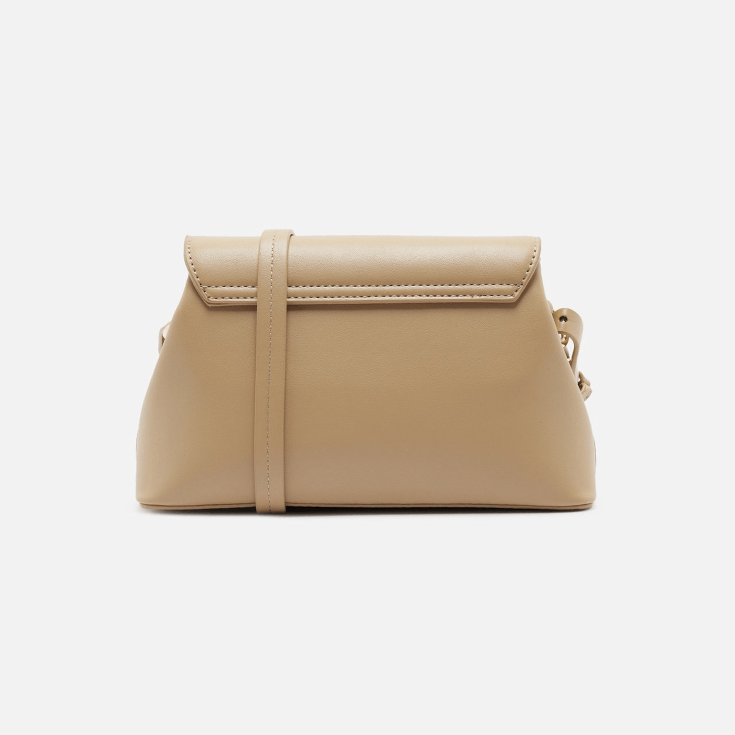 - Detalhes do modelo: Bolsa tiracolo média bege com formato estruturado e laterais arredondadas. Traz alça lateral, fecho em tampo frontal e imãs internos. Costuras pesposto pelo contorno, e incrição do nome da marca na capa frontal.