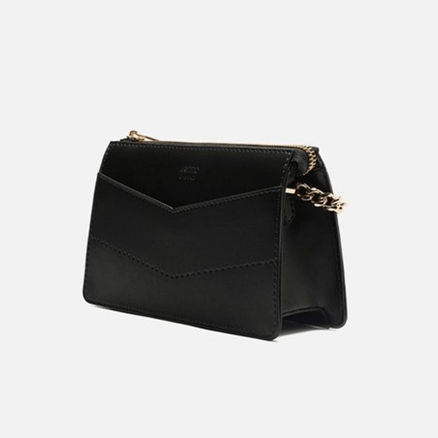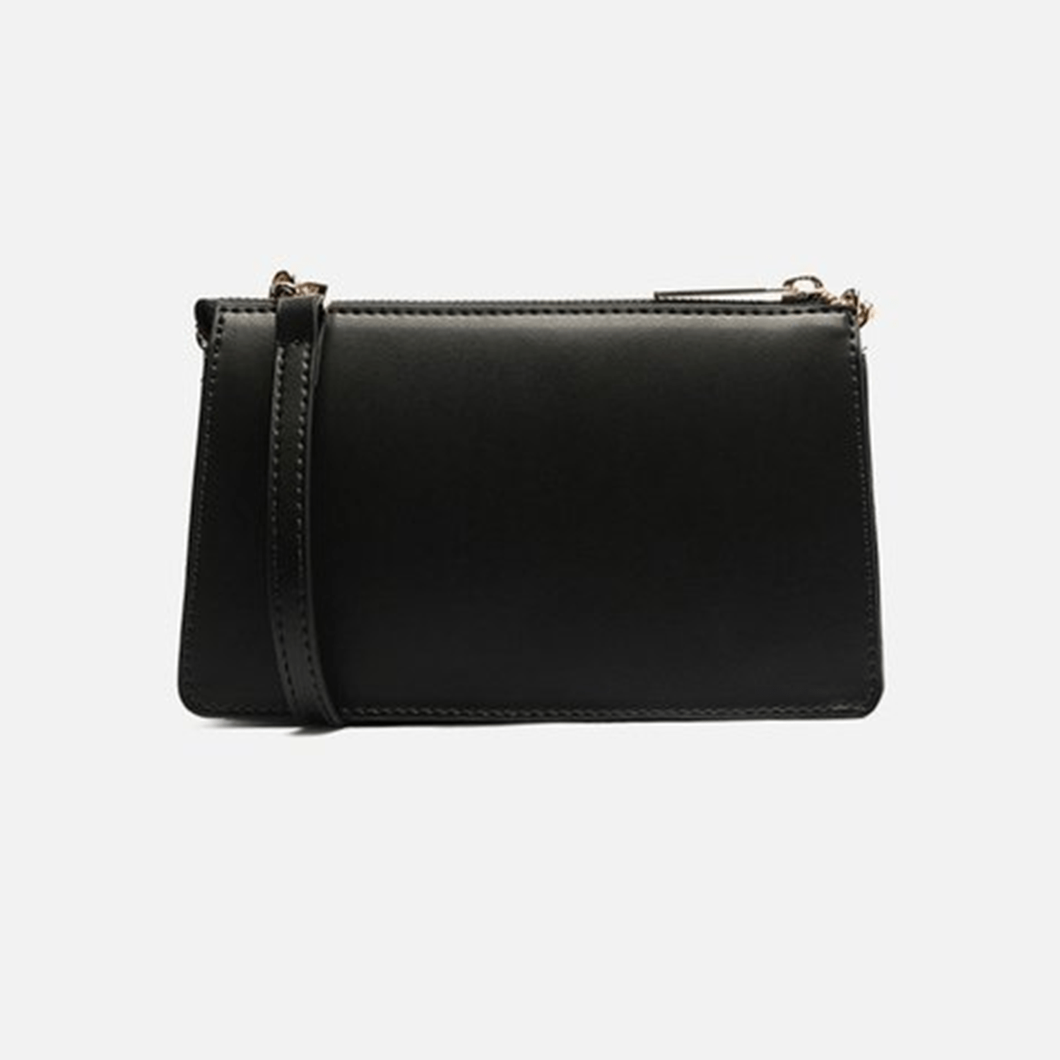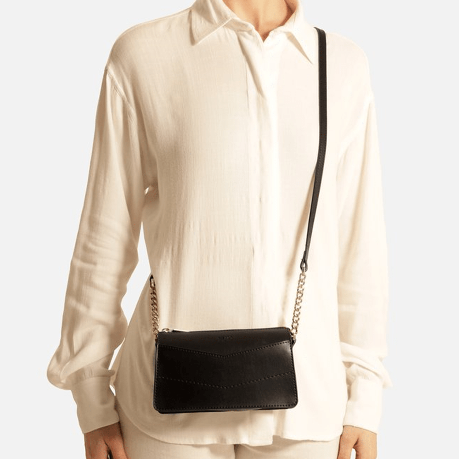 Bolsa tiracolo pequena preta tem formato estruturado, acabamento liso e inscrição discreta do nome da marca.