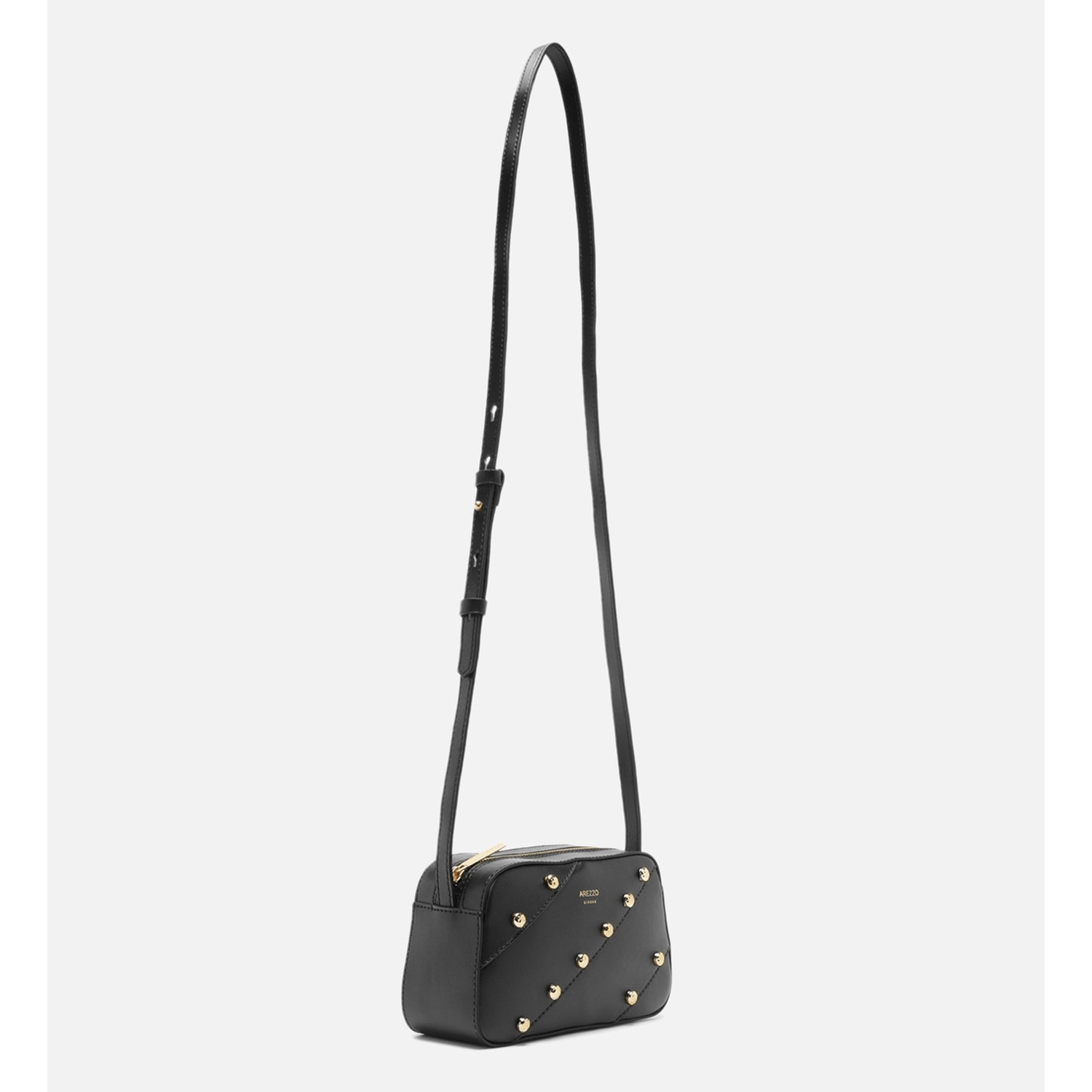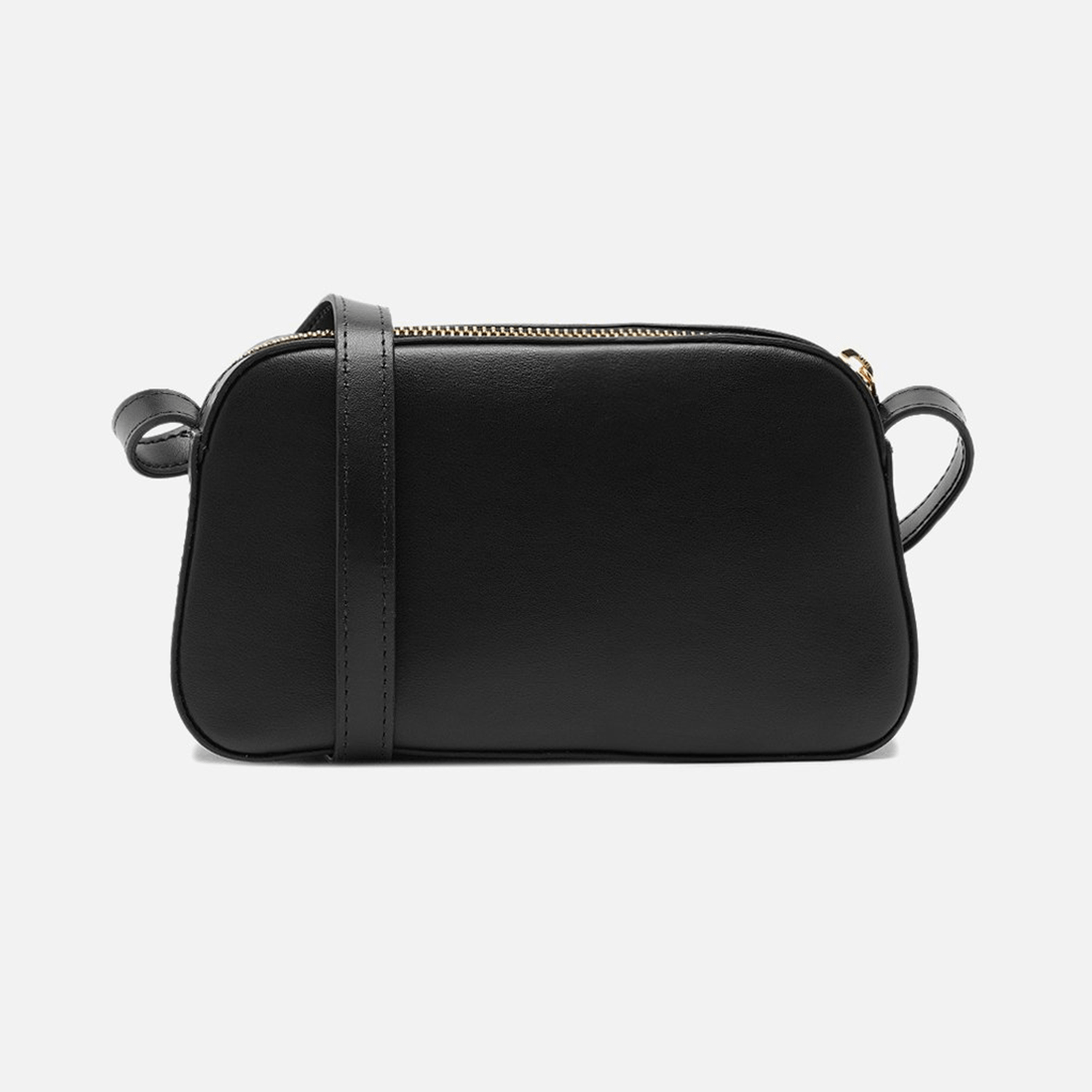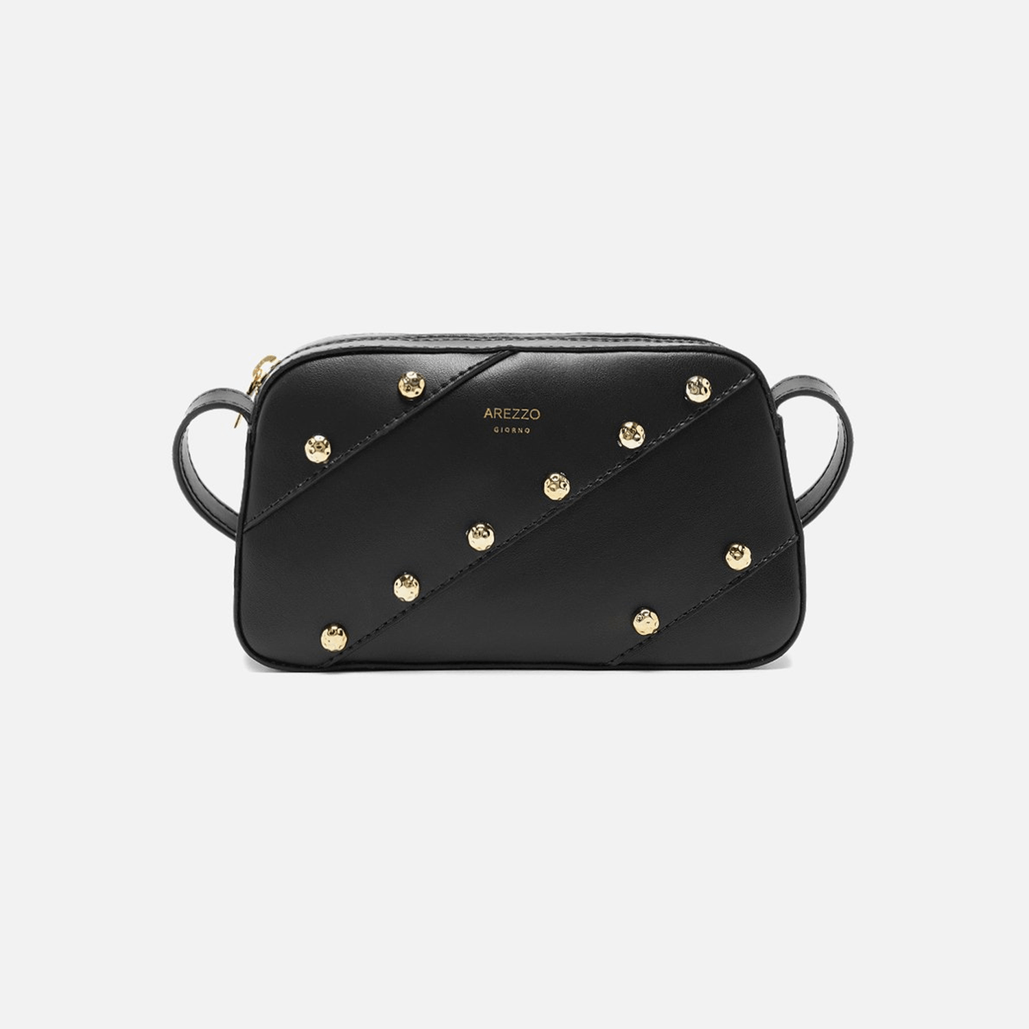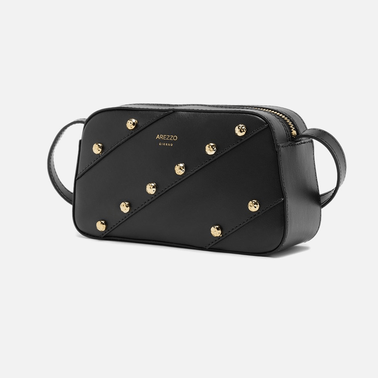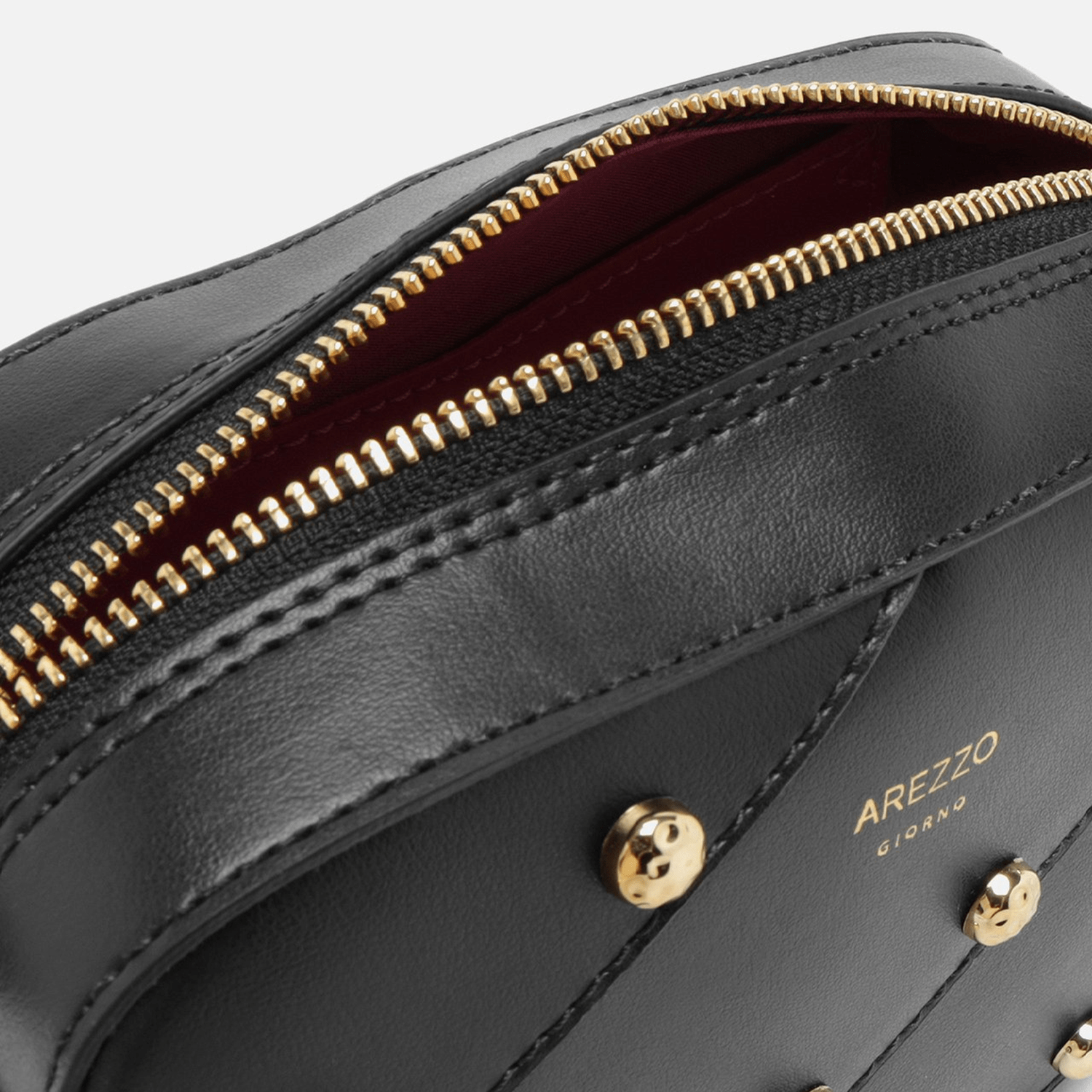 - Detalhes do modelo: Bolsa tiracolo pequena preta com detalhes de recortes e aplicações metálicas douradas. Alça fina e longa, ajustável.