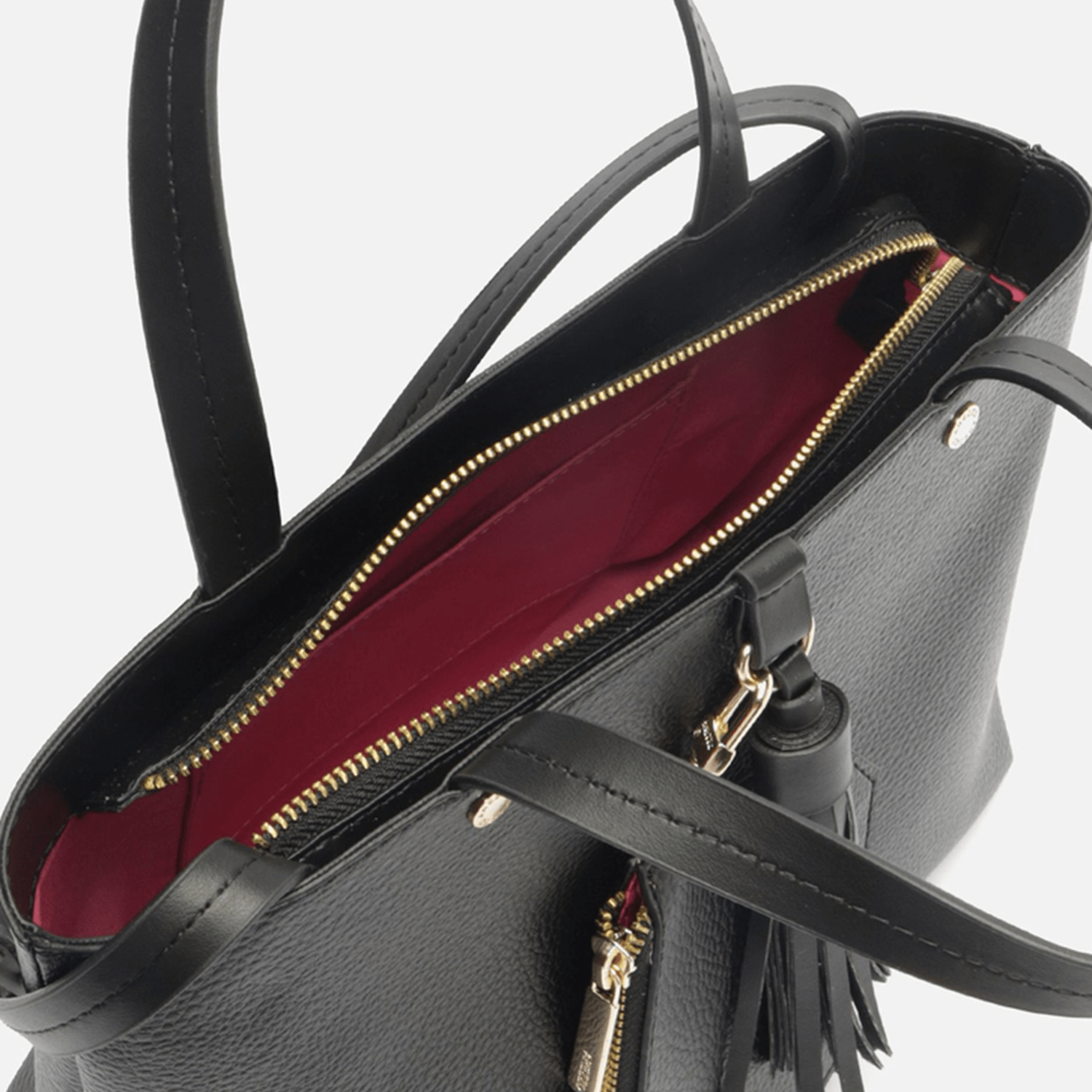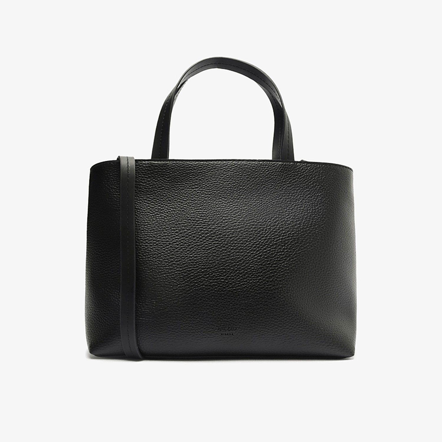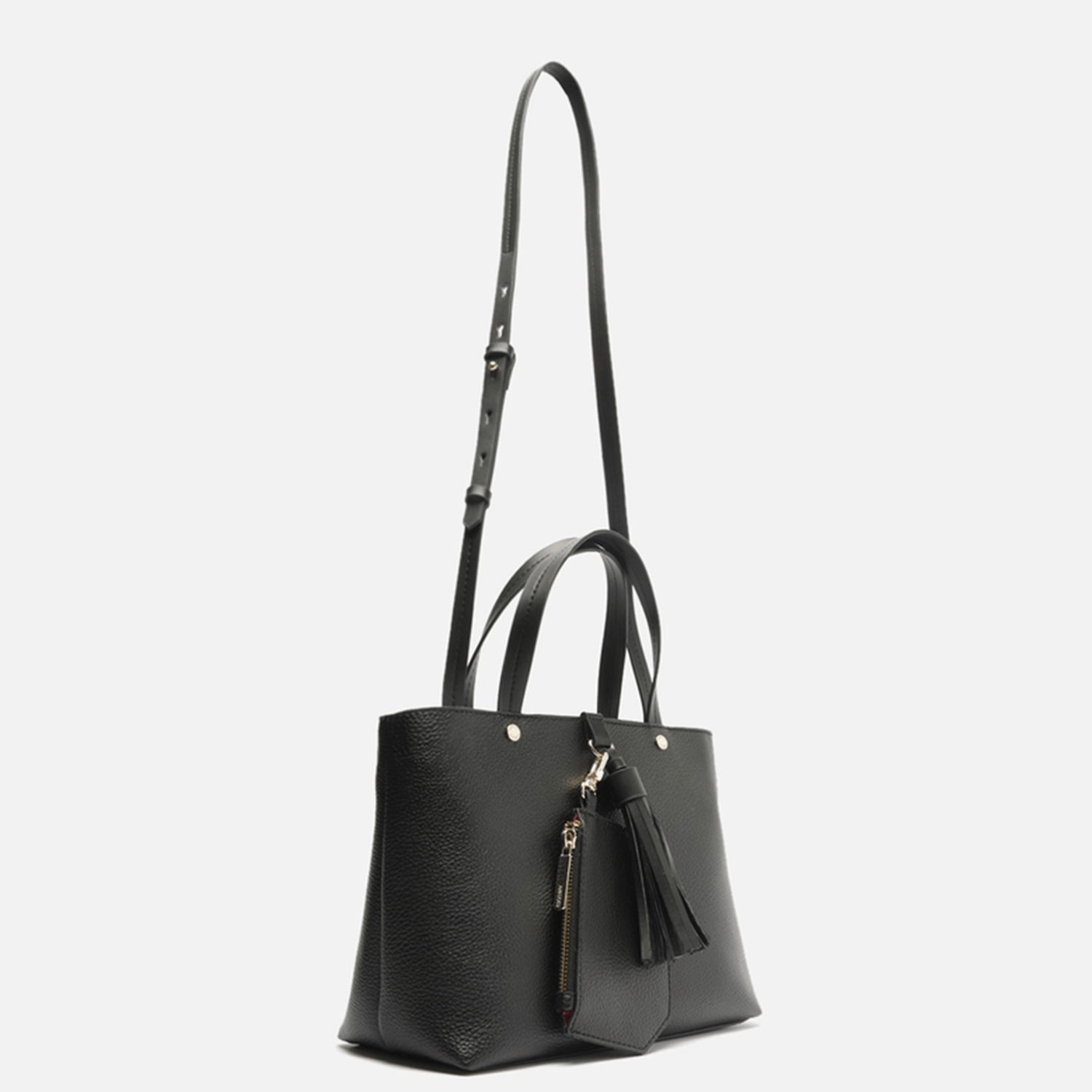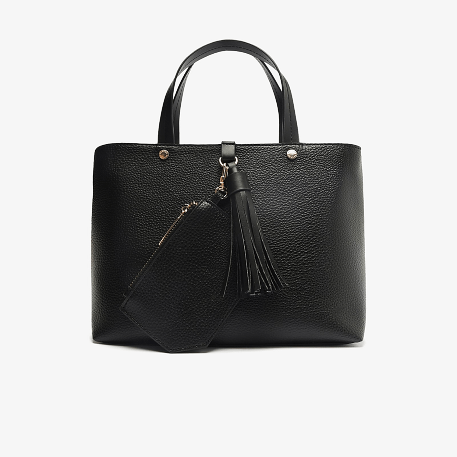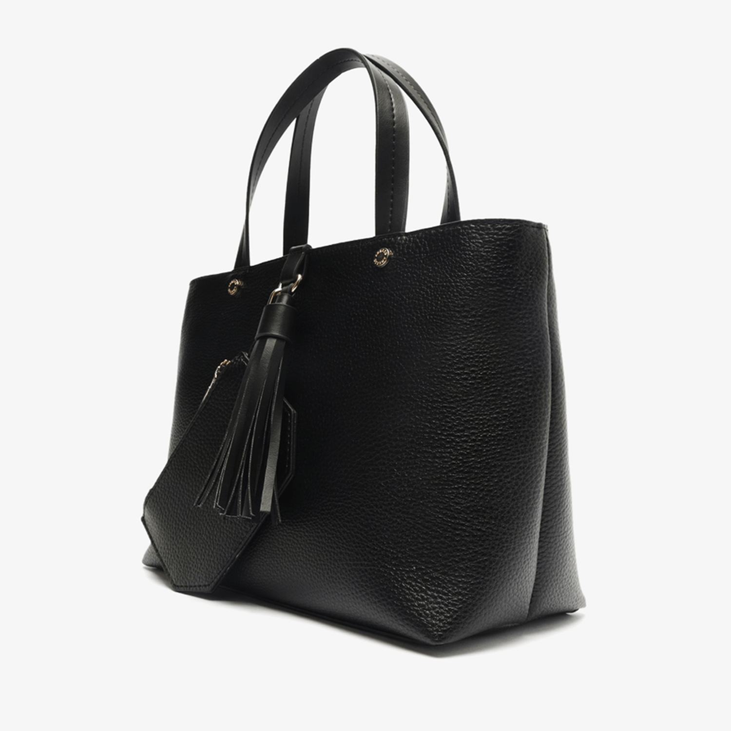 - Detalhes do modelo Bolsa tote média preta. O modelo tem formato estruturado, laterais arredondadas e acabamento texturizado. Traz duas alças de ombro, alça lateral fina regulável e fecho superior. Com barbicacho preso na capa, além de pouch com formato geométrico, fecho em zíper e puxador.