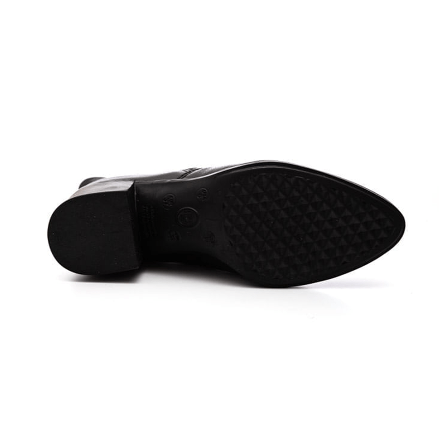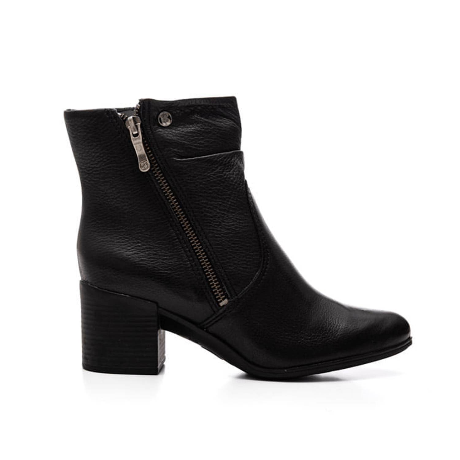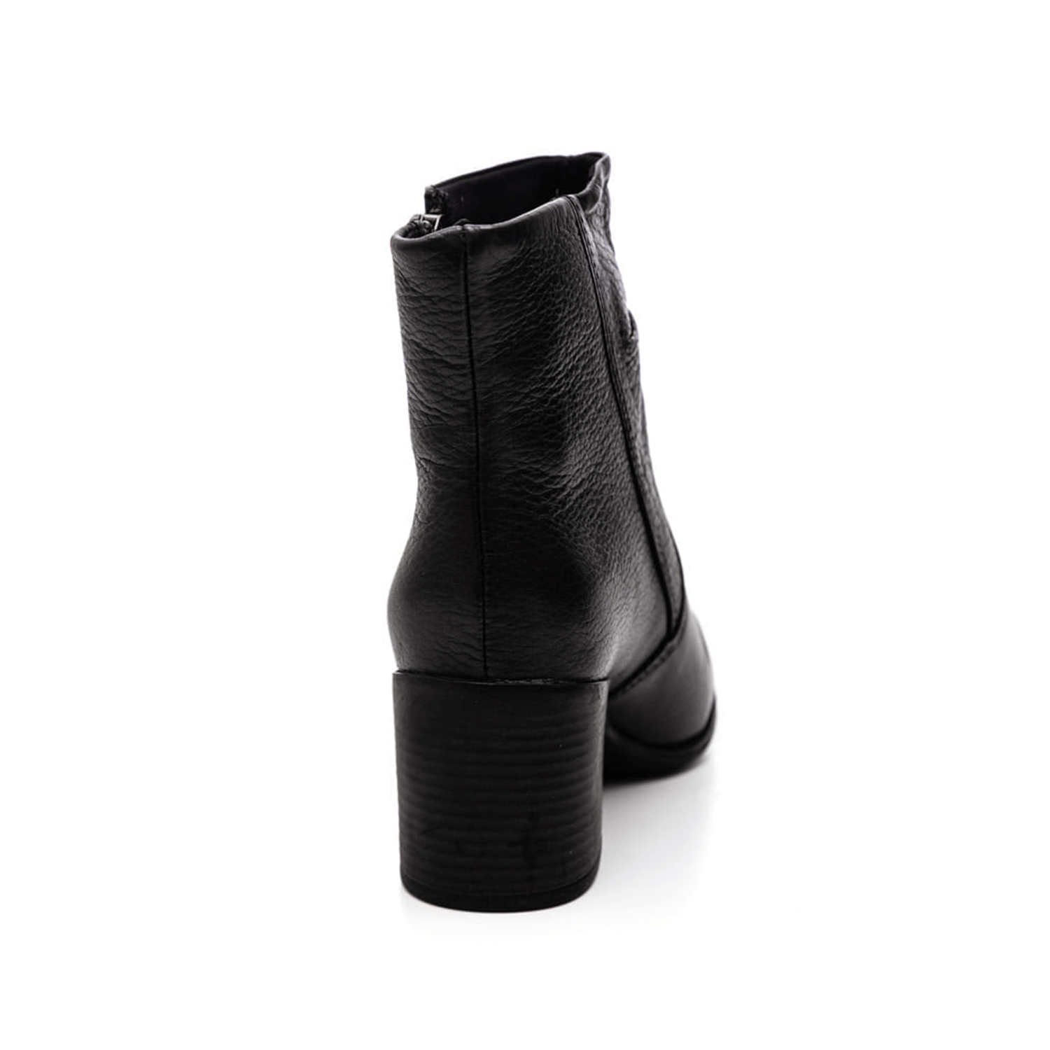 - Detalhes do modelo: Bota de couro, cano baixo, com zíper para facilitar o calce e detalhe drapeado na frente.