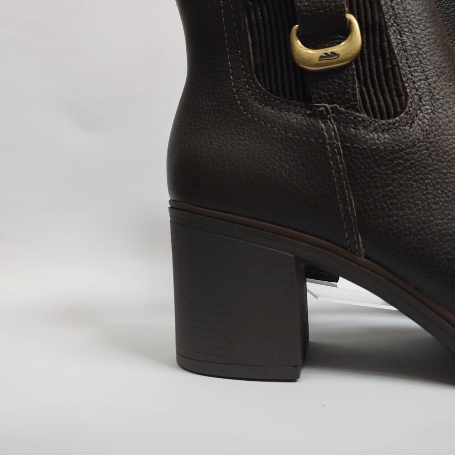 O design minimalista, com detalhes em metal dourado, confere um ar moderno e versátil à peça. O elástico na lateral do cano facilita o calce e agrega no seu design, enquanto o salto bloco de 7cm garante conforto e estabilidade ao caminhar.