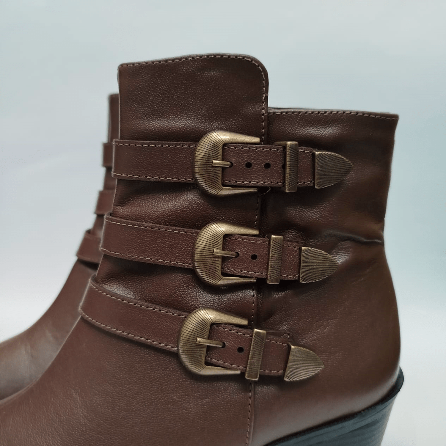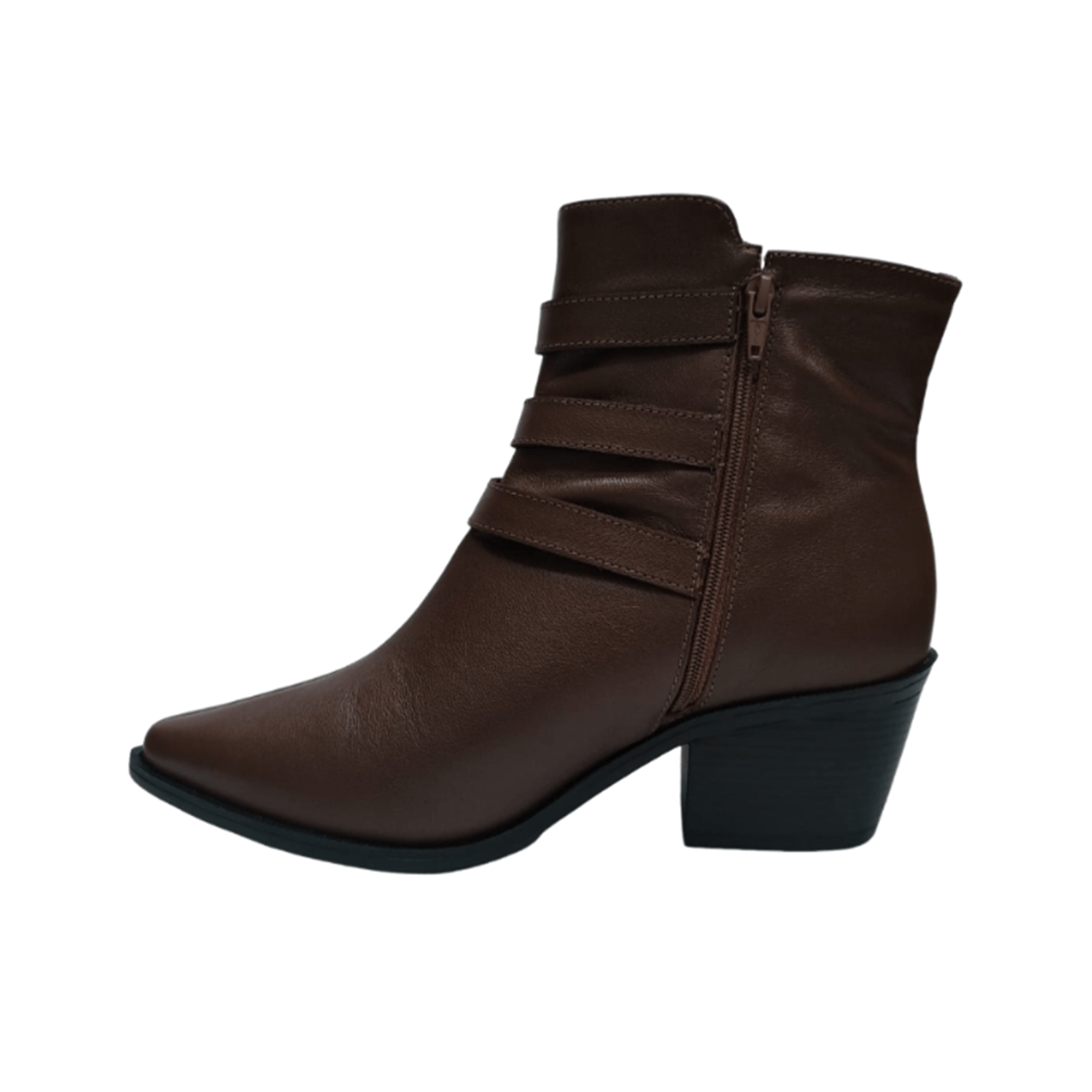 Detalhes do modelo: Salto baixo, bico fino, zíper para facilitar o calce e detalhe de fivelas na lateral em ouro velho