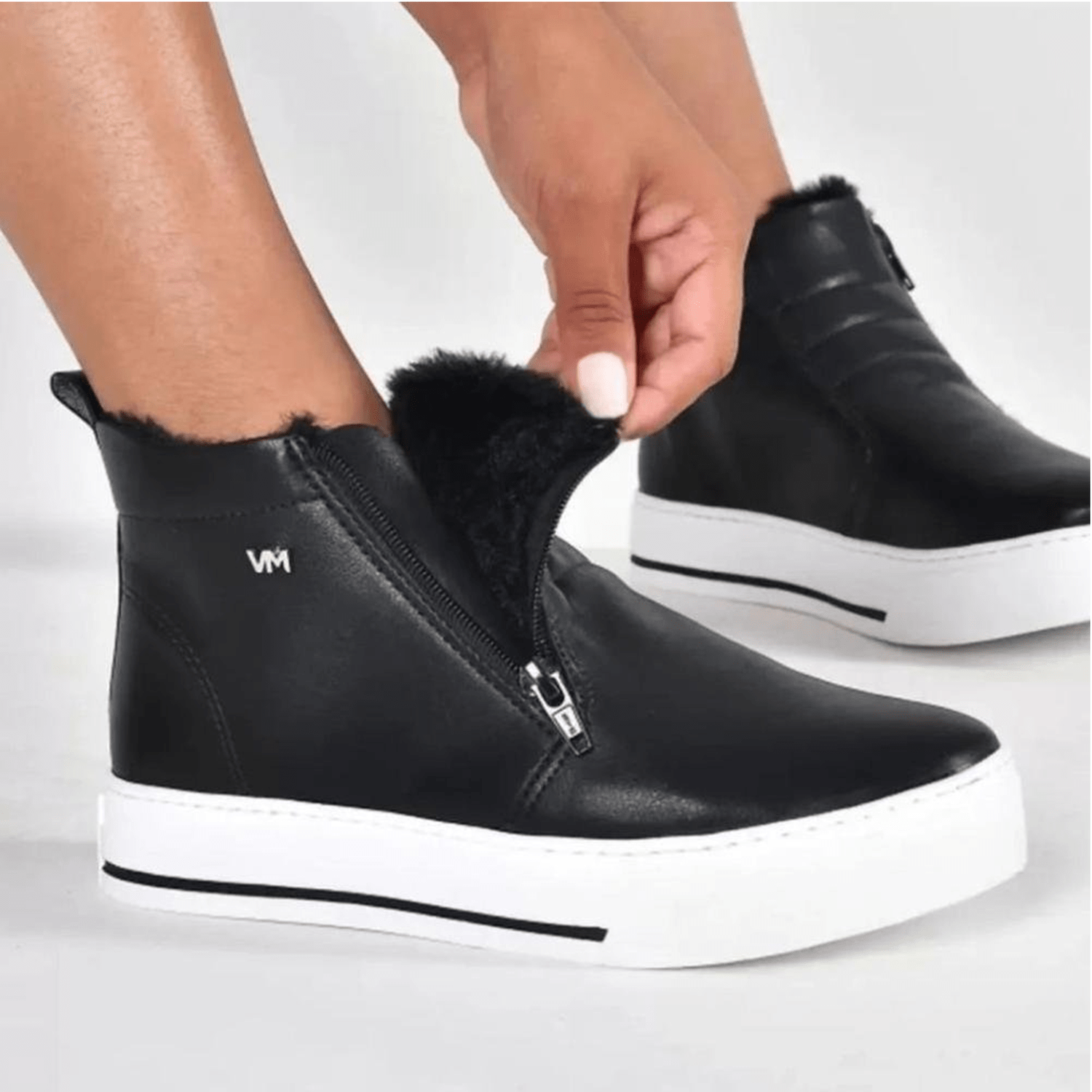 Detalhes do modelo: Solado flatform, zíper lateral facilita o calce, forro em pelo sintético