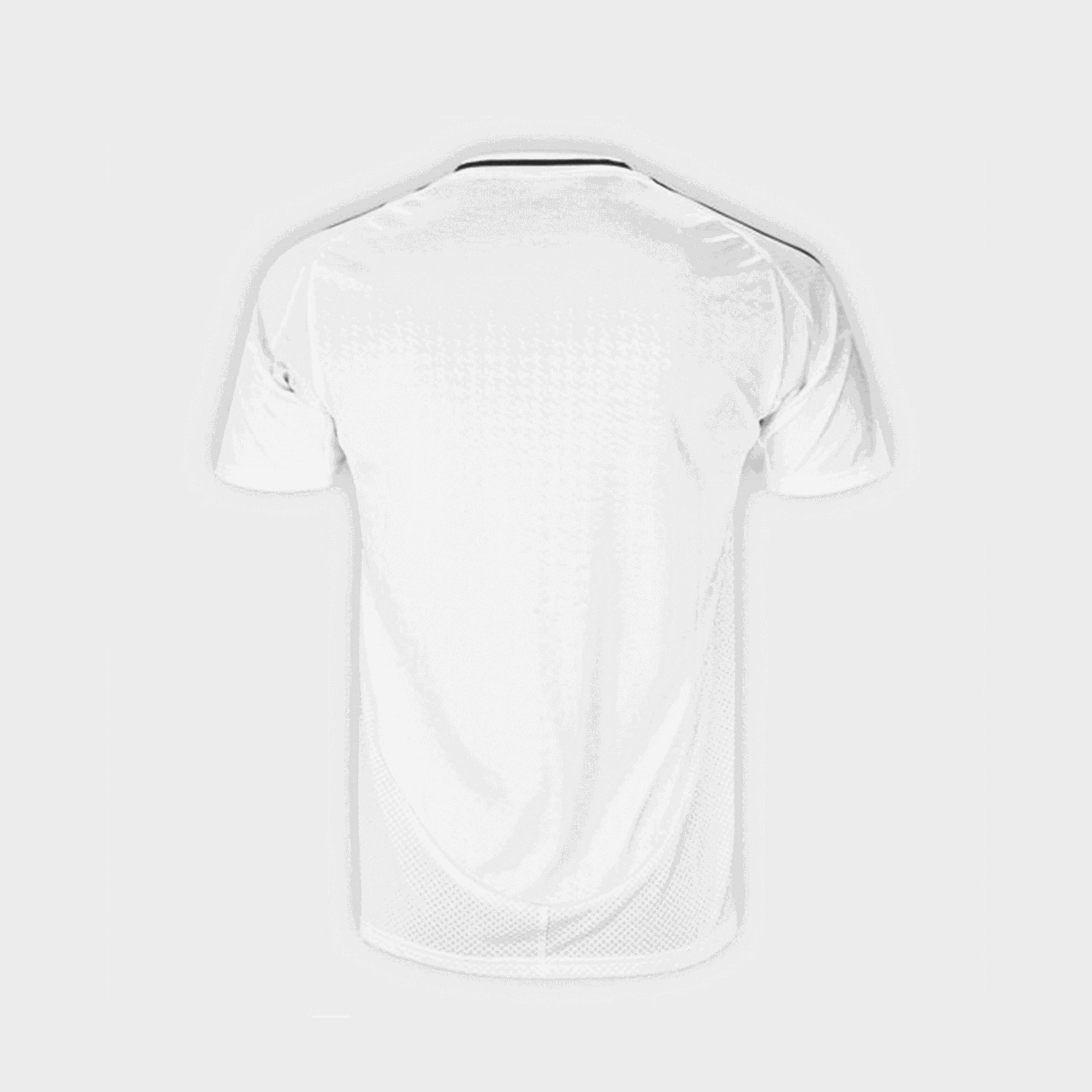 Utilizada como manto titular para os jogos no Santiago Bernabéu, essa camisa do Real Madrid é predominantemente branca com gola em V e listras laterais em preto nas mangas.