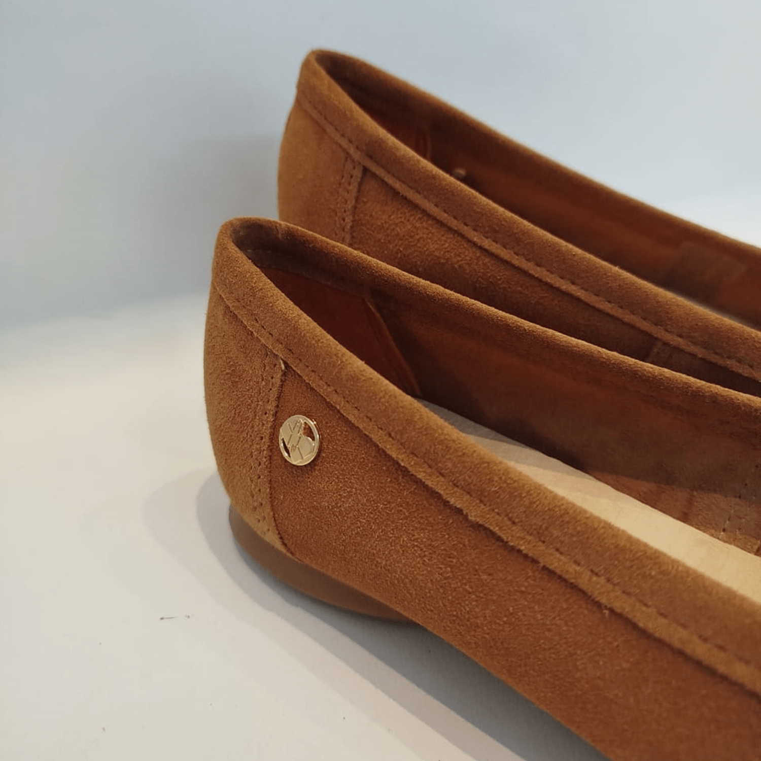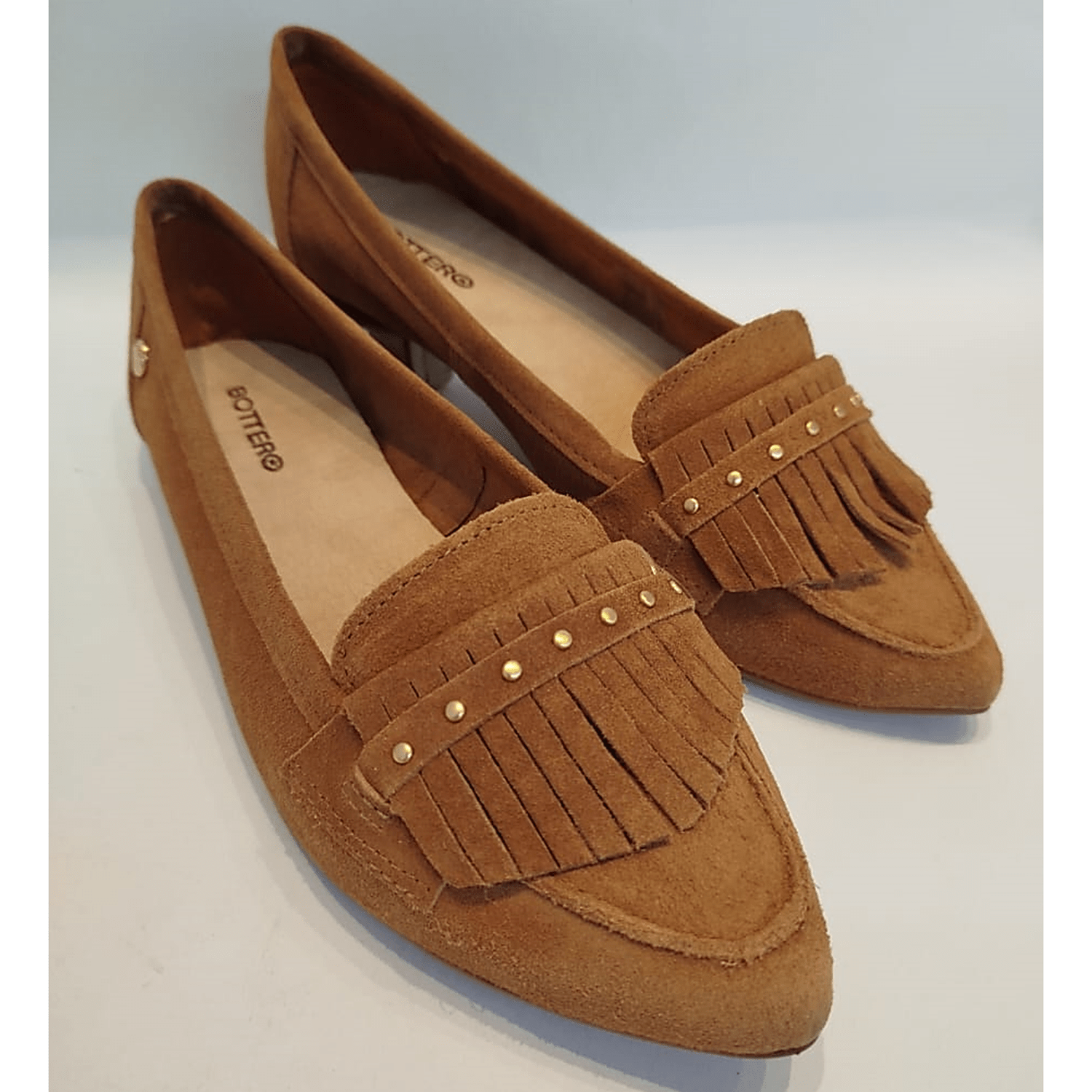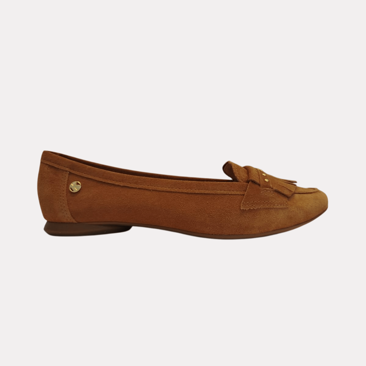 - Detalhes do modelo: Sapato feminino de couro camurça, bico fino e solado emborrachado. Possui detalhe de franjas e aplicação de metais dourados.