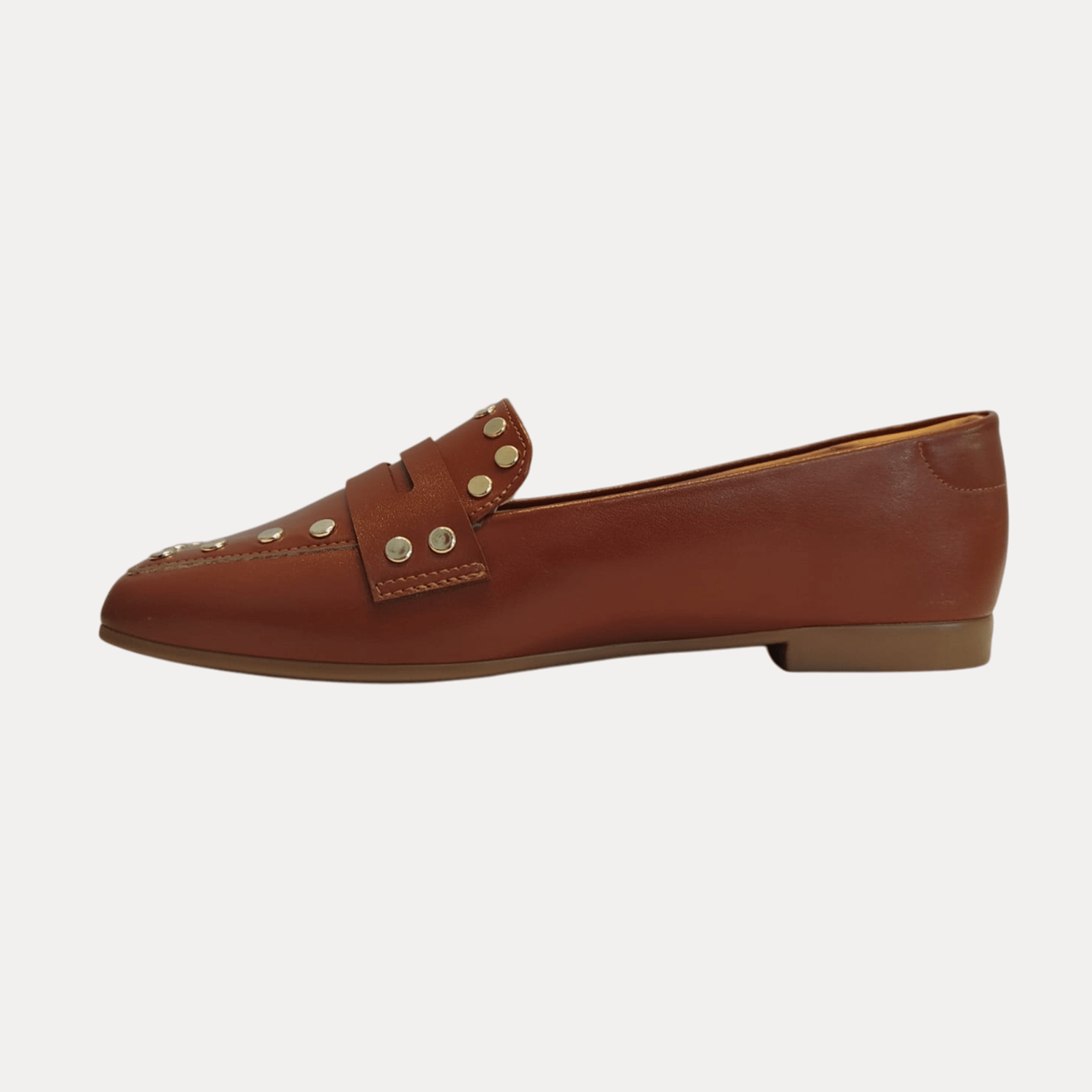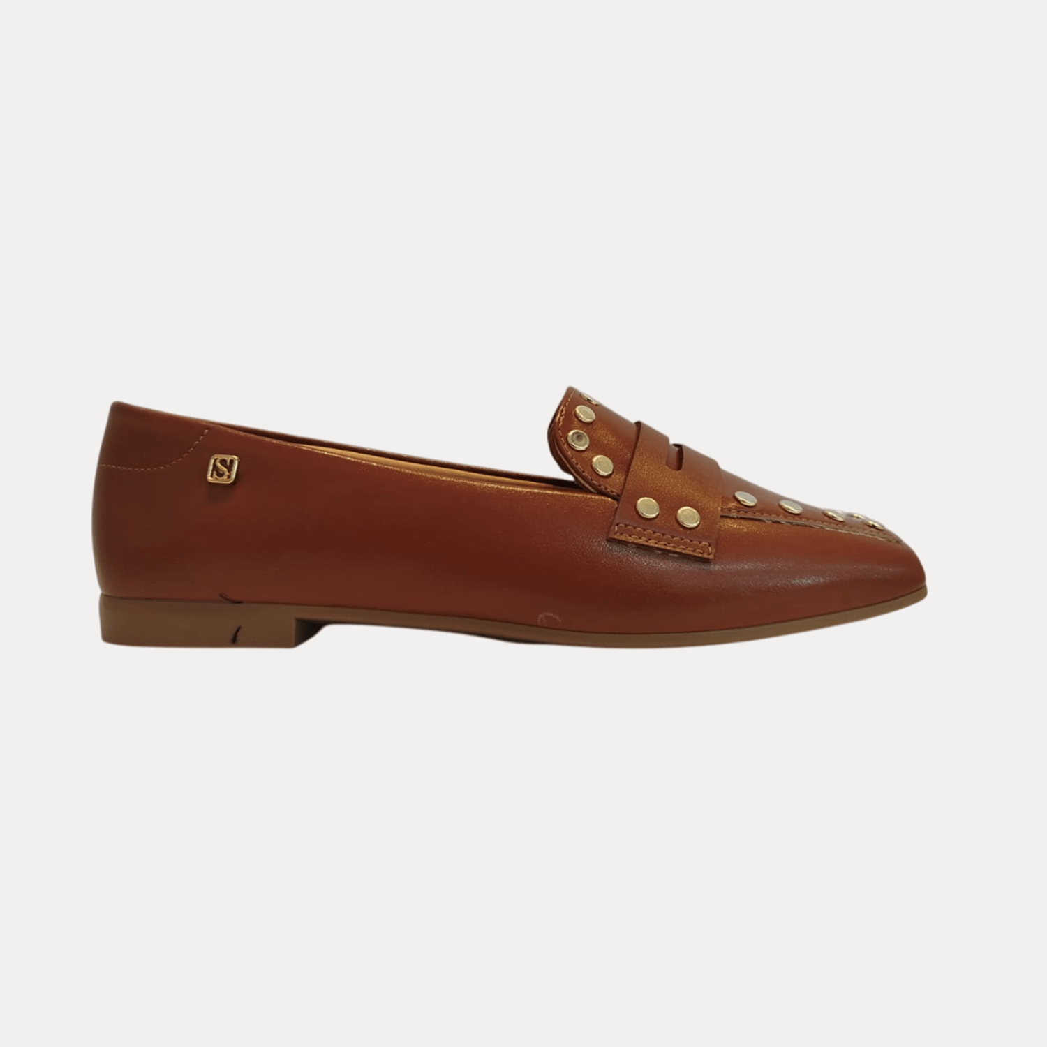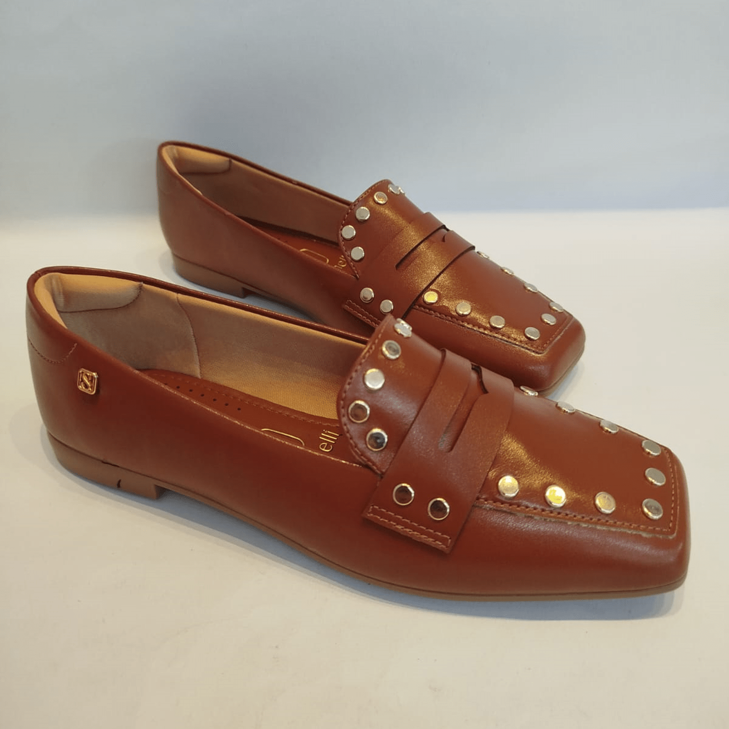 - Detalhes do modelo: Mocassim feminino com bico quadrado, com detalhes em tachas metálicas ao longo das laterais e na parte frontal. Sapatos versáteis que podem ser usados tanto em ocasiões casuais quanto em ambientes de trabalho menos formais.