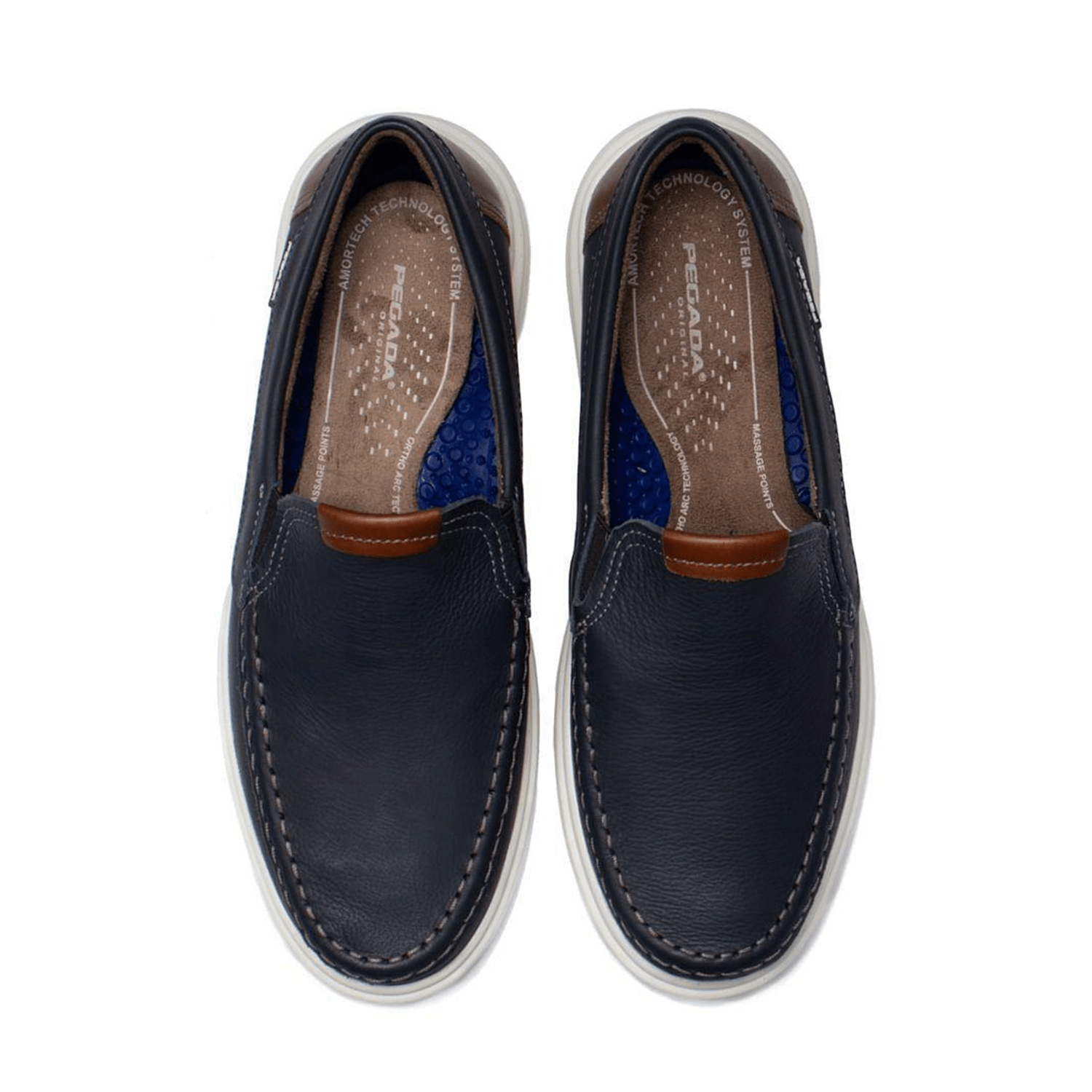- Detalhes do modelo: Mocassim Pegada linha Navale, em couro, com tecnologia AMORTECH BLUE MEMORY FOAM, que é uma palmilha macia com um amortecedor na região do calcanhar que se adapta aos contornos dos pés e volta ao formato original, material que garante ainda menos impactos na pisada. Solado leve e flexível.