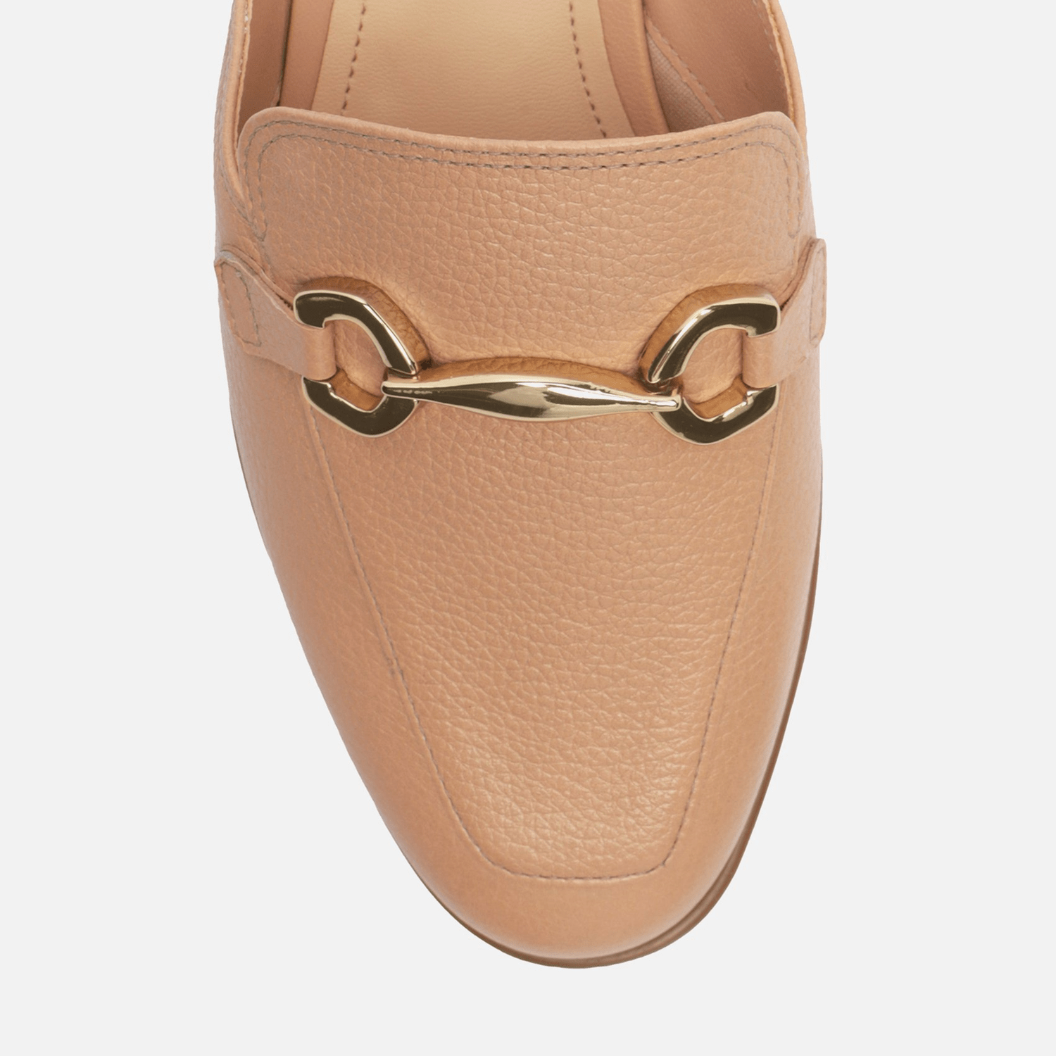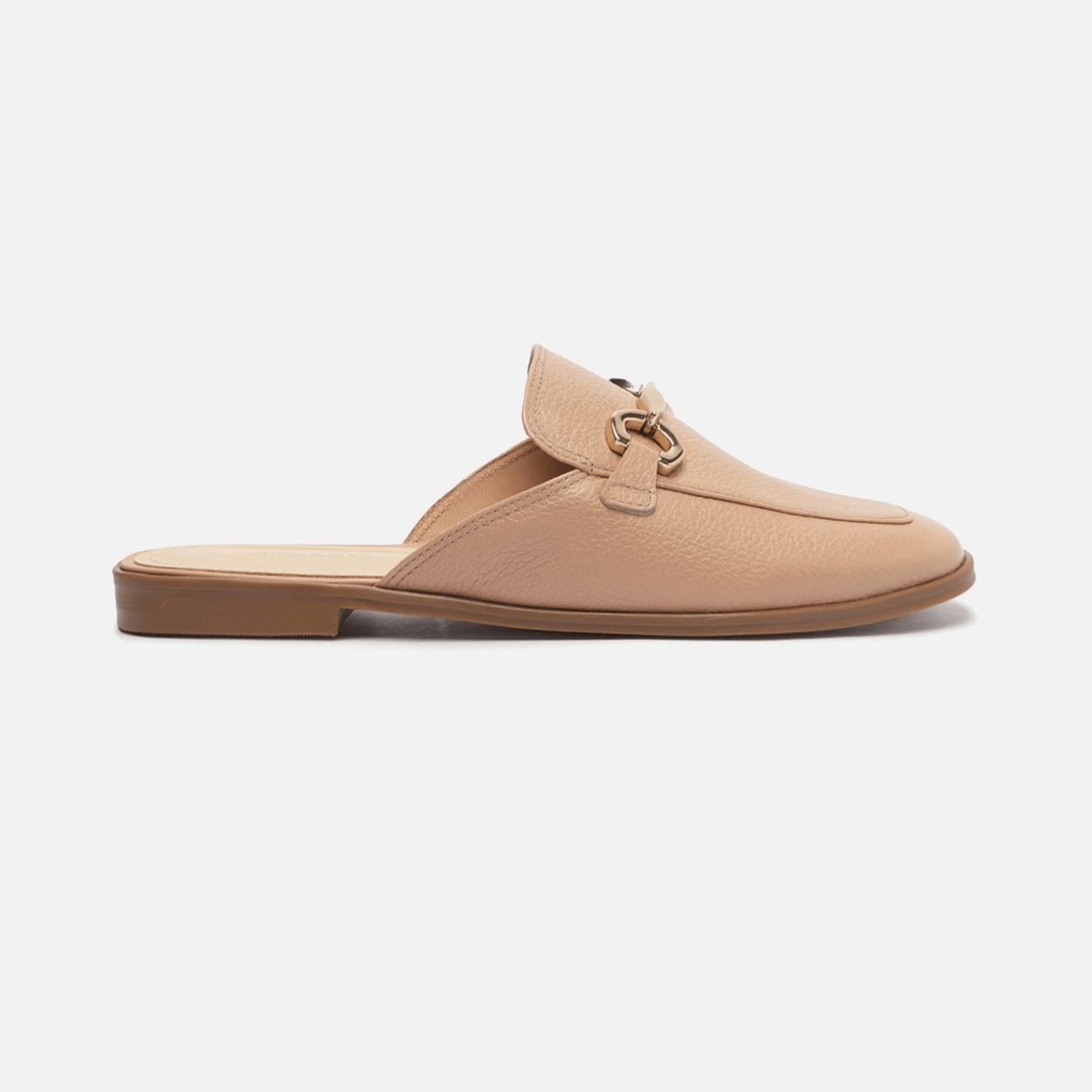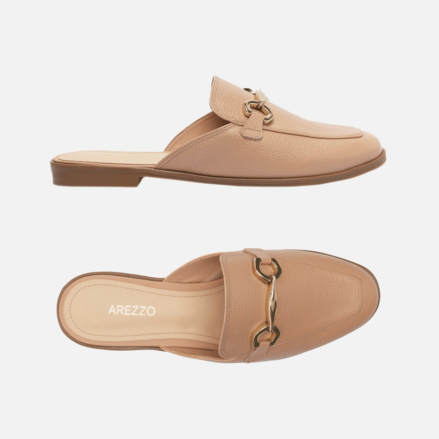 - Detalhes do modelo: Mule salto rasteiro, base emborrachada e bico redondo. Fechada, traz recorte lateral na gáspea e aplicação de bridão metálico dourado, preso por tiras, sobre o cabedal. Possui costura bombada no contorno da biqueira. Com palmilha bege e inscrição do nome da marca, exibe todo o peito do pé e o calcanhar.