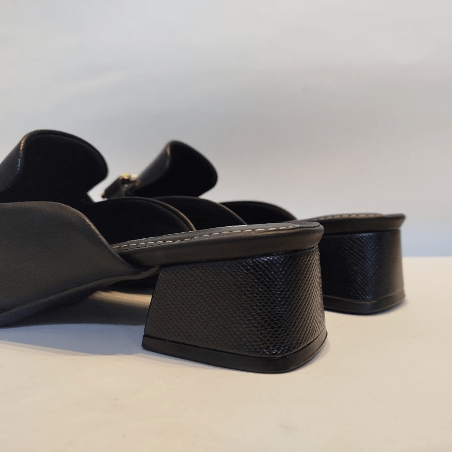 - Detalhes do modelo: Sapato estilo mule fechado na parte da frente, com a ponta redonda, e aberto na parte de trás, sem calcanhar, com salto.