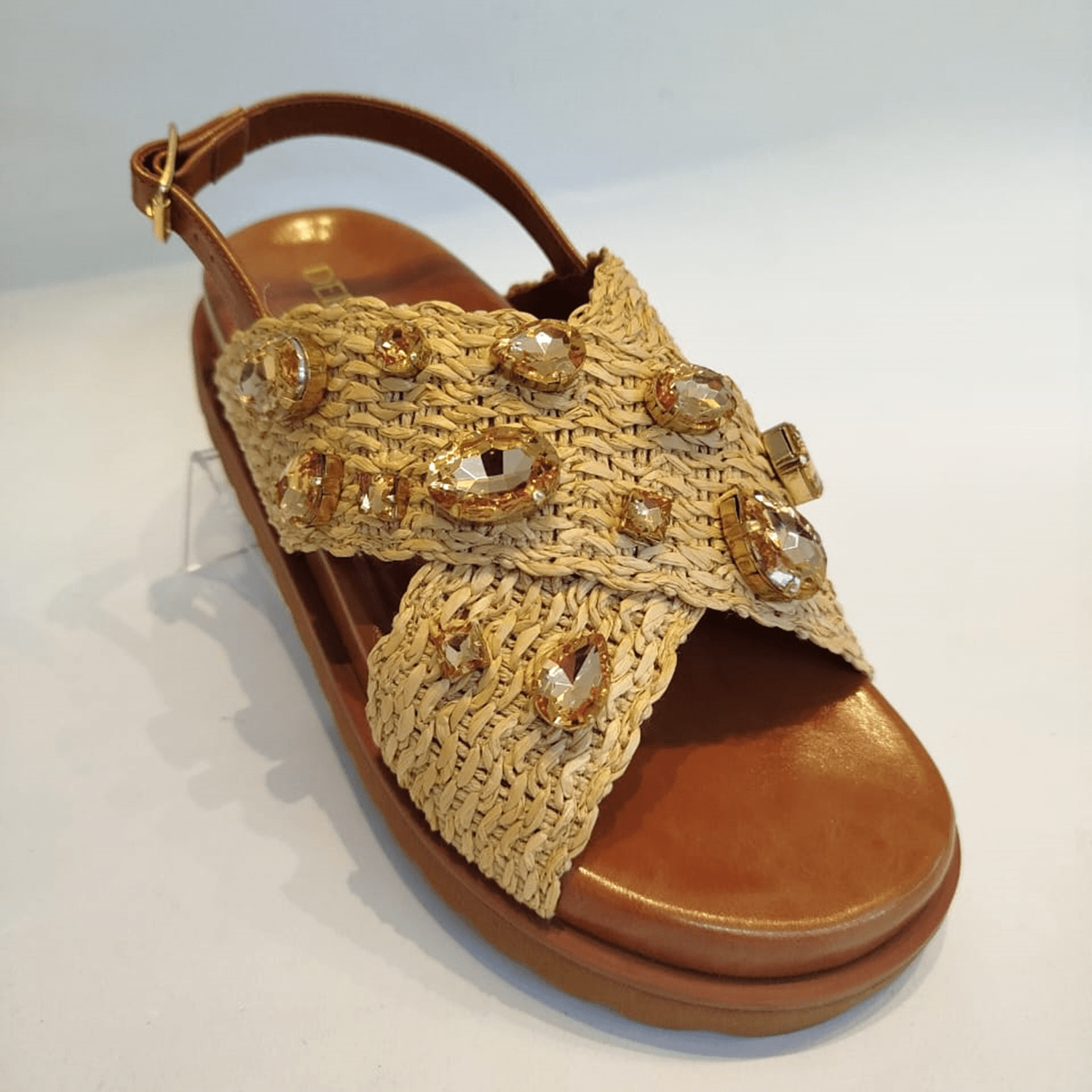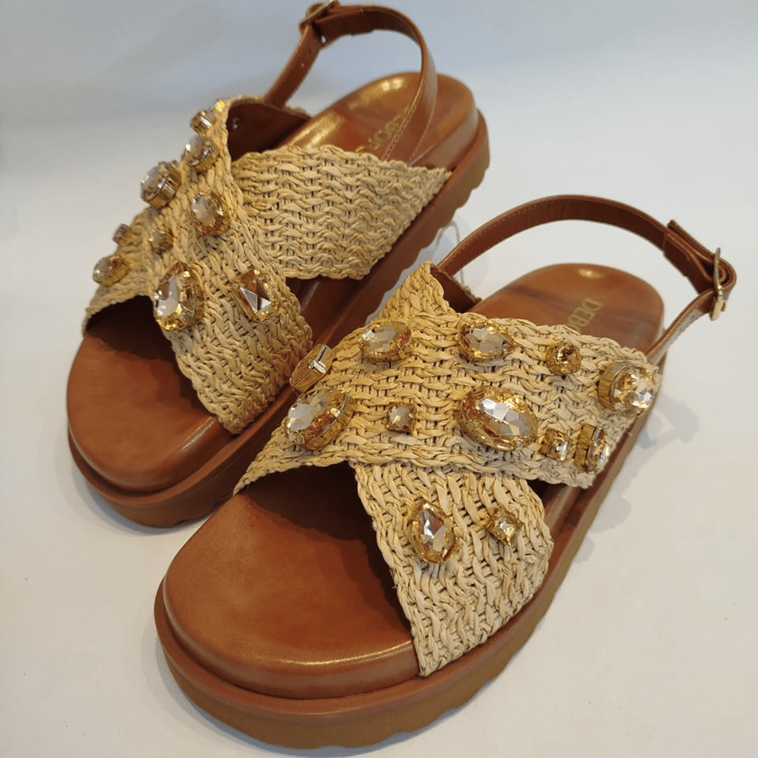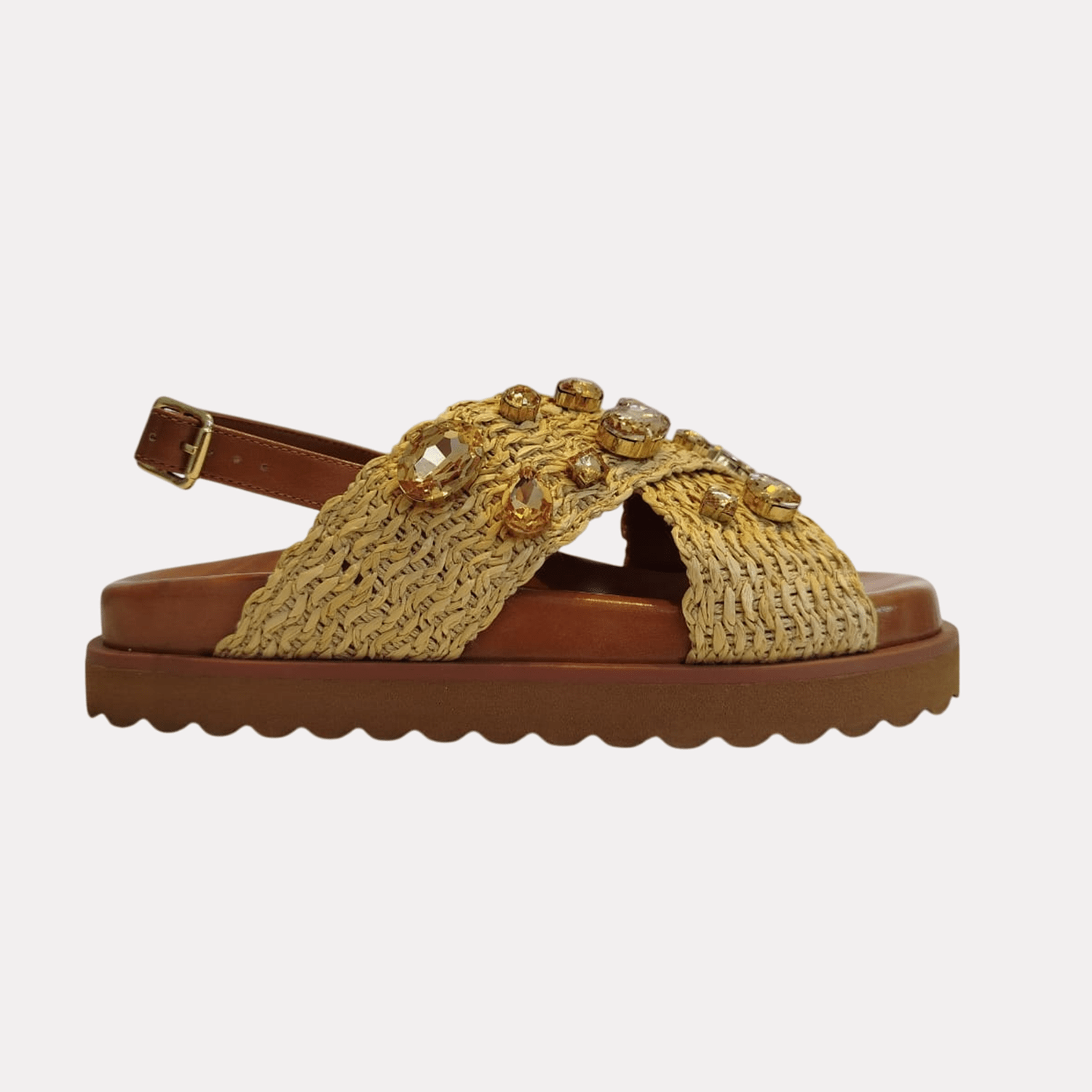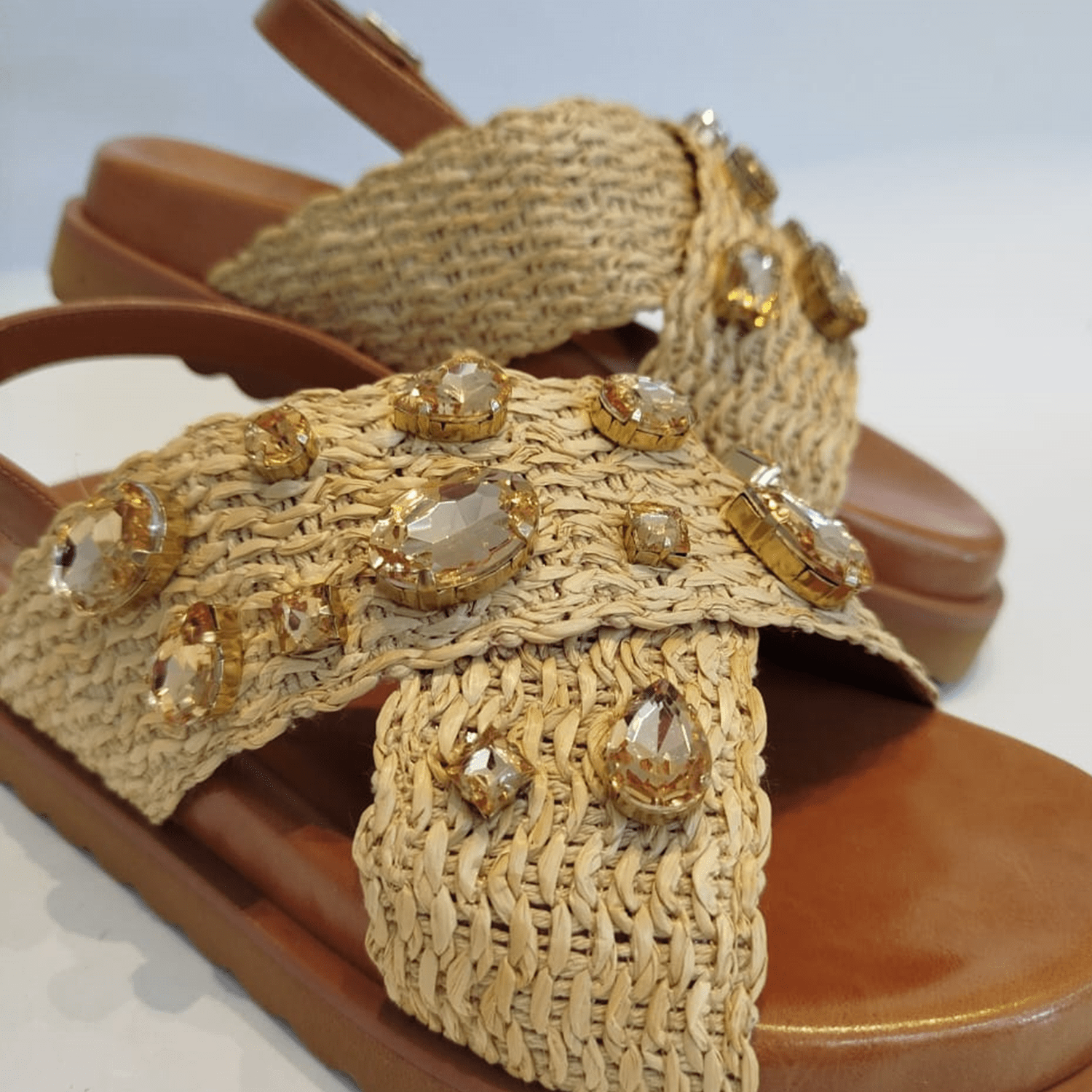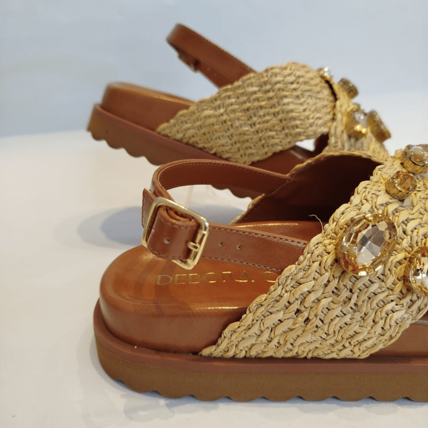 O detalhe de aplicação de pedrarias eleva o calçado, tornando-o adequado para ocasiões que vão além do uso estritamente casual de praia.