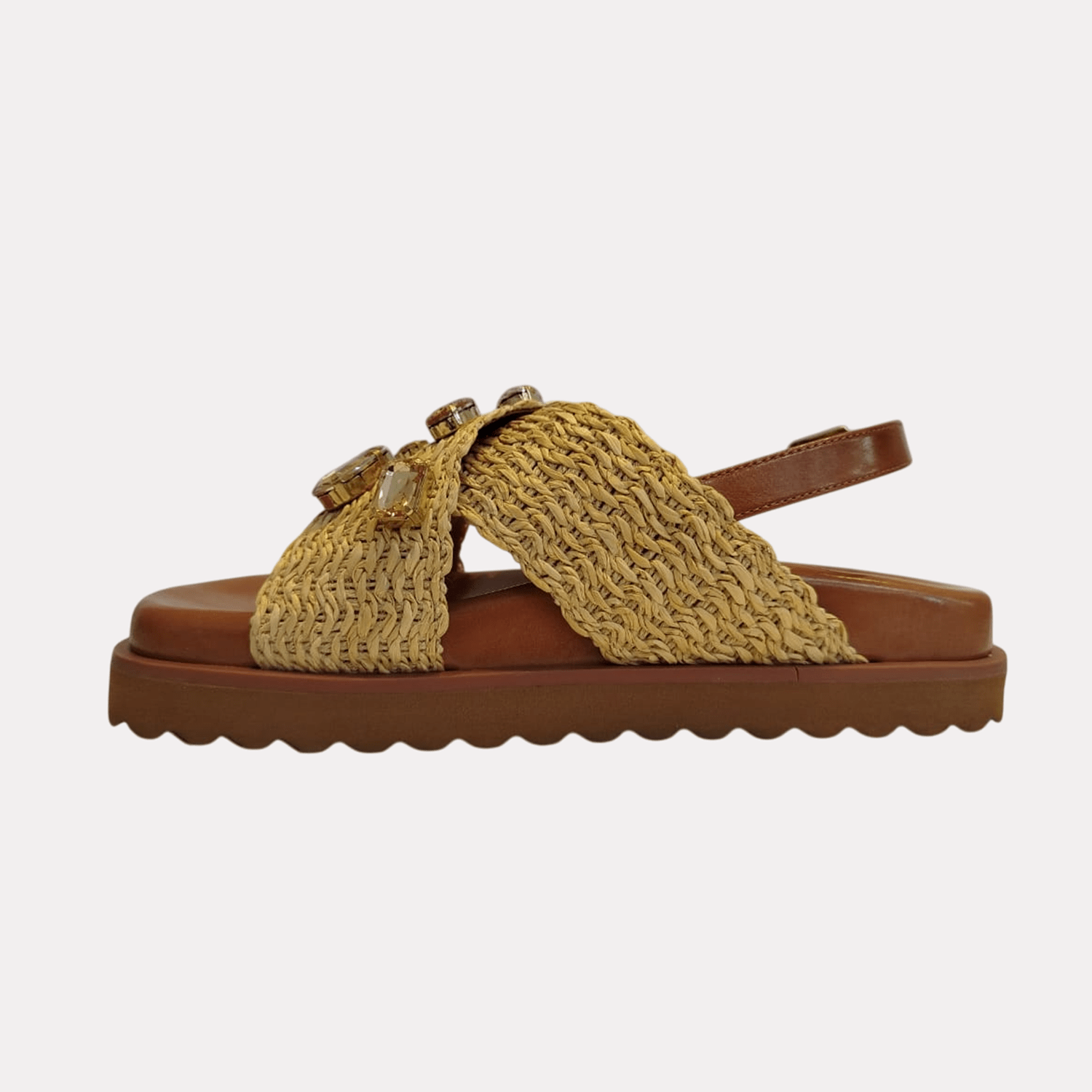 Sandália Papete feminina que harmoniza elementos rústicos e sofisticados, resultando em uma peça de estilo casual chic. O grande destaque é o cabedal, formado por uma tira larga que cruza o peito do pé. Esta tira é confeccionada em um material de palha trançada na cor natural, conferindo uma textura artesanal e um toque boho característico.