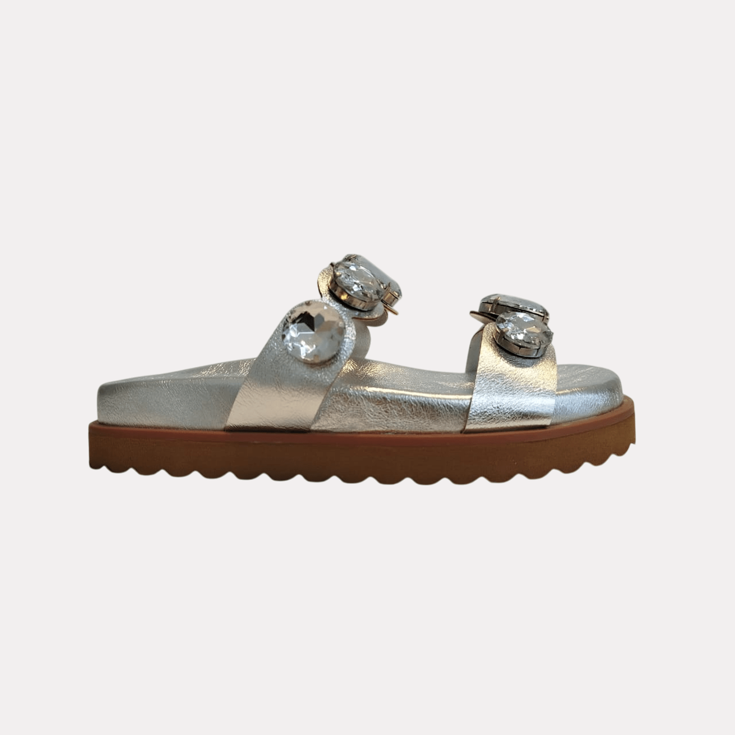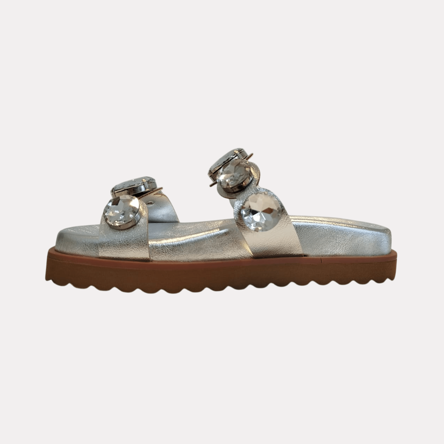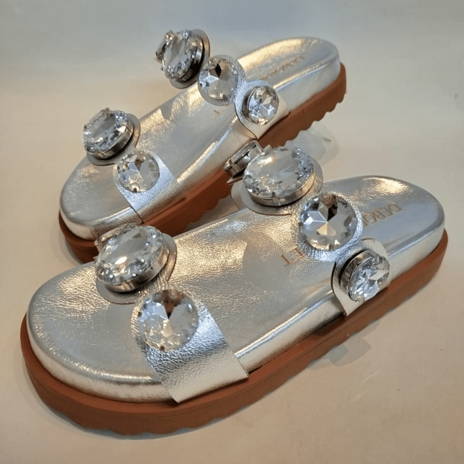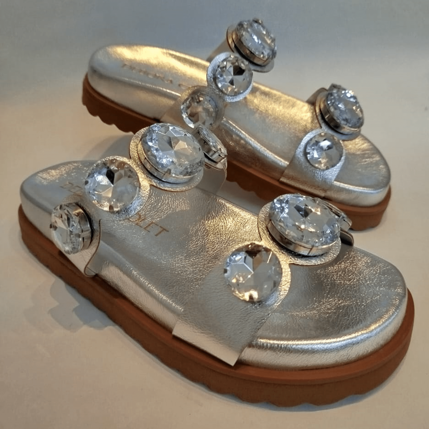 Sandália Flatform Papete Prata com duas tiras largas na parte superior, com detalhes de aplique de pedrarias, dando um toque de brilho e glamour ao calçado. O solado tem formato anatômico, com a parte inferior de borracha tornando-o confortável e estiloso.