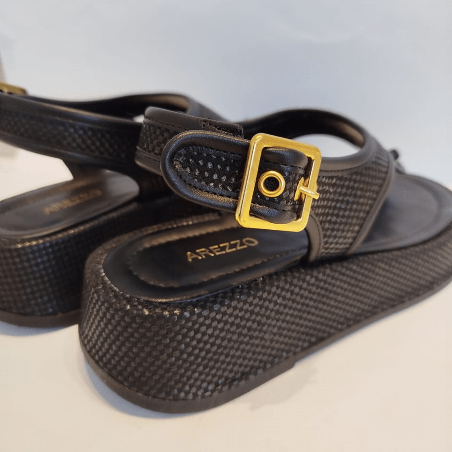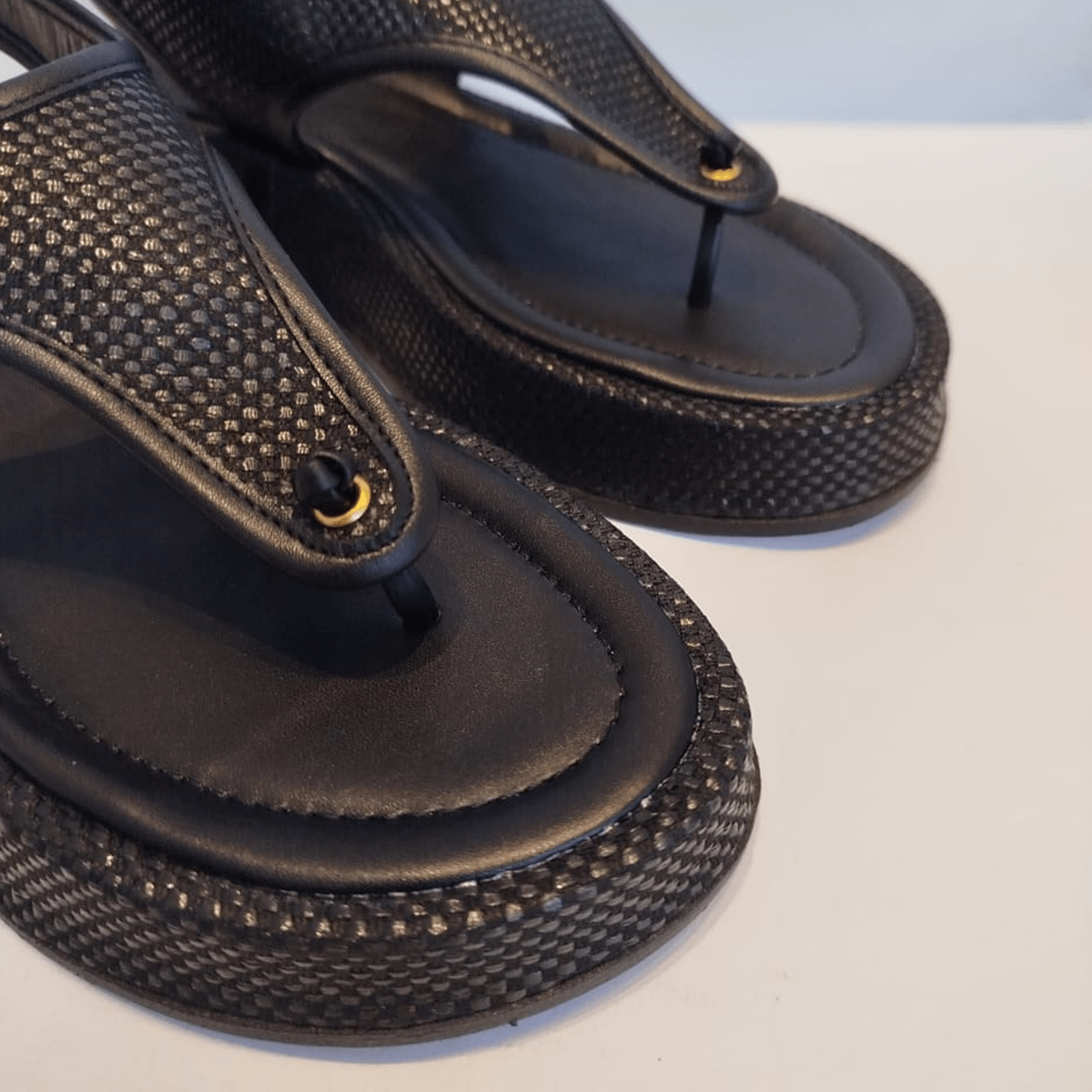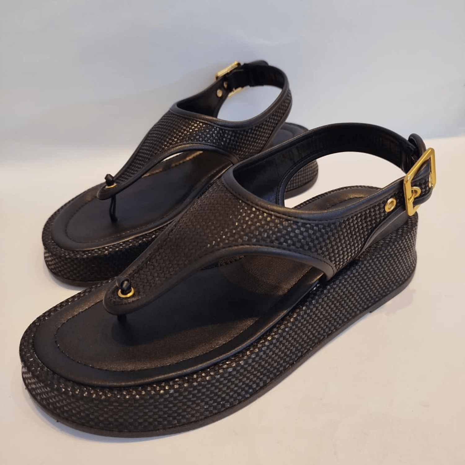 - Detalhes do modelo: Sandália com uma tira que passa entre o dedão e o segundo dedo, com uma tira traseira que prende no calcanhar, ajustável com uma fivela dourada. A sola é uma plataforma robusta com a mesma textura de palha do cabedal na parte lateral.