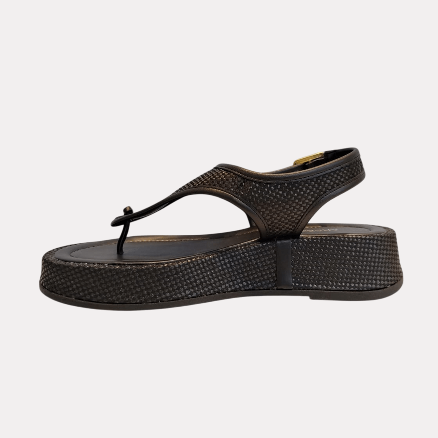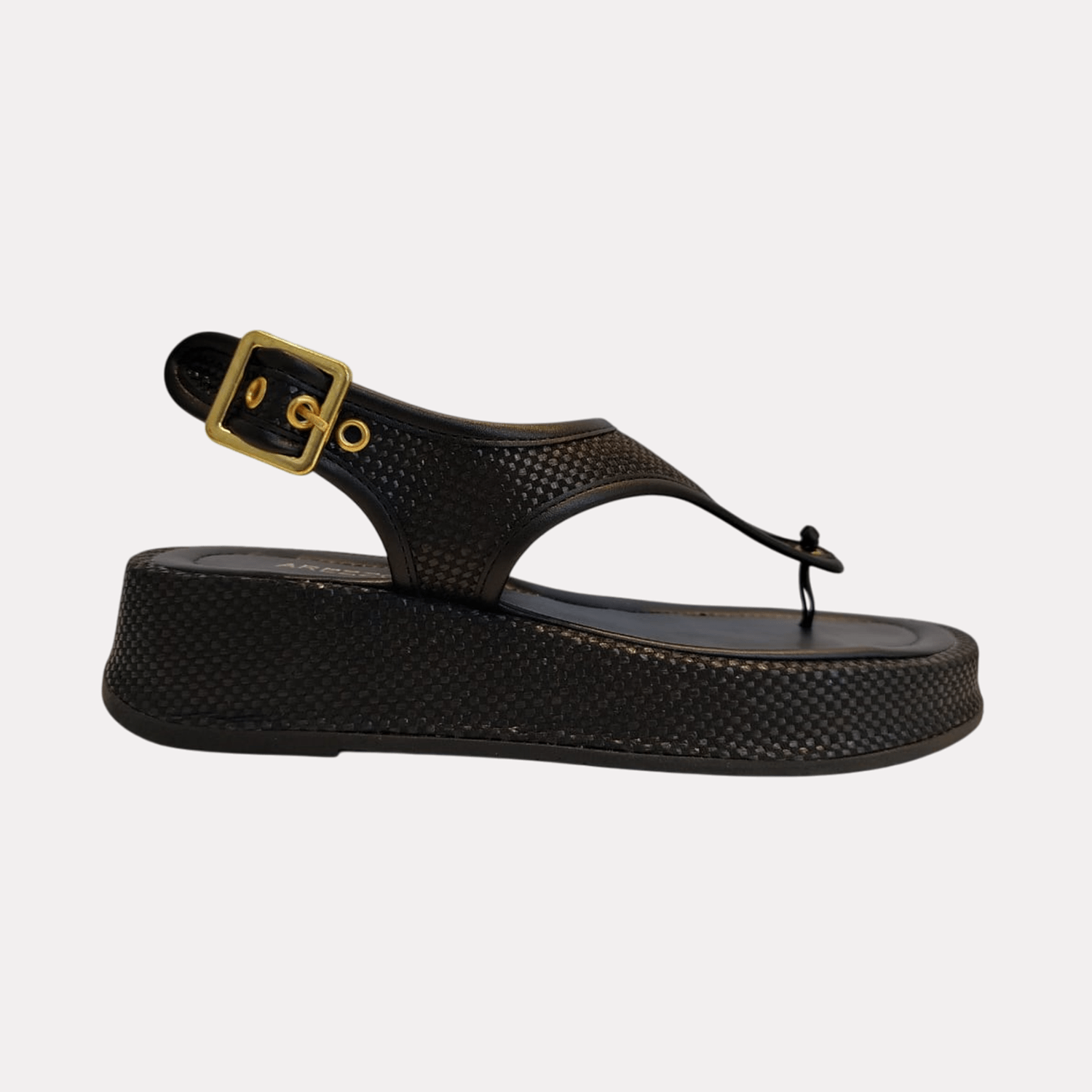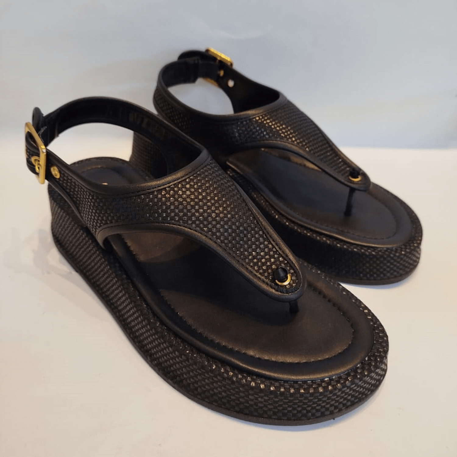 - Detalhes do modelo: Sandália com uma tira que passa entre o dedão e o segundo dedo, com uma tira traseira que prende no calcanhar, ajustável com uma fivela dourada. A sola é uma plataforma robusta com a mesma textura de palha do cabedal na parte lateral.