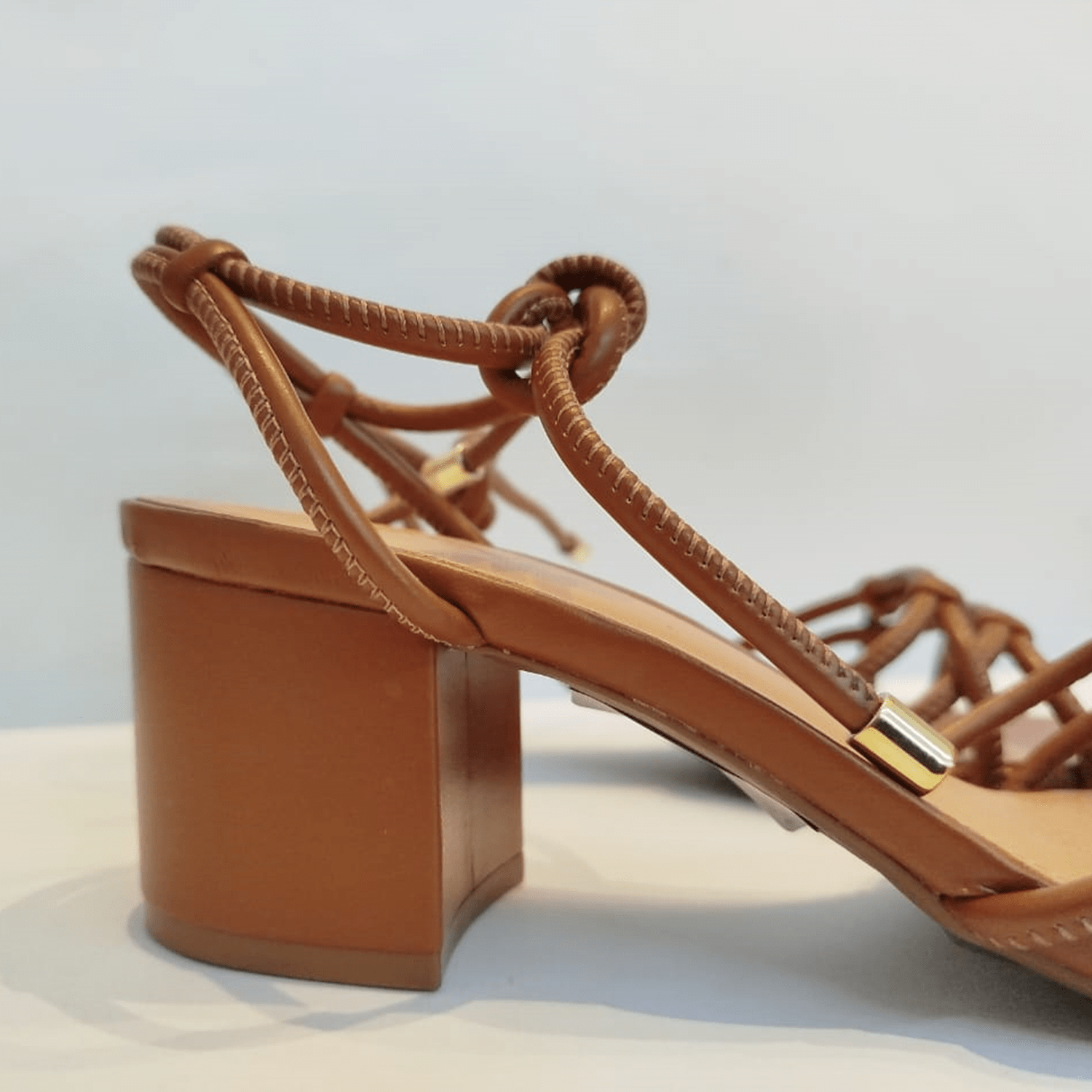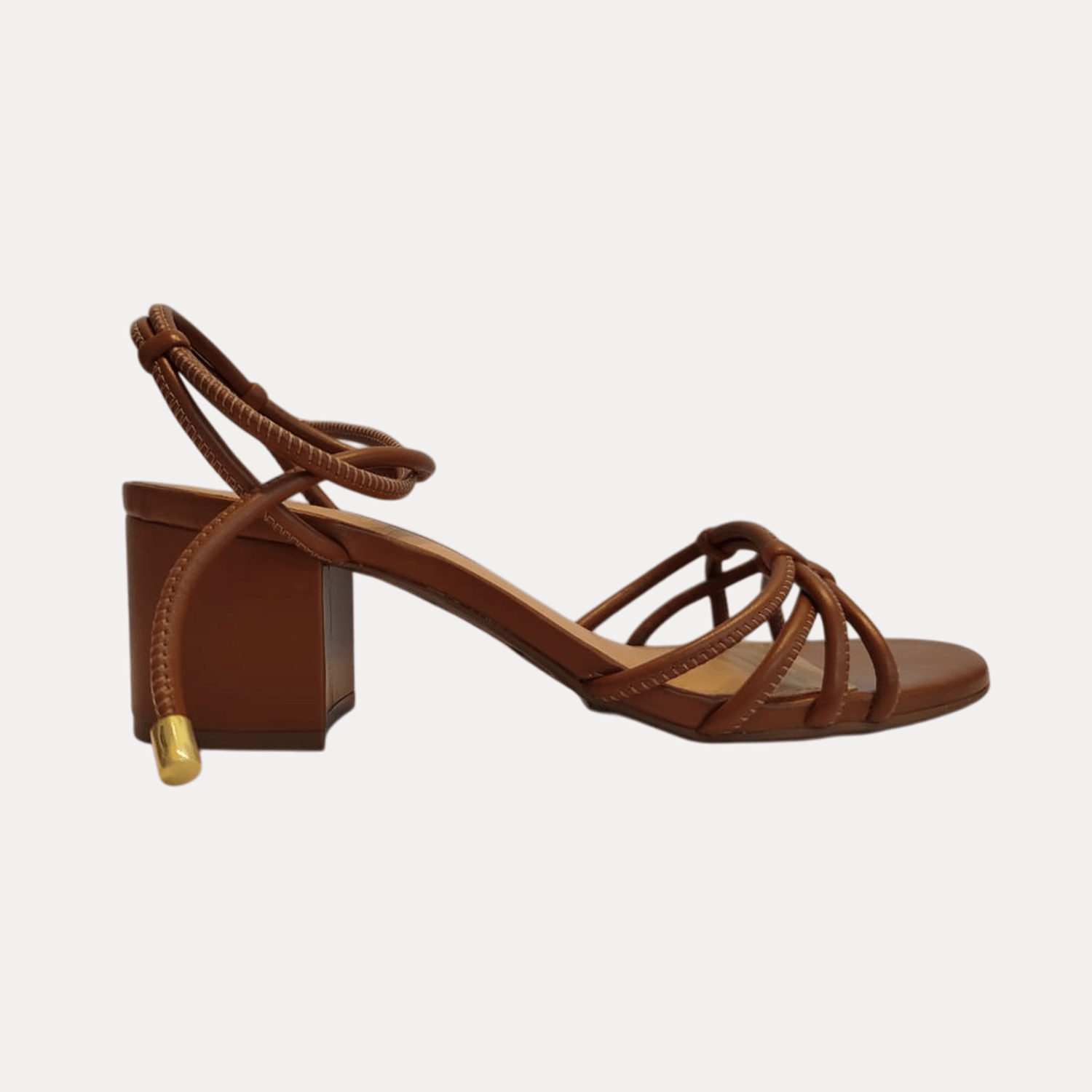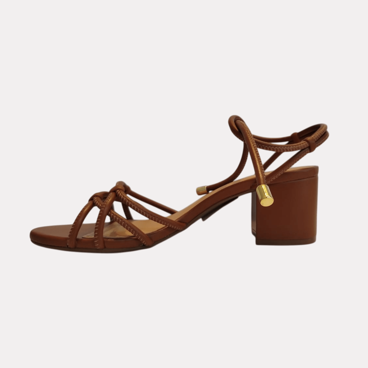 - Detalhes do modelo: Sandália de salto bloco e tiras com costura aparente conectadas a tira no calcanhar, fechando em amarração no tornozelo.
