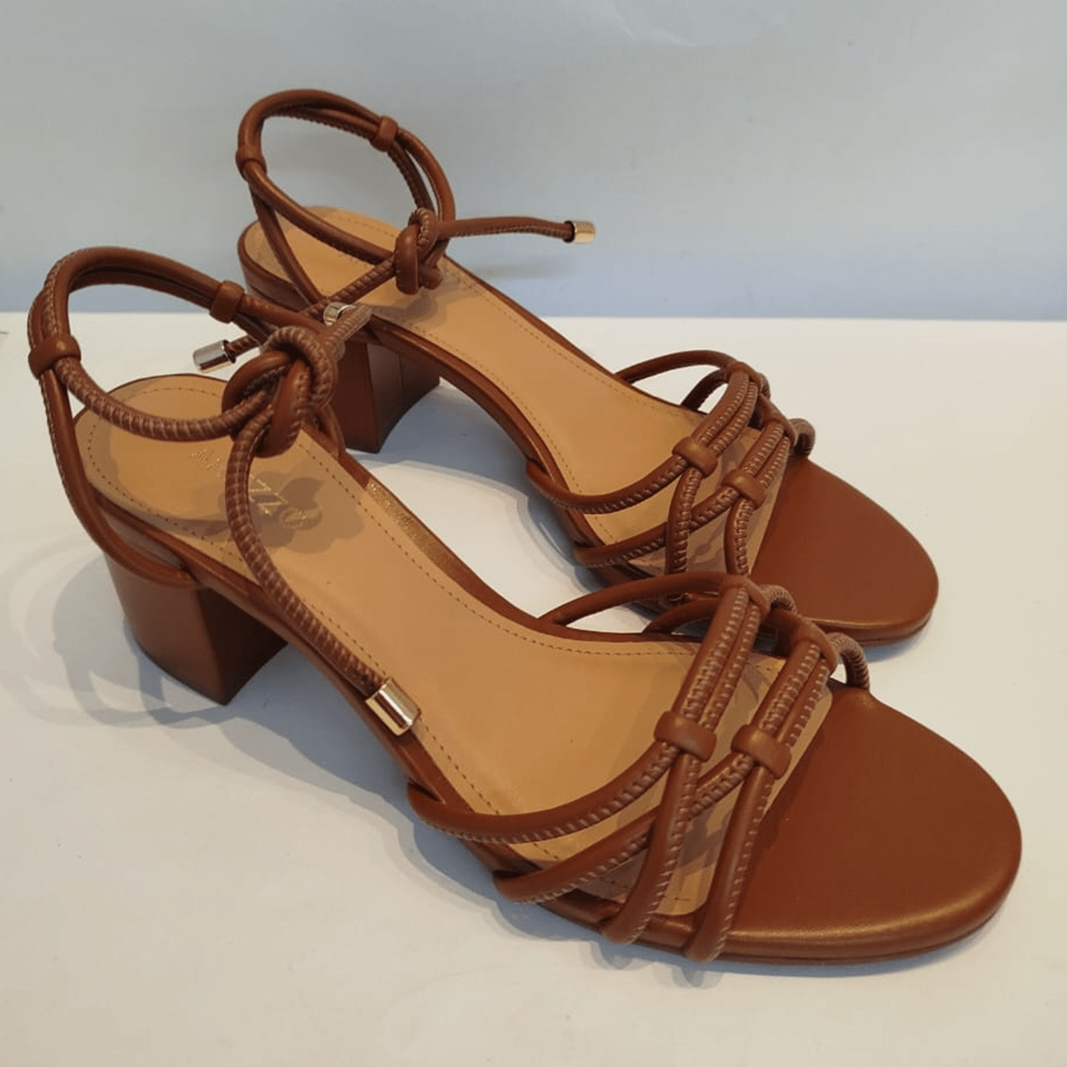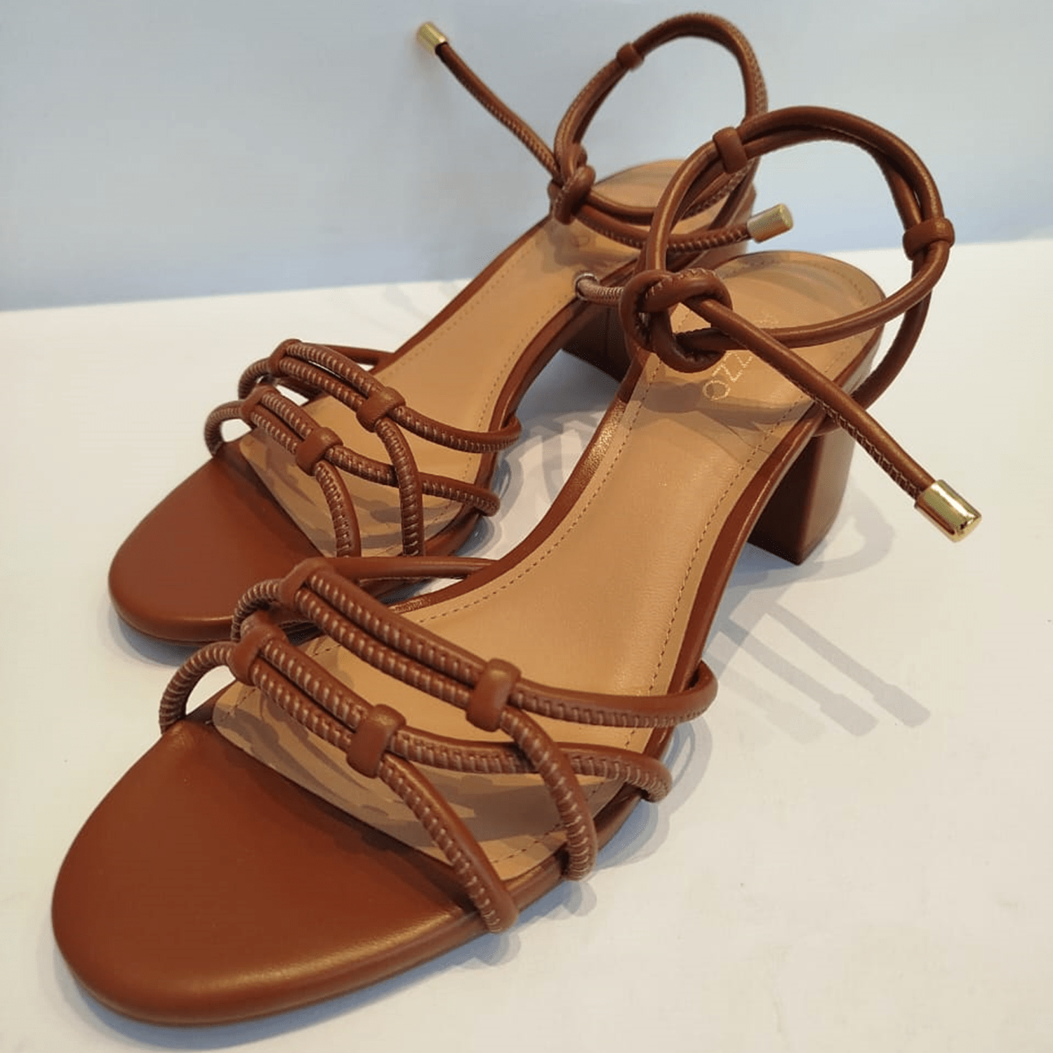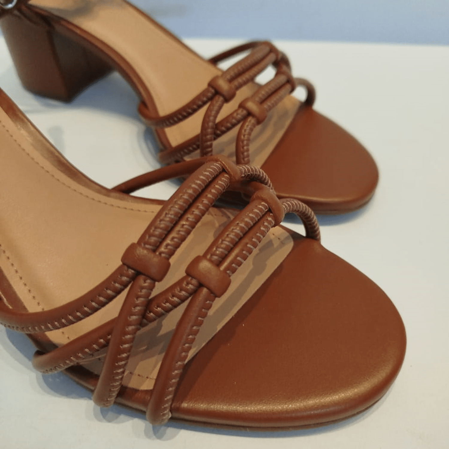 - Detalhes do modelo: Sandália de salto bloco e tiras com costura aparente conectadas a tira no calcanhar, fechando em amarração no tornozelo.