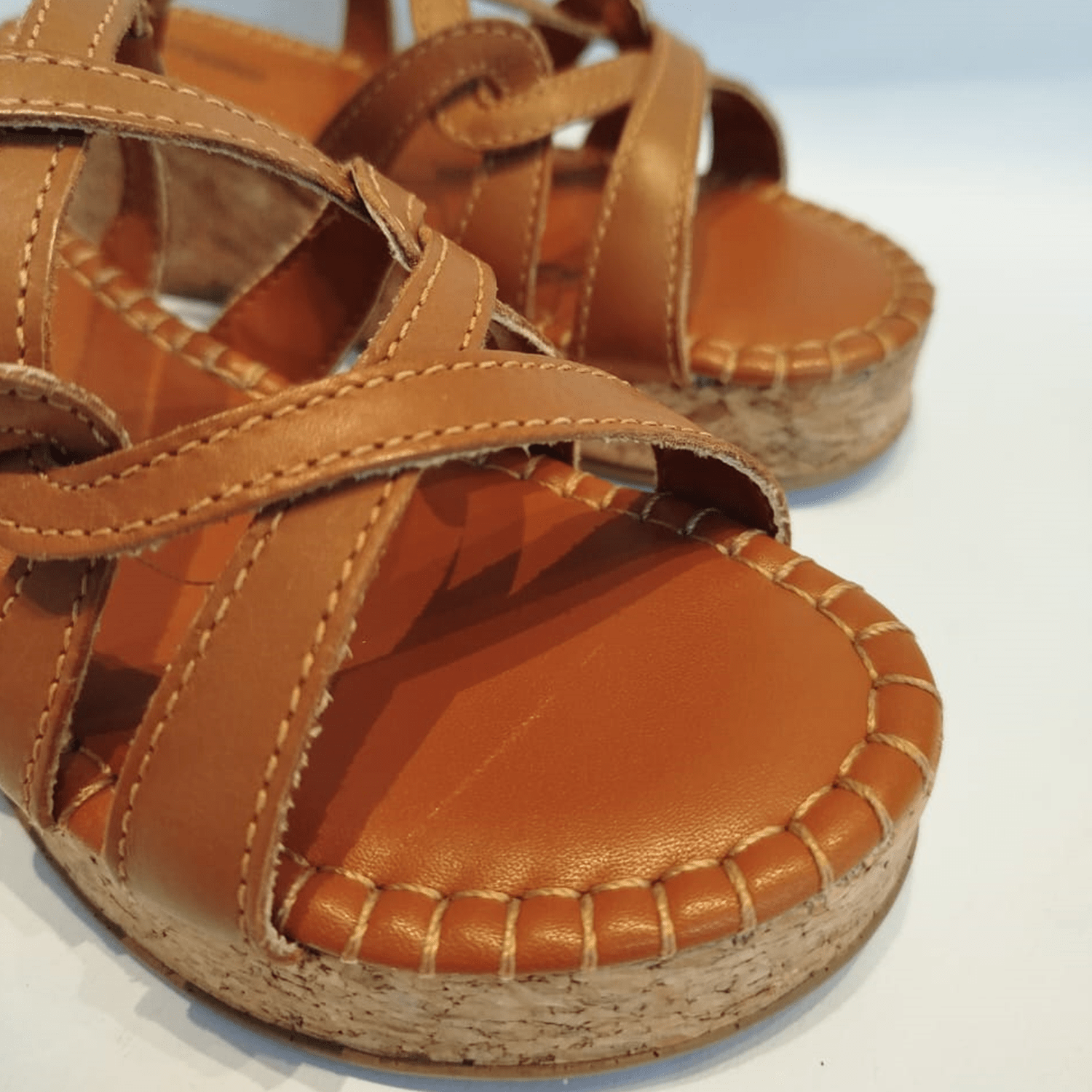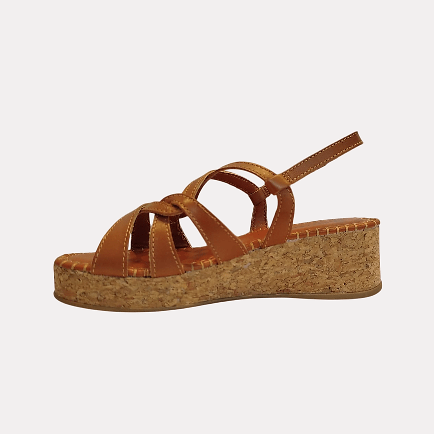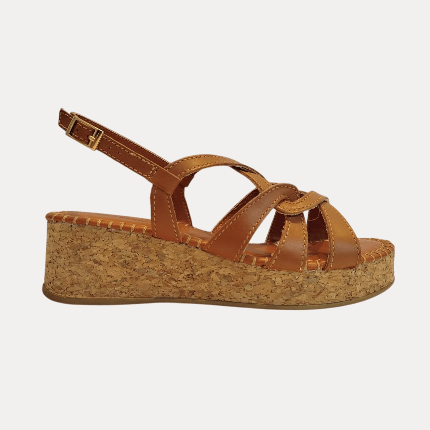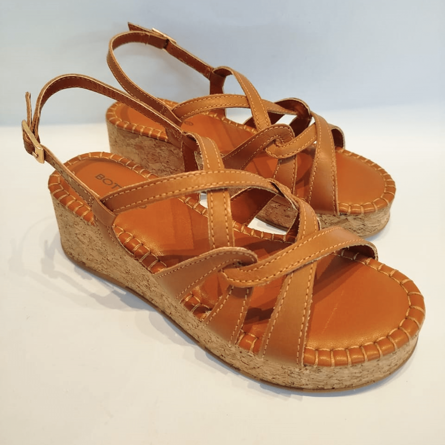 - Detalhes do modelo: Sandália de plataforma na cor nude, design com tiras cruzadas sobre o peito do pé, que se juntam a uma tira no calcanhar com uma fivela ajustável. A plataforma e o salto são do tipo anabela em cortiça. Essa sandália tem um visual confortável e casual, ideal para o uso diário em estações quentes ou para compor looks de verão, combinando com vestidos, saias e calças de tecidos leves.
