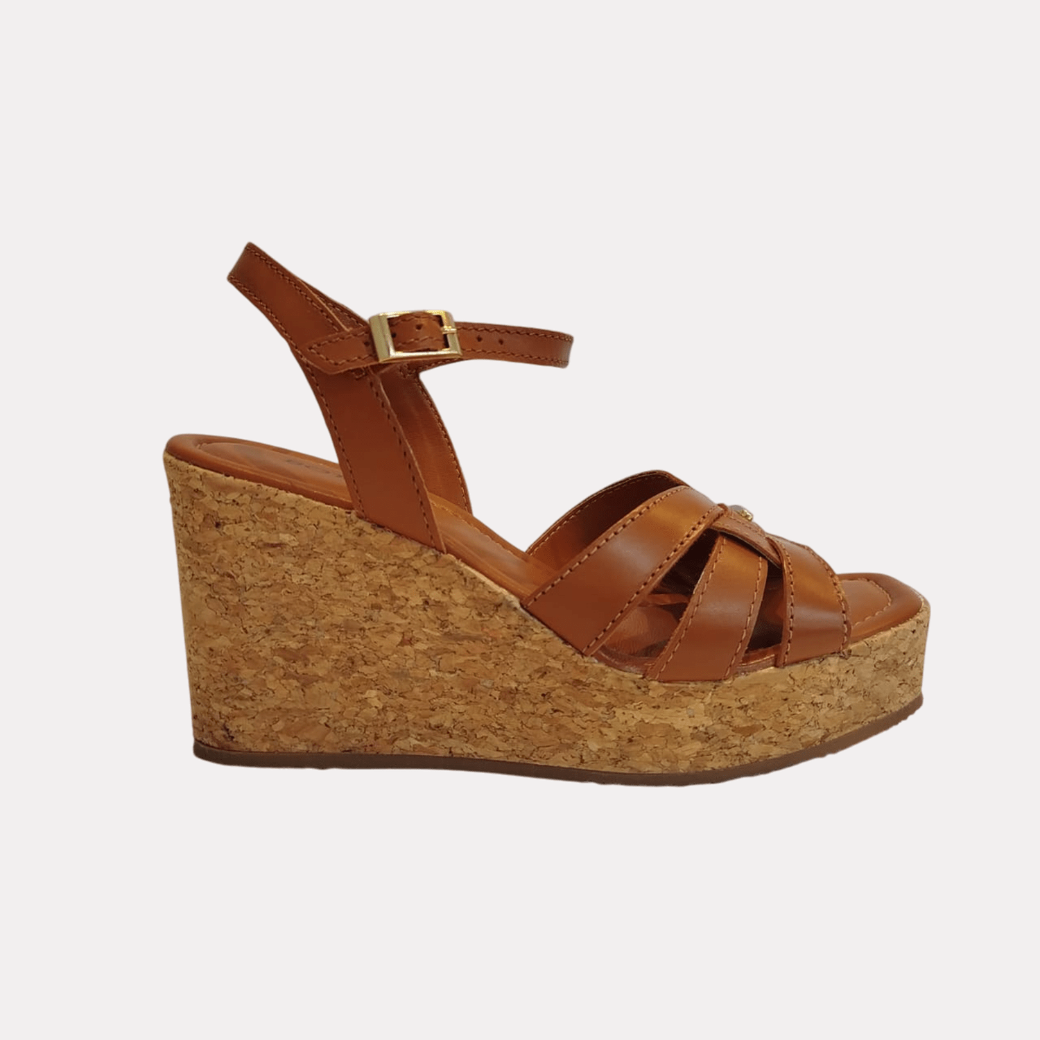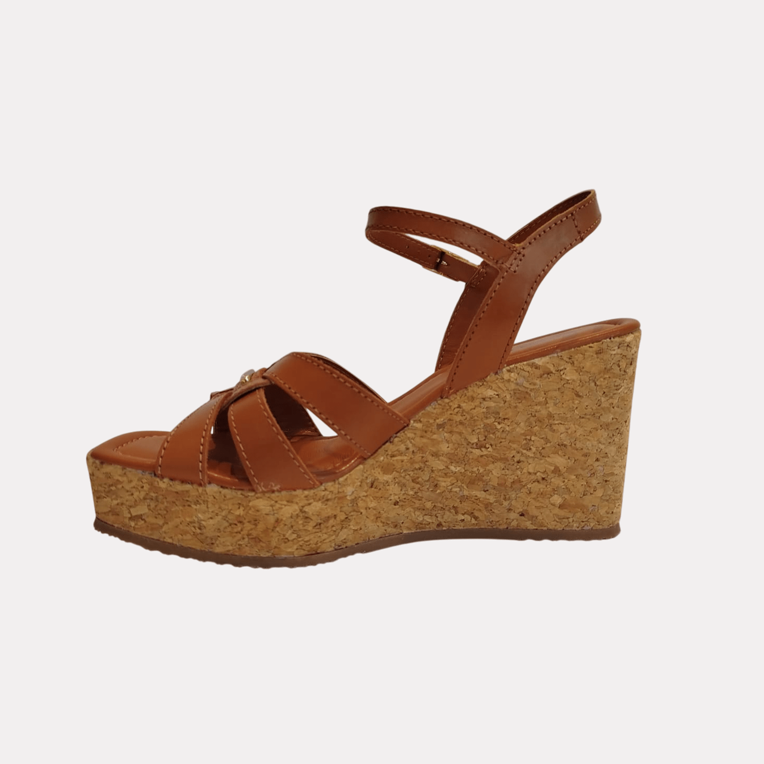 Sandália Feminina anabela revestida de cortiça conferindo um visual rústico e leve com múltiplas tiras cruzadas de couro sobre o peito do pé e uma tira ajustável com fivela dourada na altura do tornozelo para fechamento.