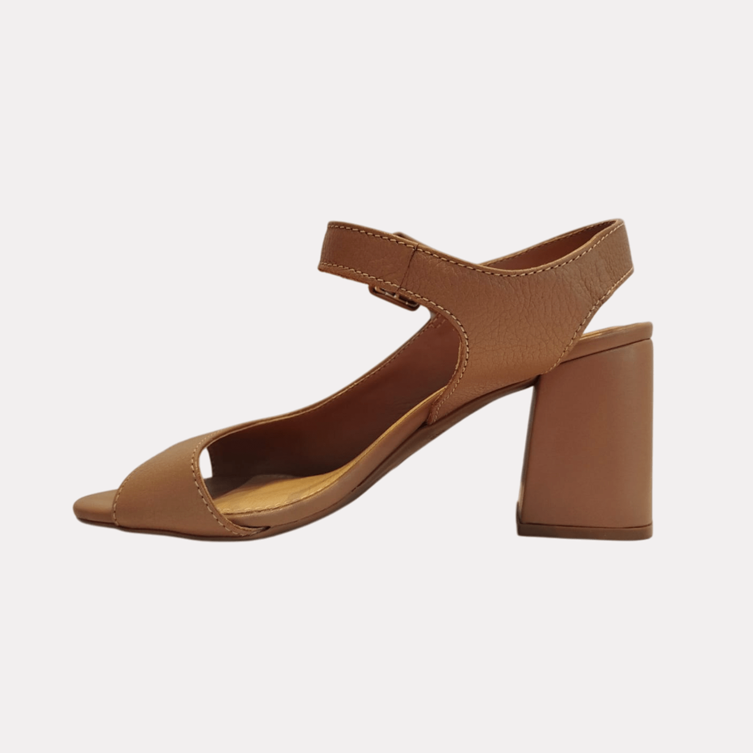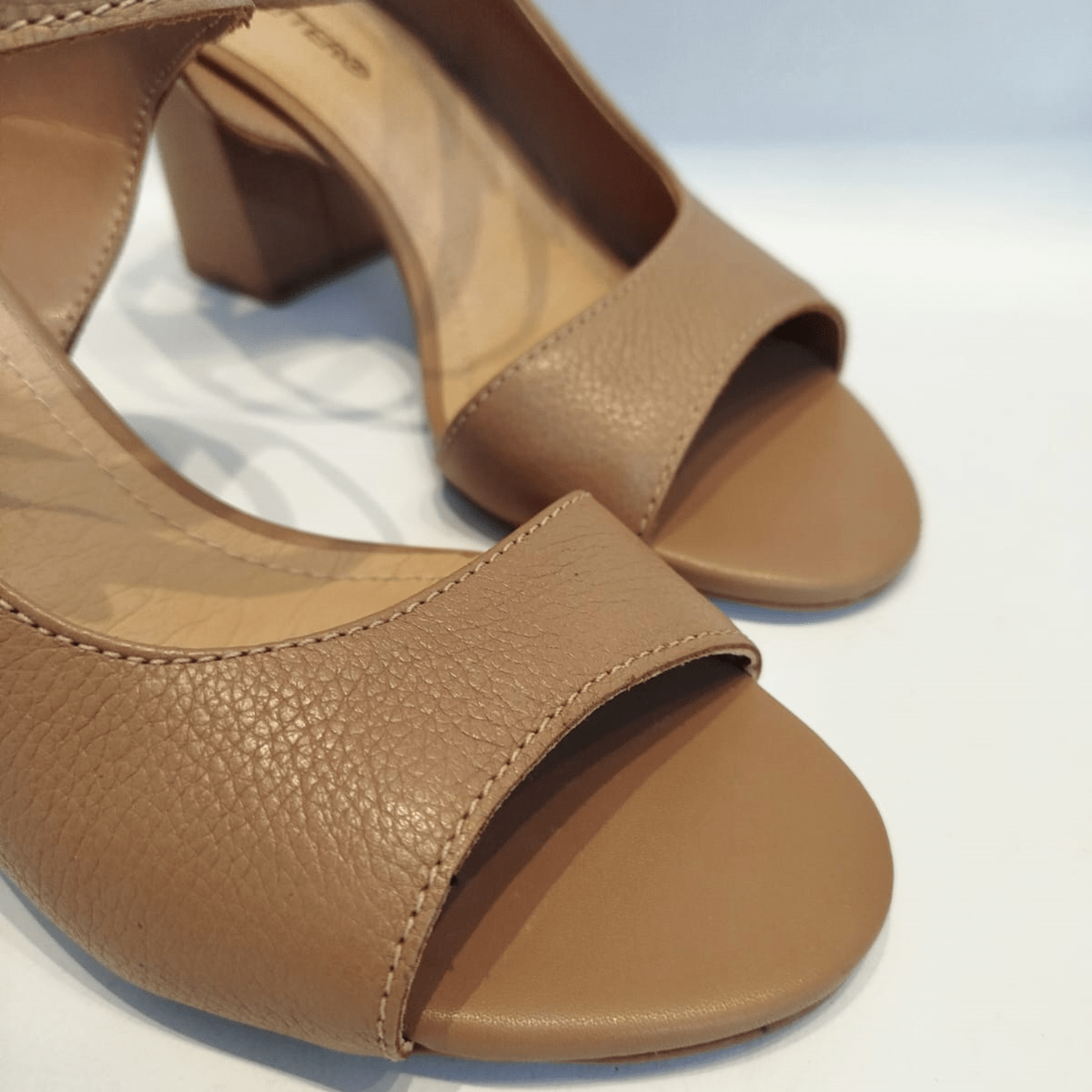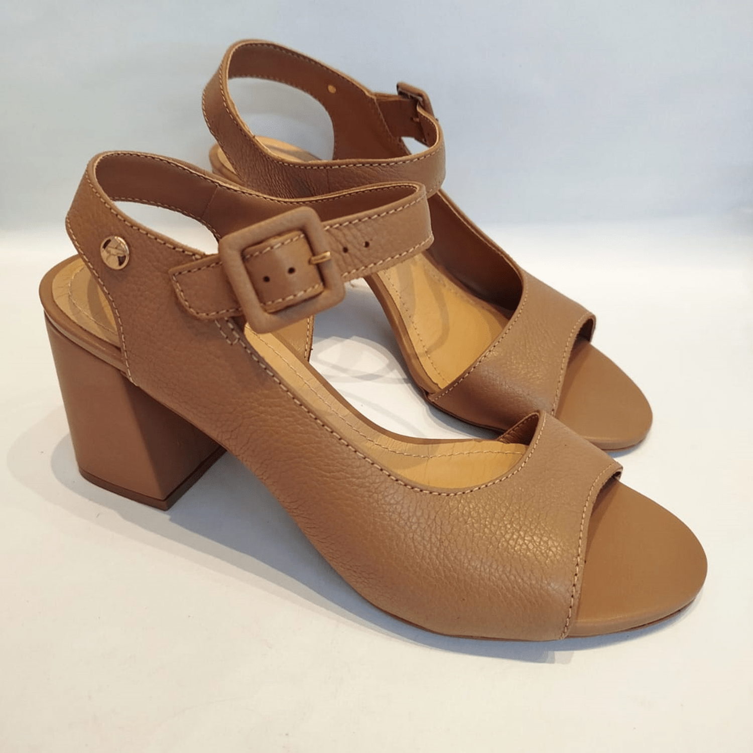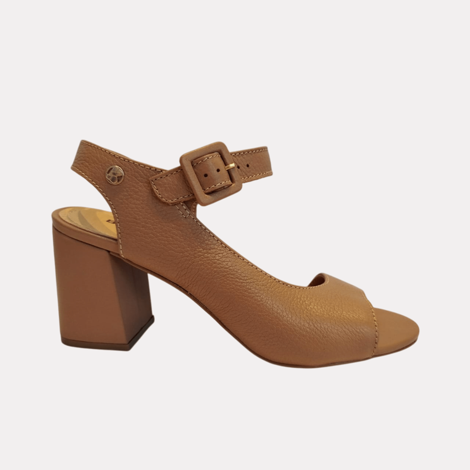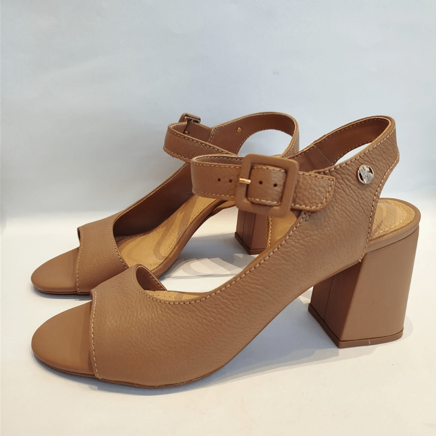 - Detalhes do modelo: Sandália de salto bloco de altura média, detalhe fechado em uma das laterais e fivela para ajuste.