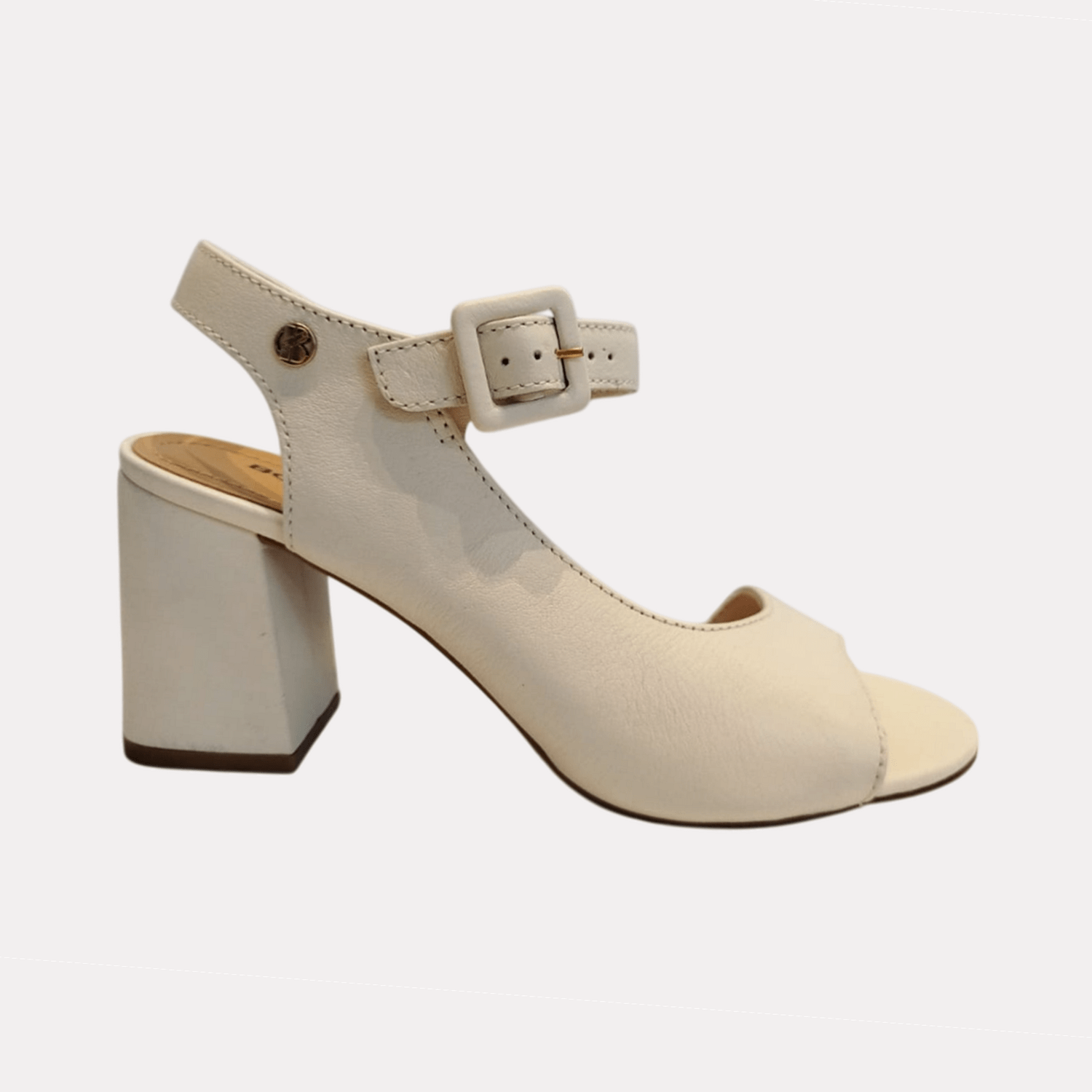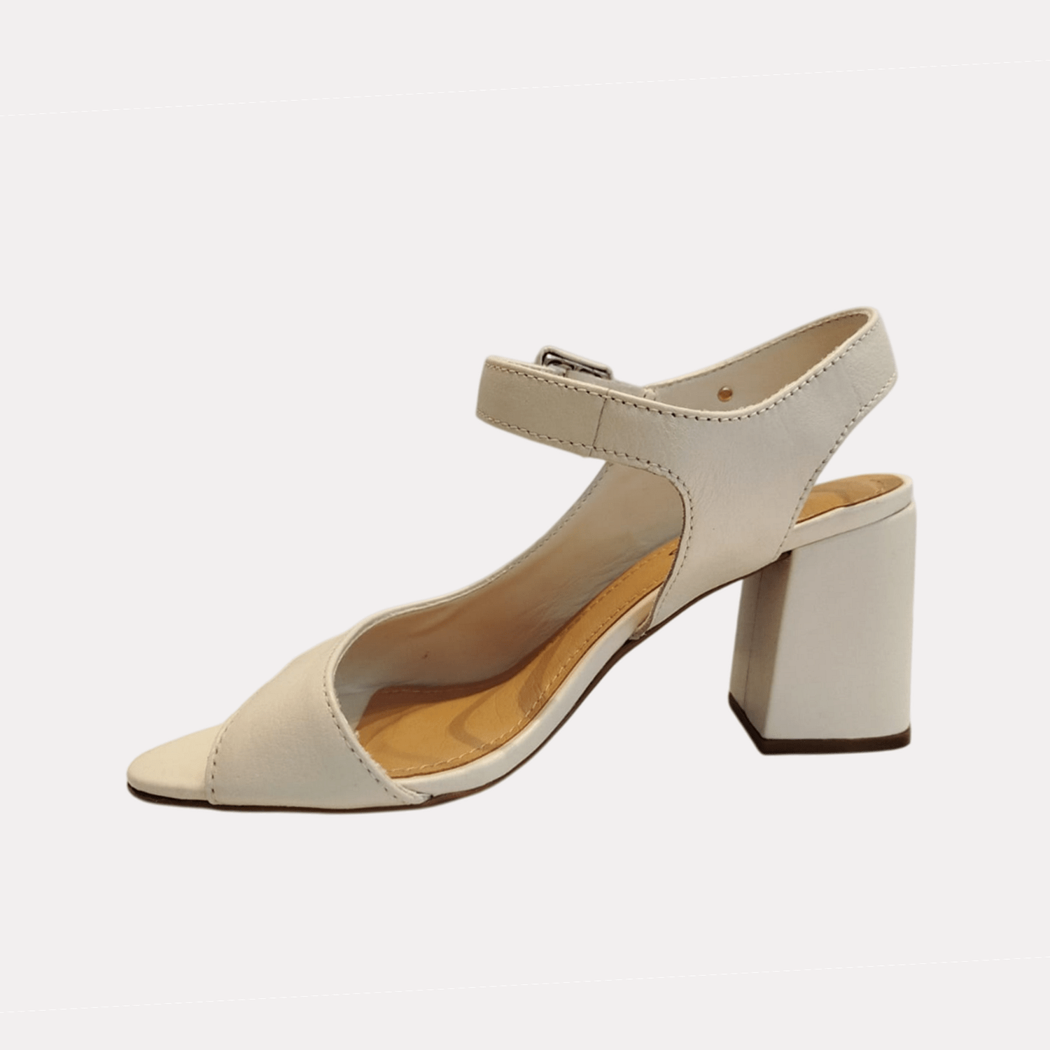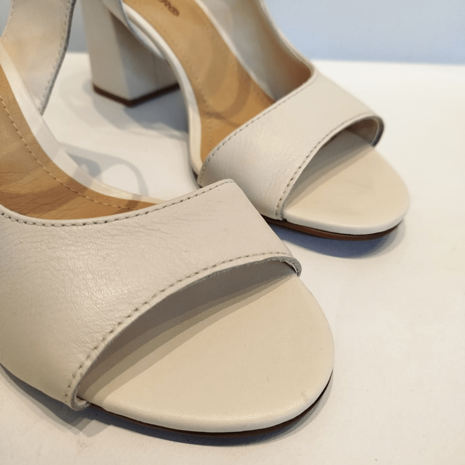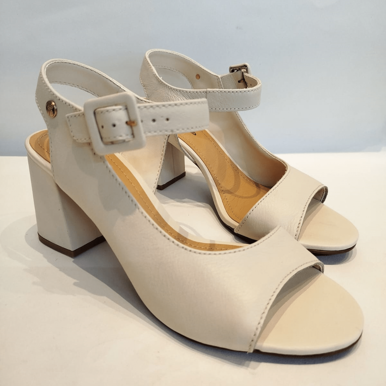 - Detalhes do modelo: Sandália de salto bloco de altura média, detalhe fechado em uma das laterais e fivela para ajuste.