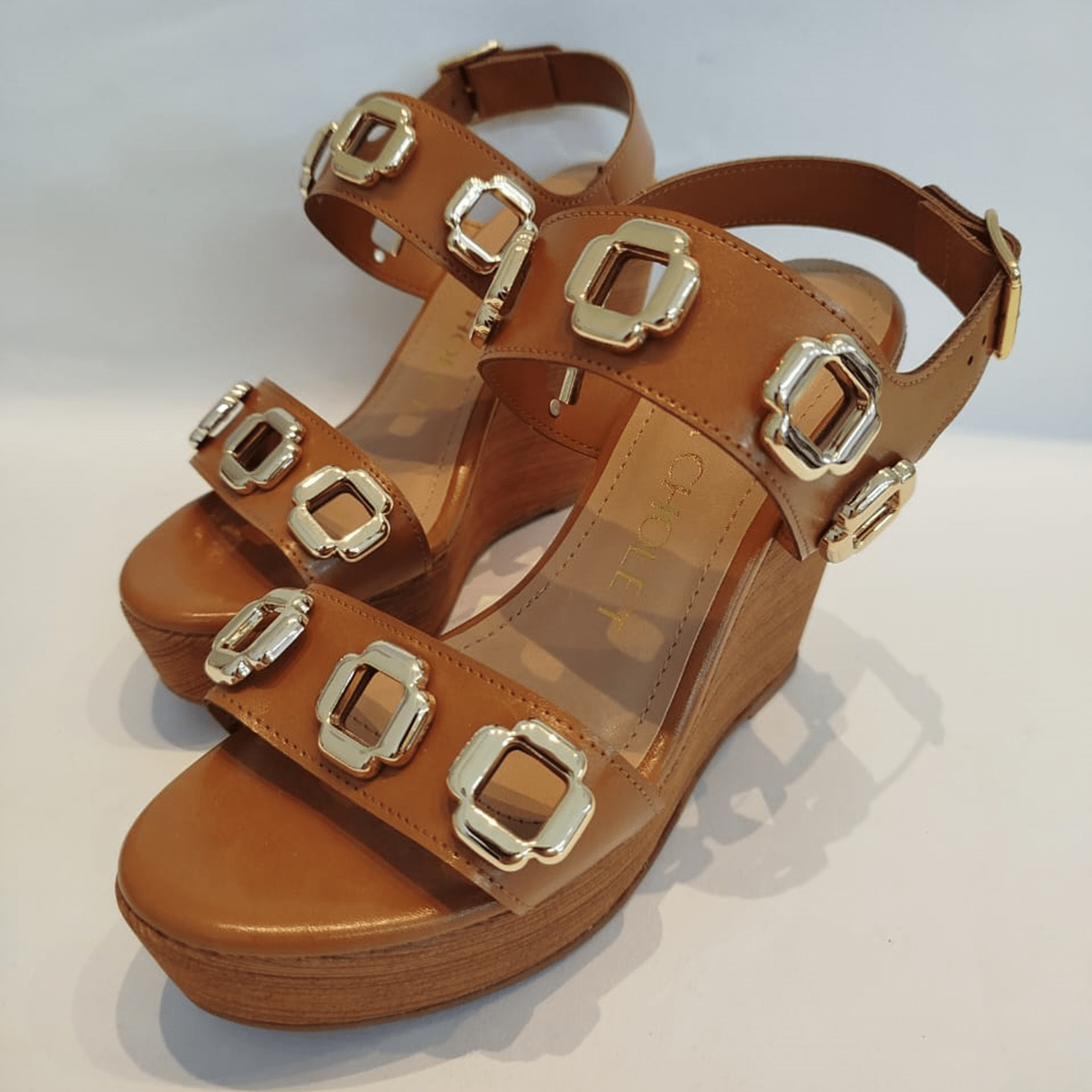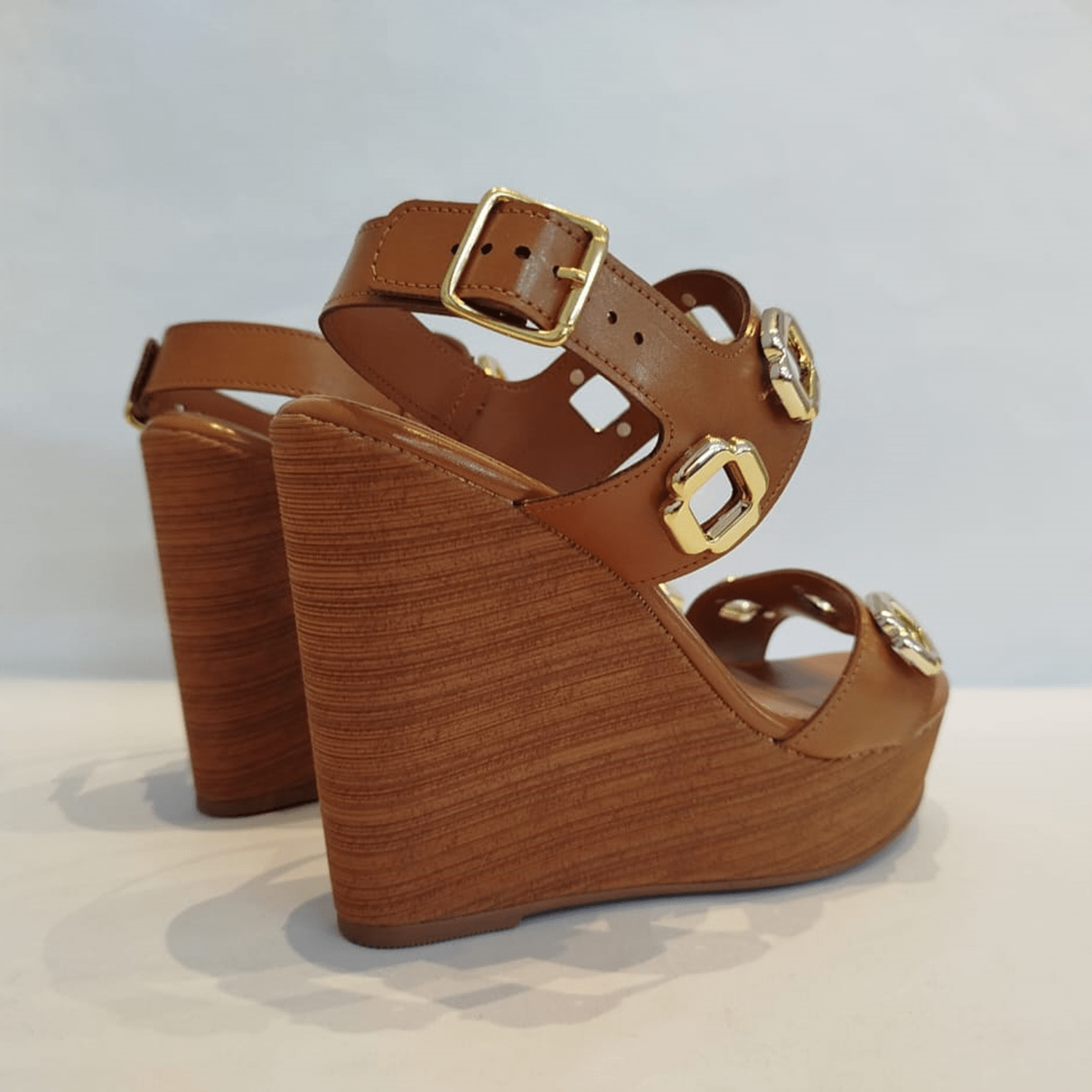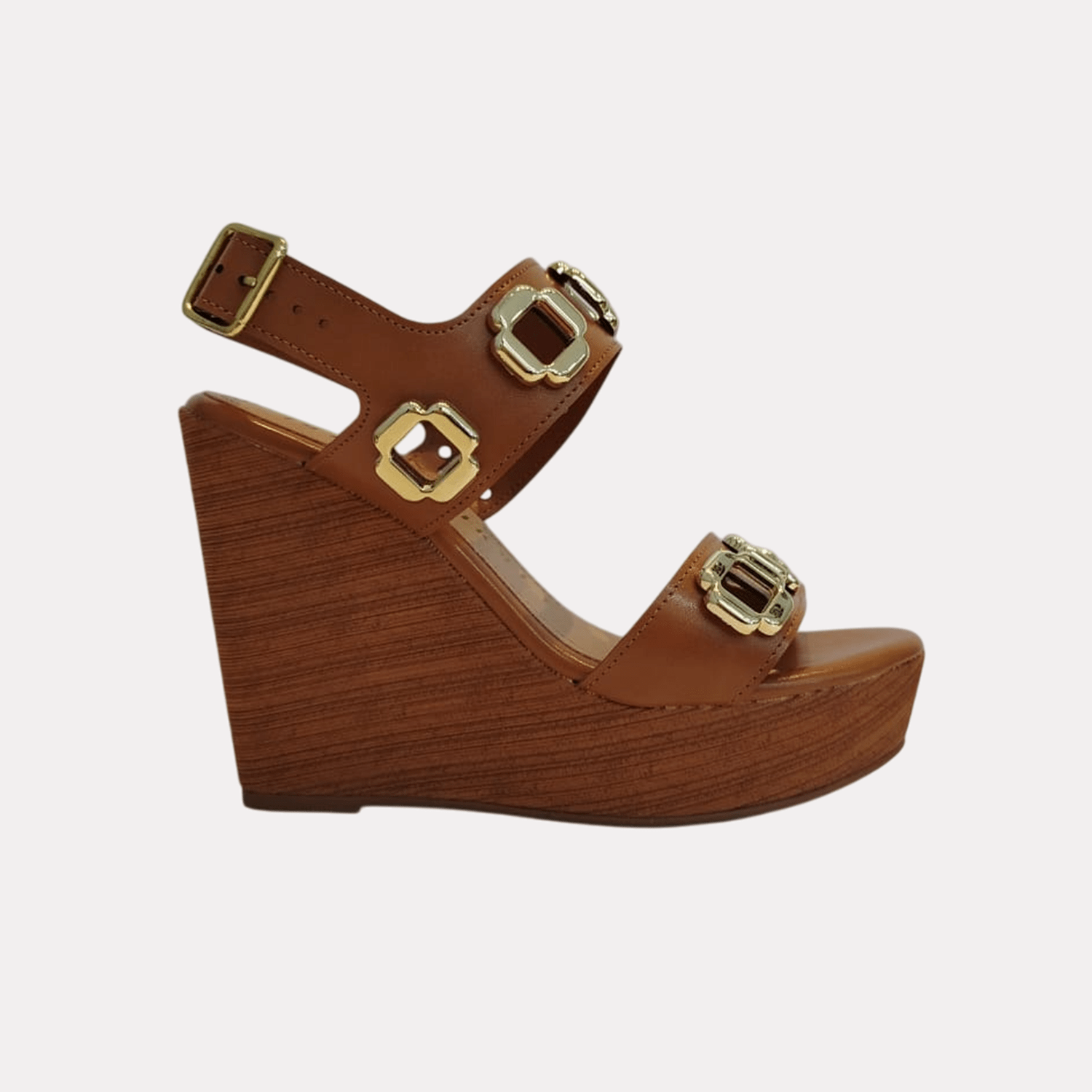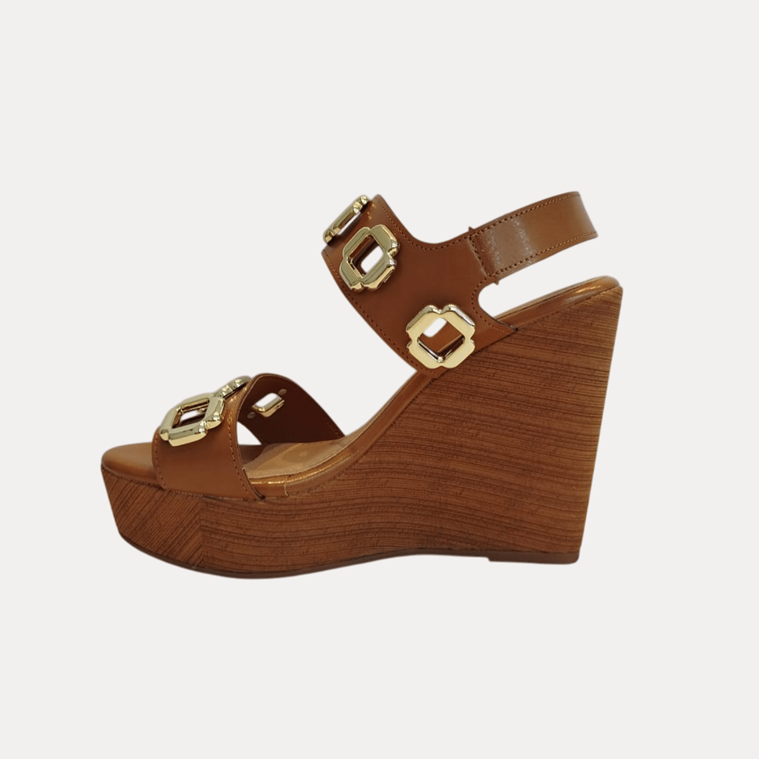- Detalhes do modelo: Sandália de salto anabela, plataforma com textura de veios finos. O cabedal é composto por duas tiras grossas com detalhes de adornos metálicos na cor dourada. Fechamento e ajuste por fivela.