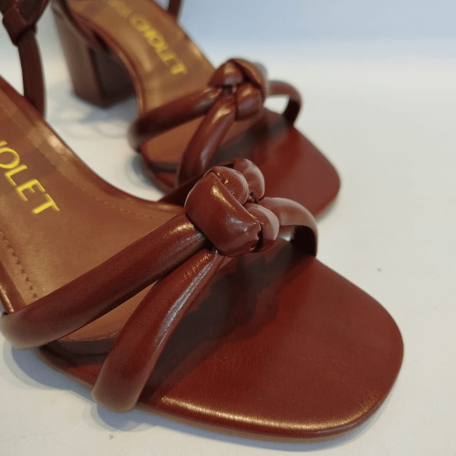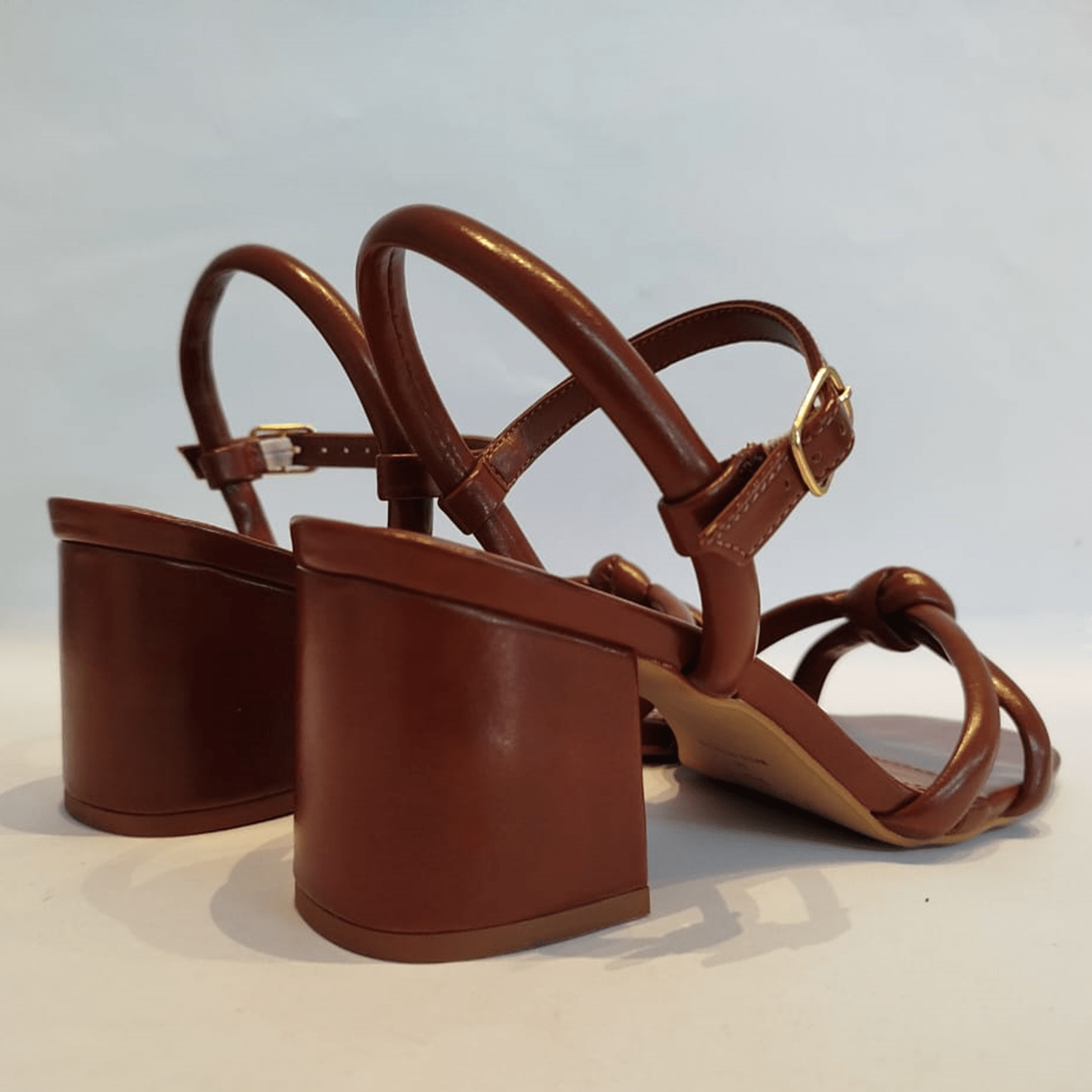 - Detalhes do modelo: Sandália de salto bloco com tiras entrelaçadas e adornadas na frente com detalhe de nó. Fechamento e ajuste por fivela.