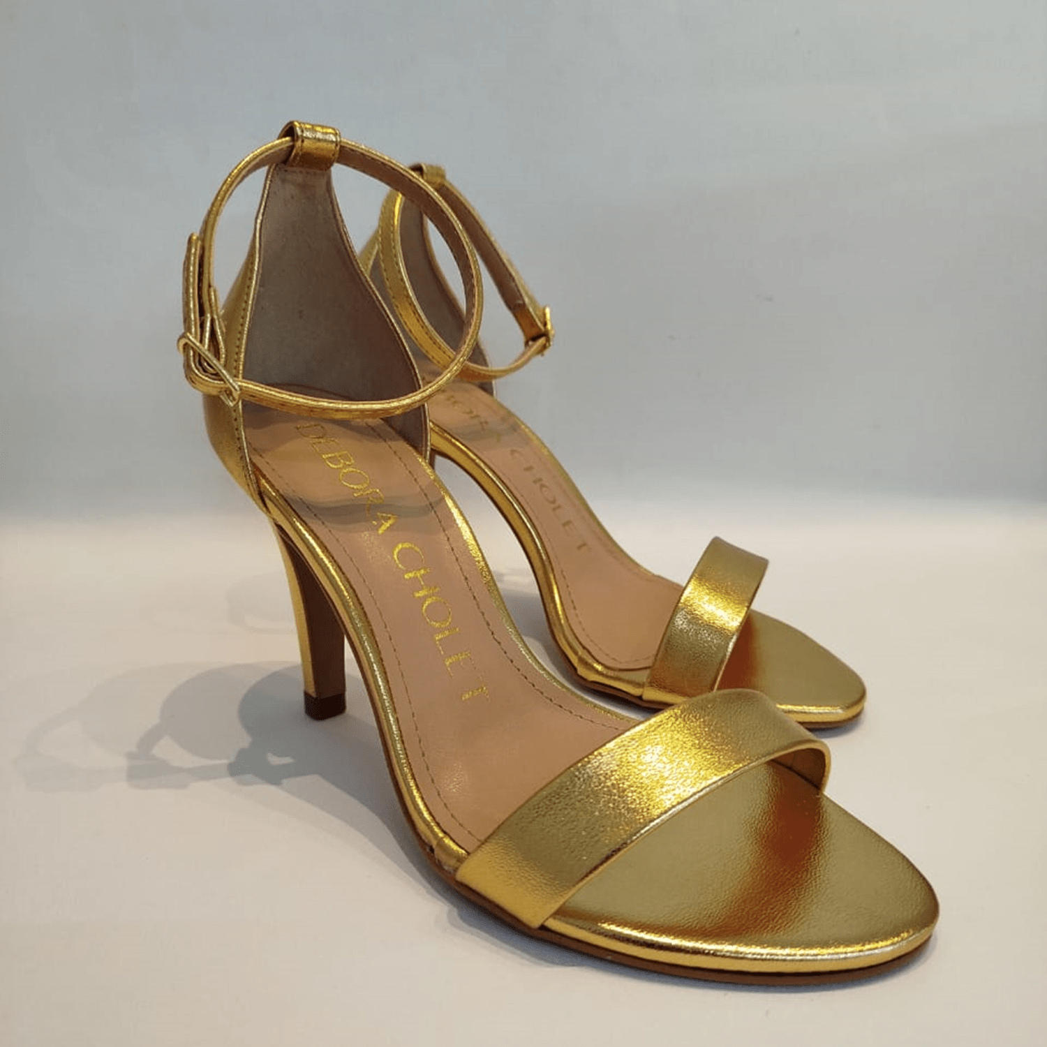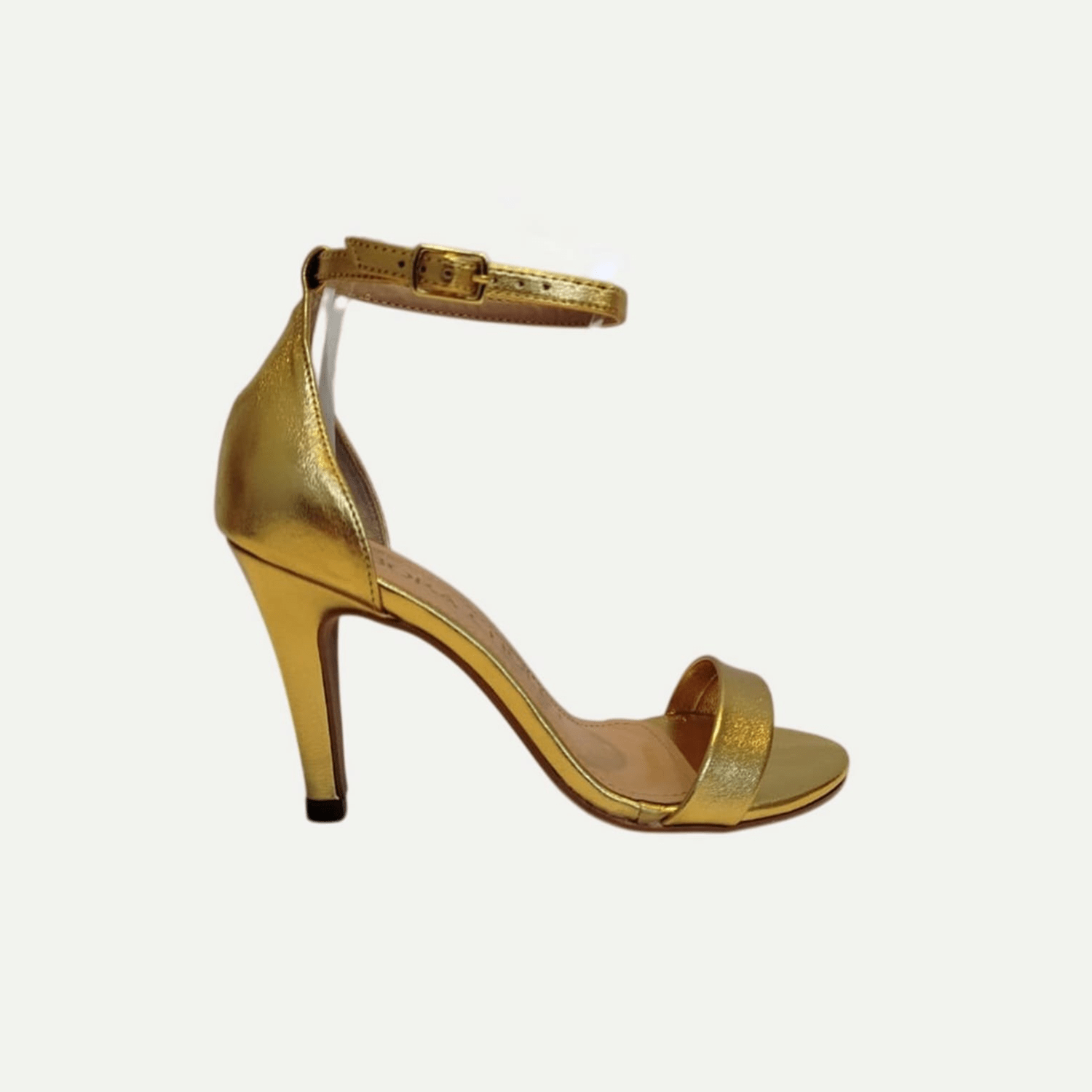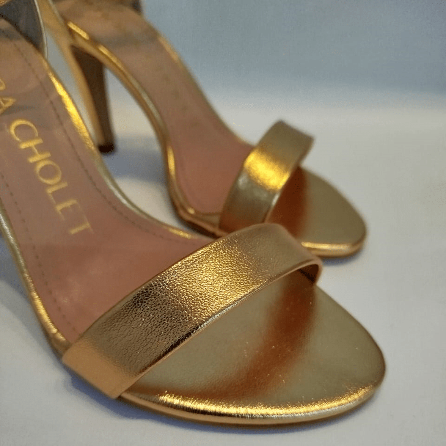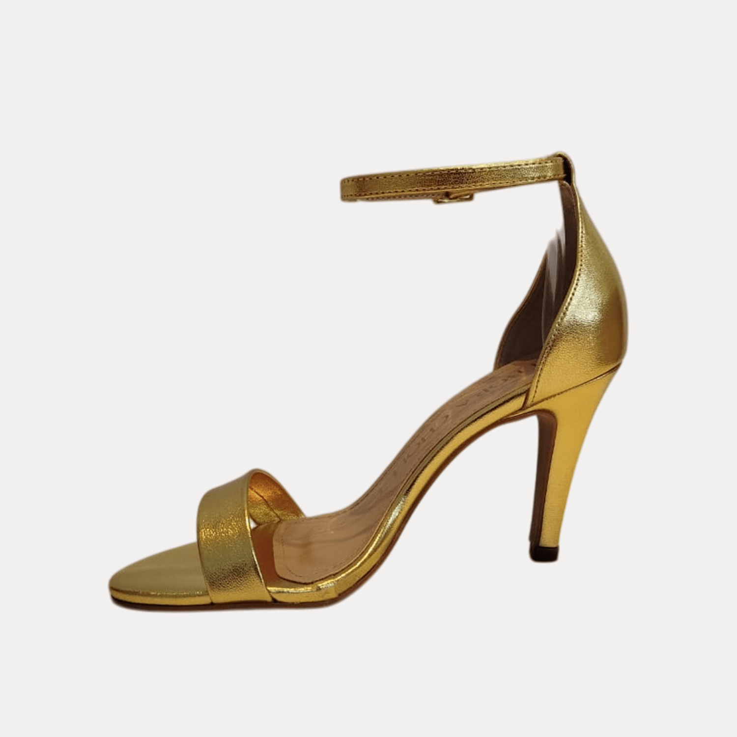 - Detalhes do modelo: Sandália salto fino, tira única na frente e fivela para ajuste no tornozelo.