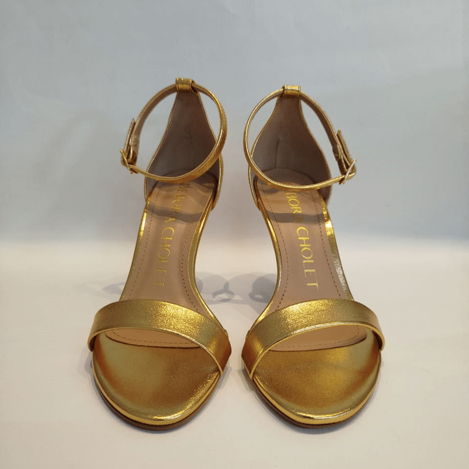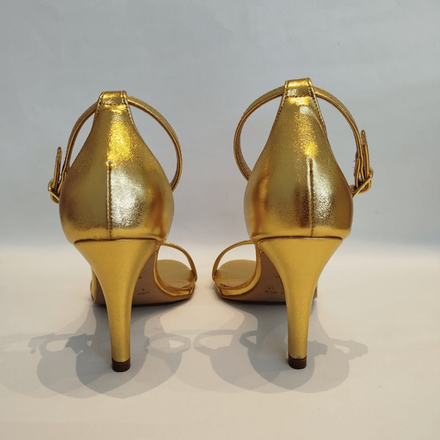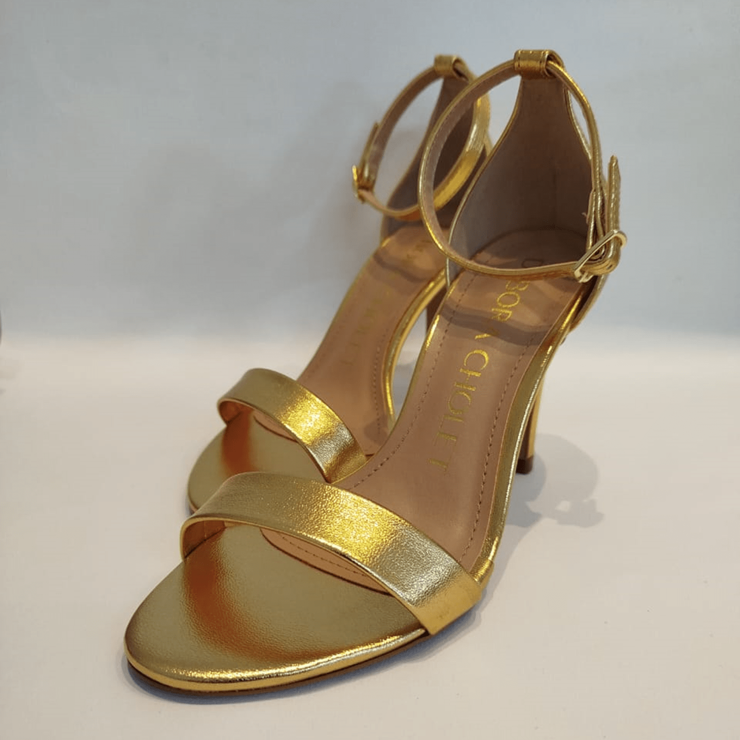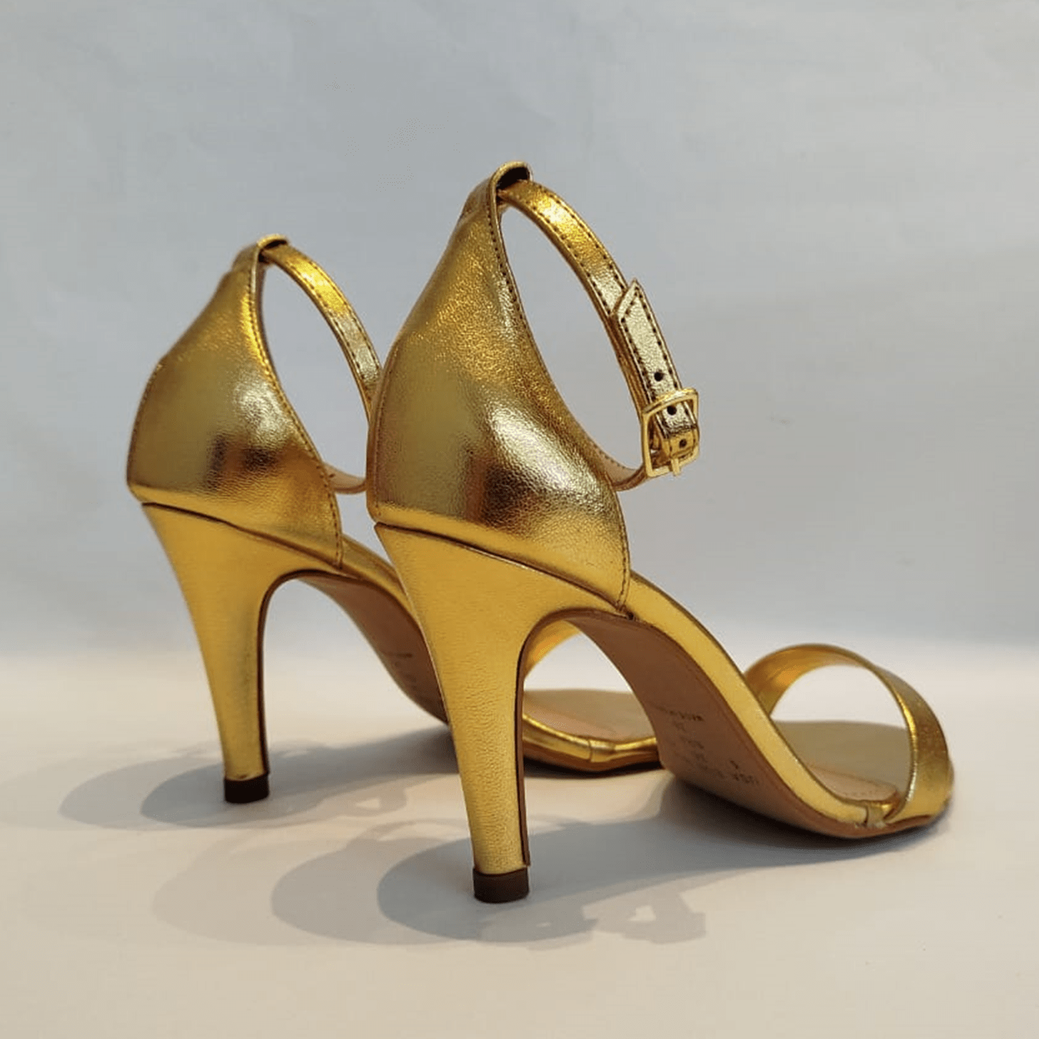 - Detalhes do modelo: Sandália salto fino, tira única na frente e fivela para ajuste no tornozelo.