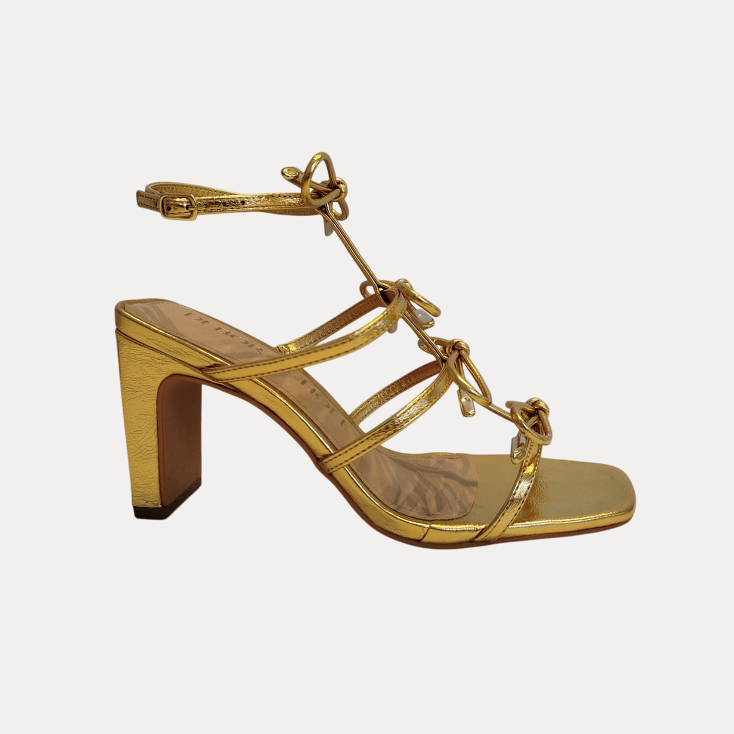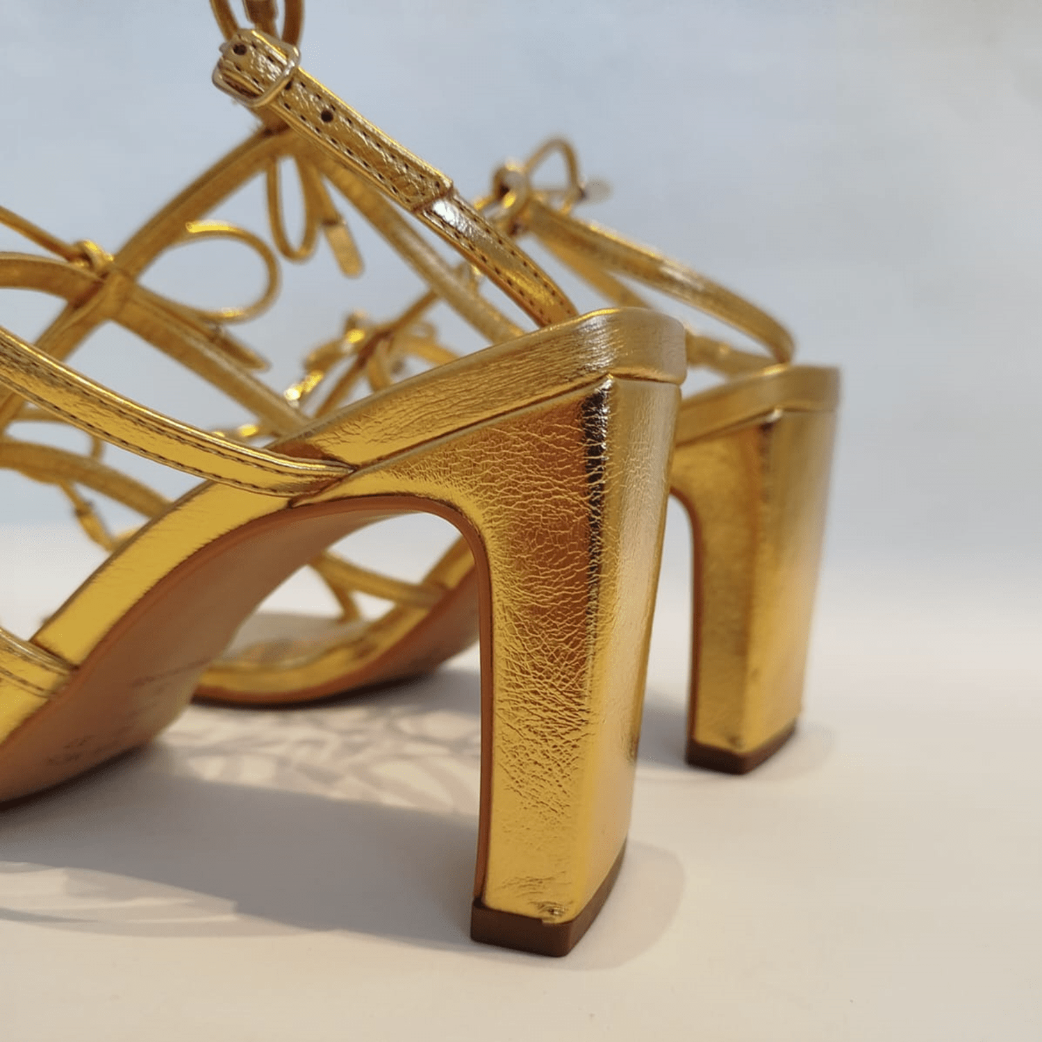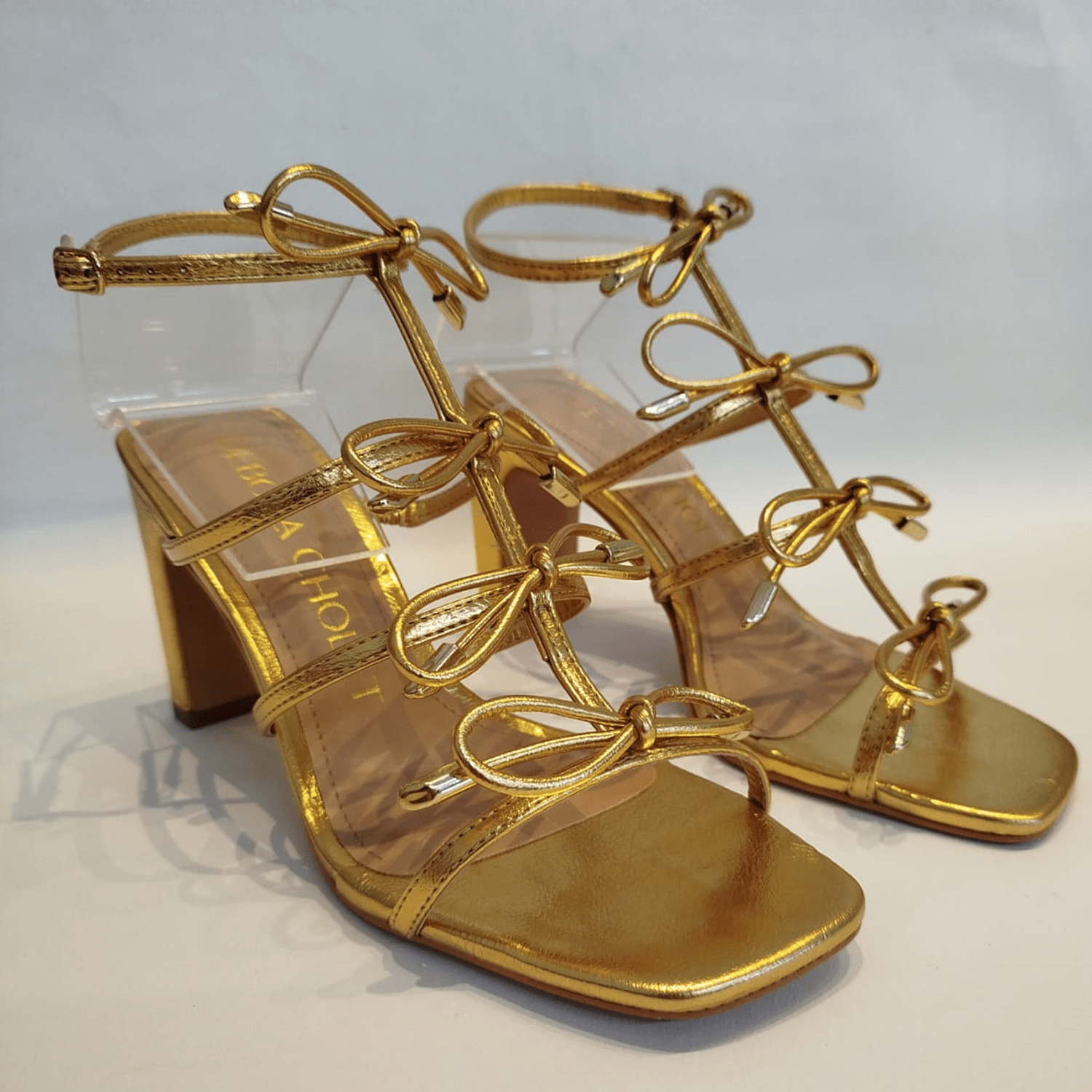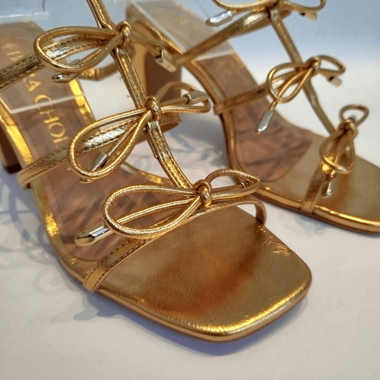 A parte superior é marcada por um design de múltiplas tiras finas, sendo o detalhe mais proeminente os delicados laços criados com o próprio material das tiras, distribuídos de forma charmosa pelo peito do pé.