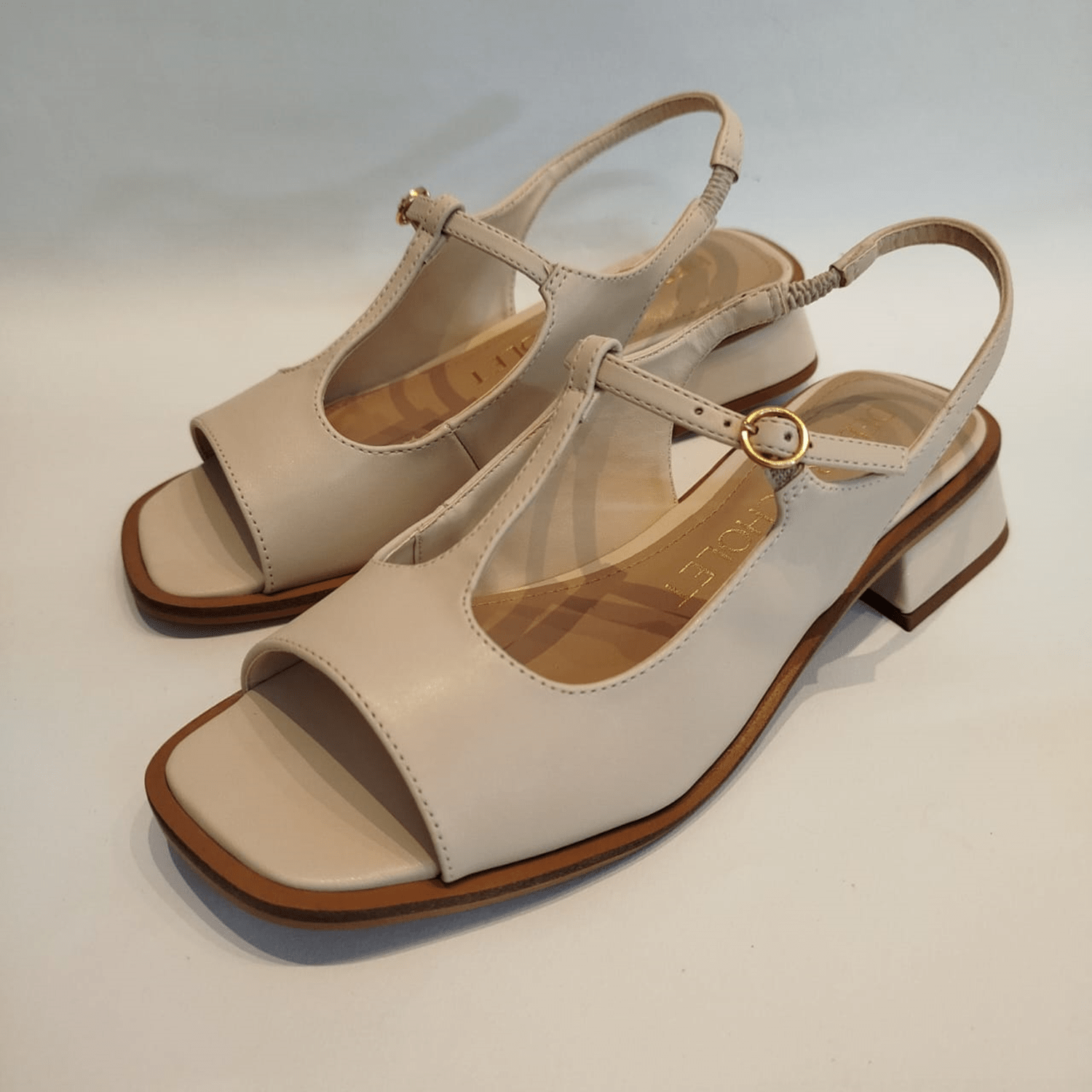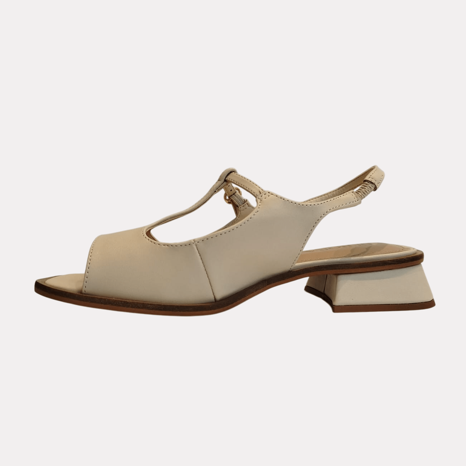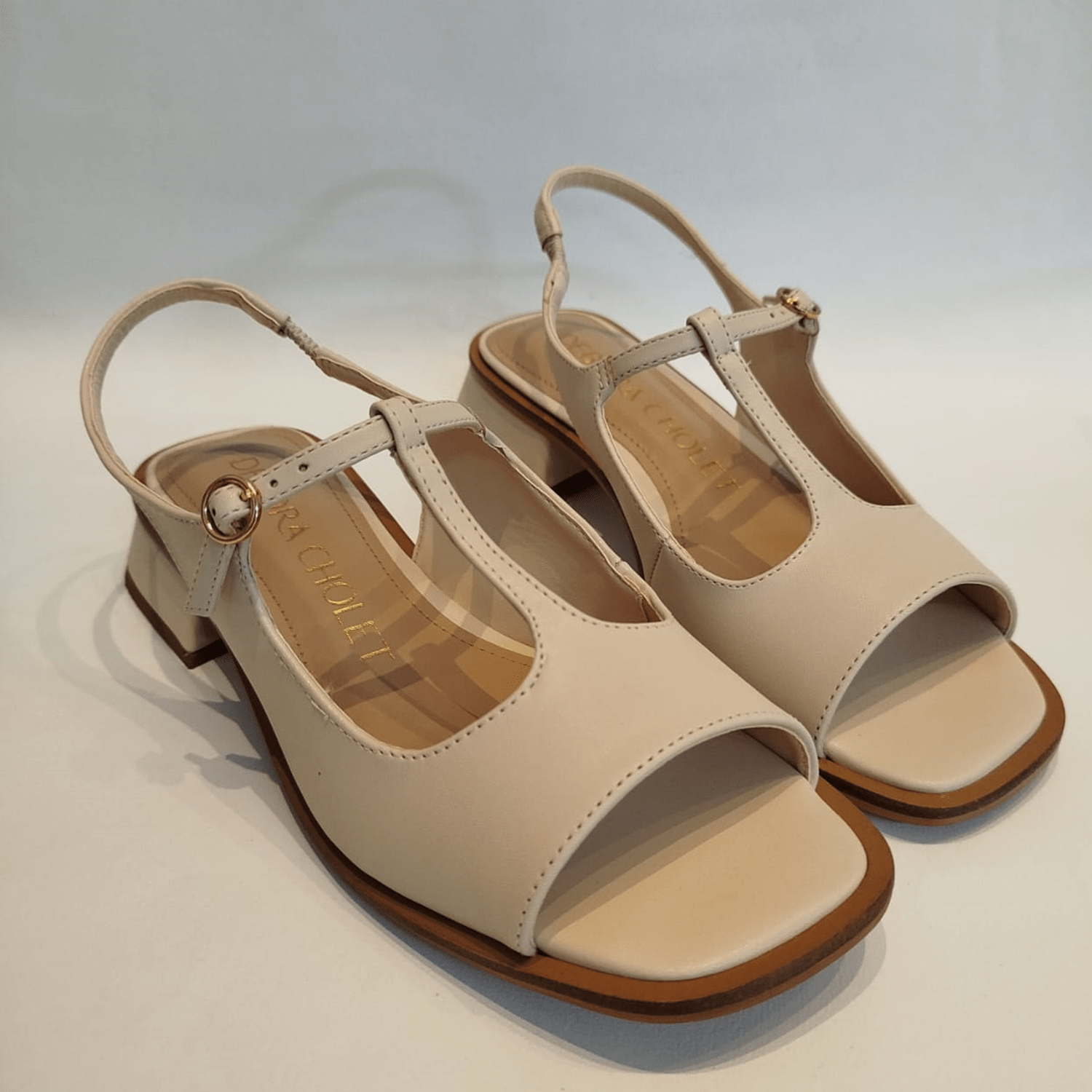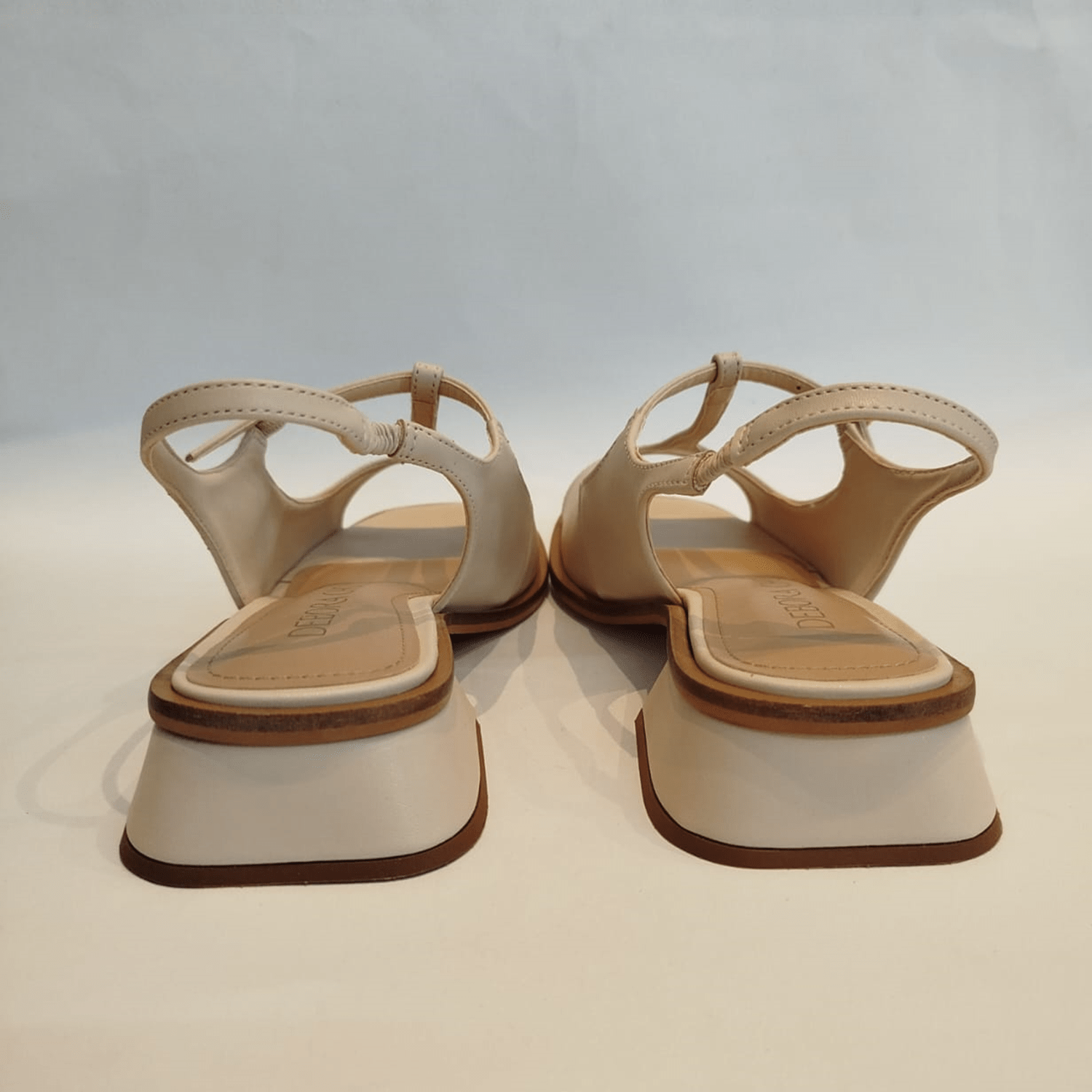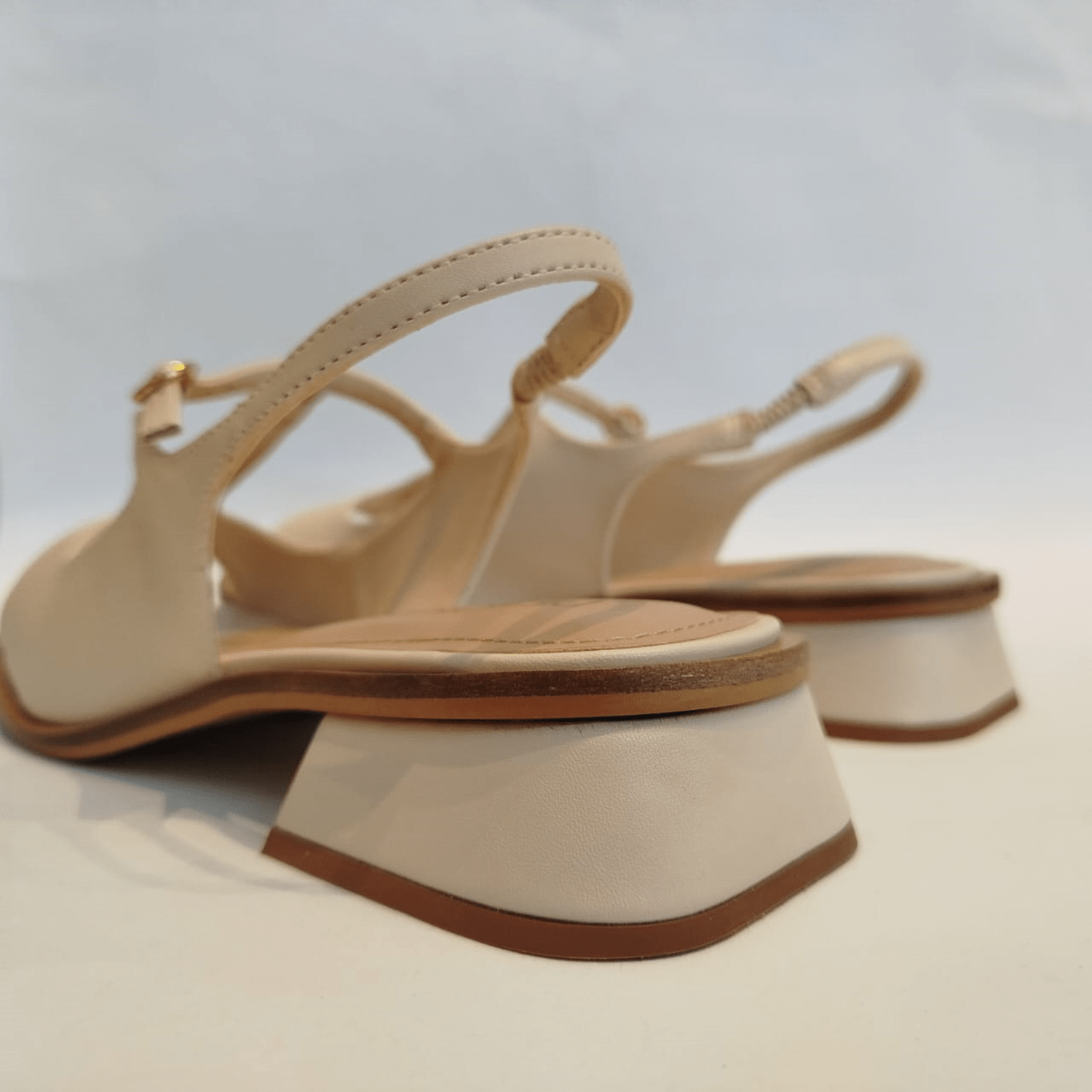 A parte frontal da sandália é caracterizada por um formato de bico aberto e levemente quadrado, tendência que confere um toque moderno ao modelo. As laterais do cabedal são mais fechadas, proporcionando maior estrutura e suporte ao pé. Seu design se destaca pela tira fina que cruza o peito do pé e se une à tira traseira ajustável (slingback), que prende o calcanhar com uma fivela de metal discreta.