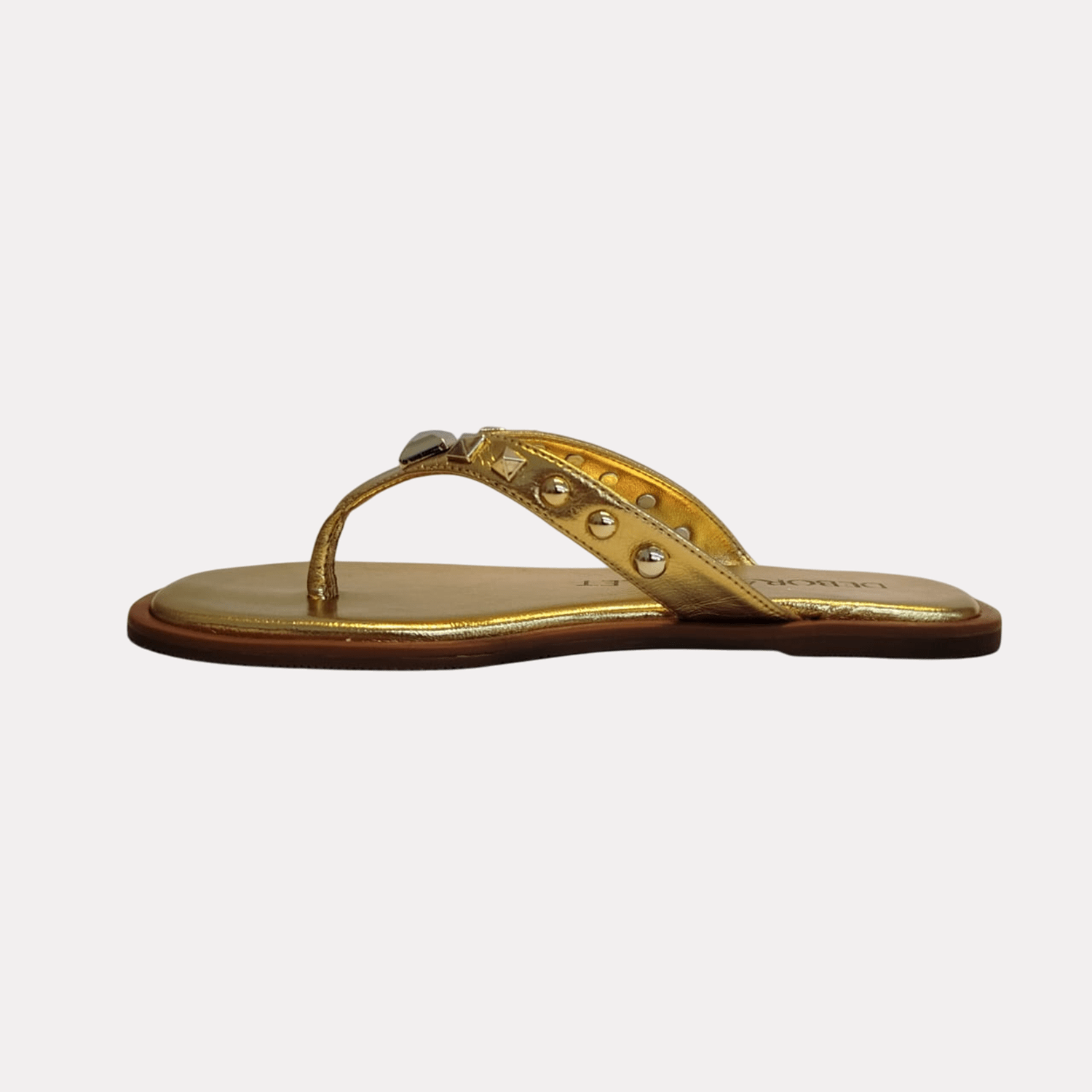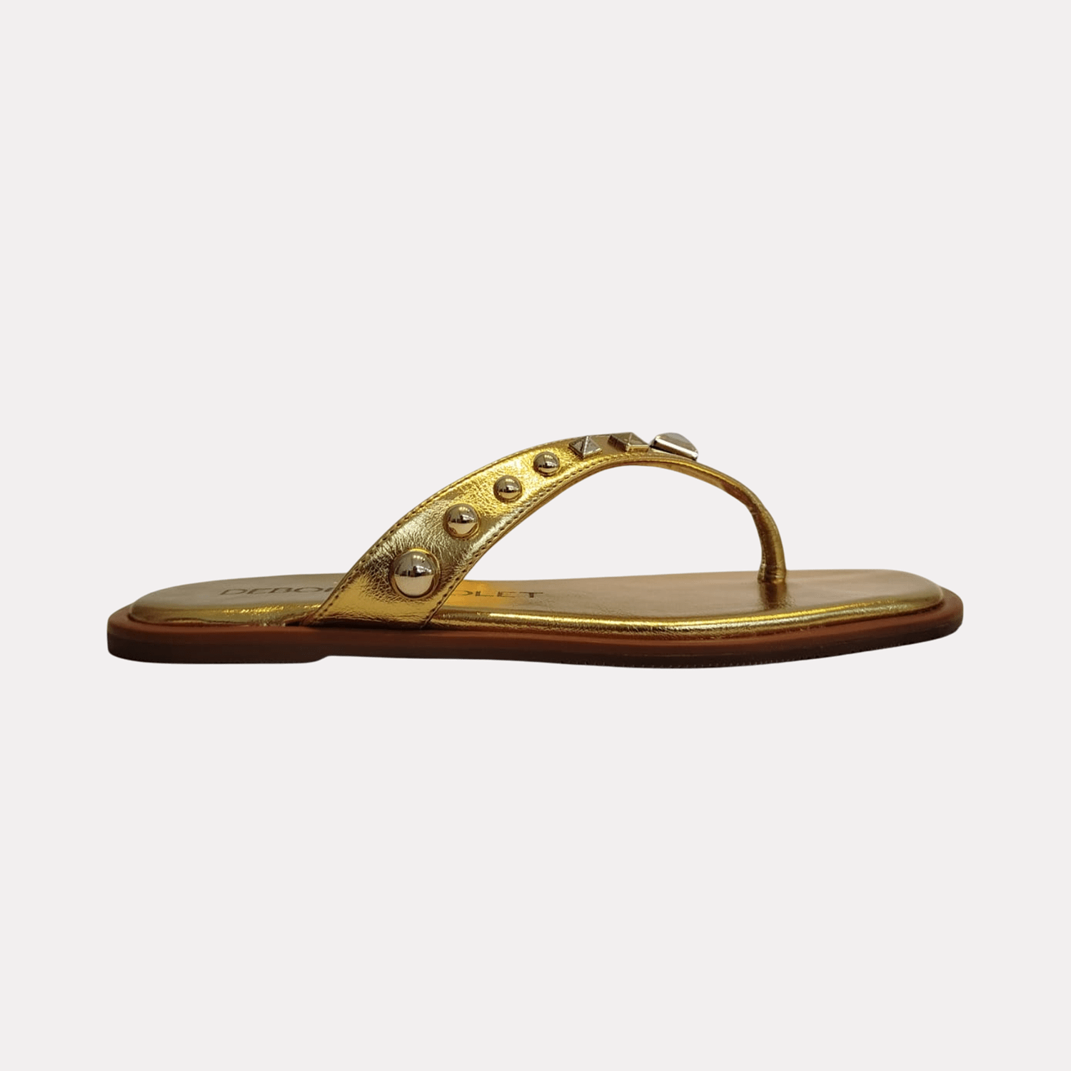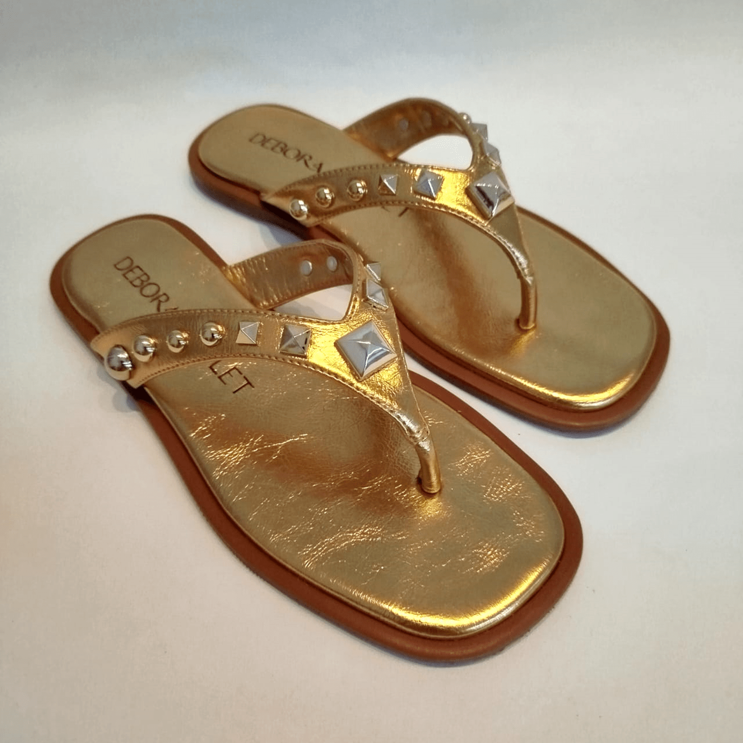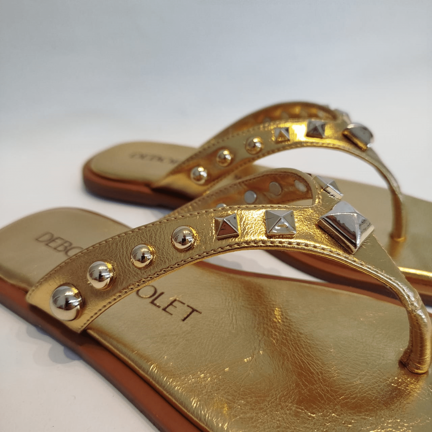 Sandália Rasteira feminina na cor dourado aplicação de metais dourados para um visual mais moderno e especial.