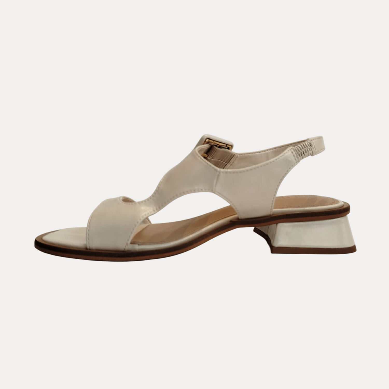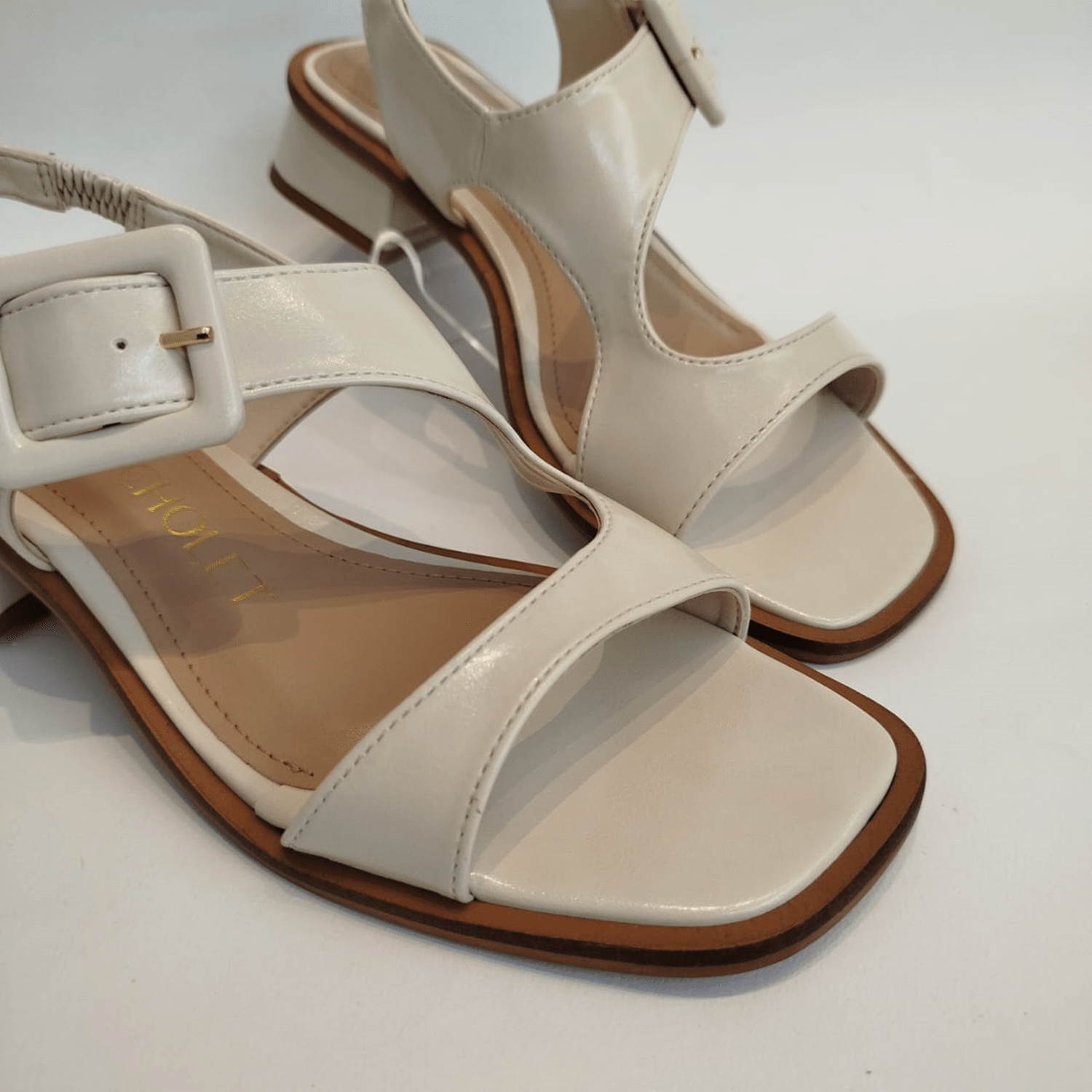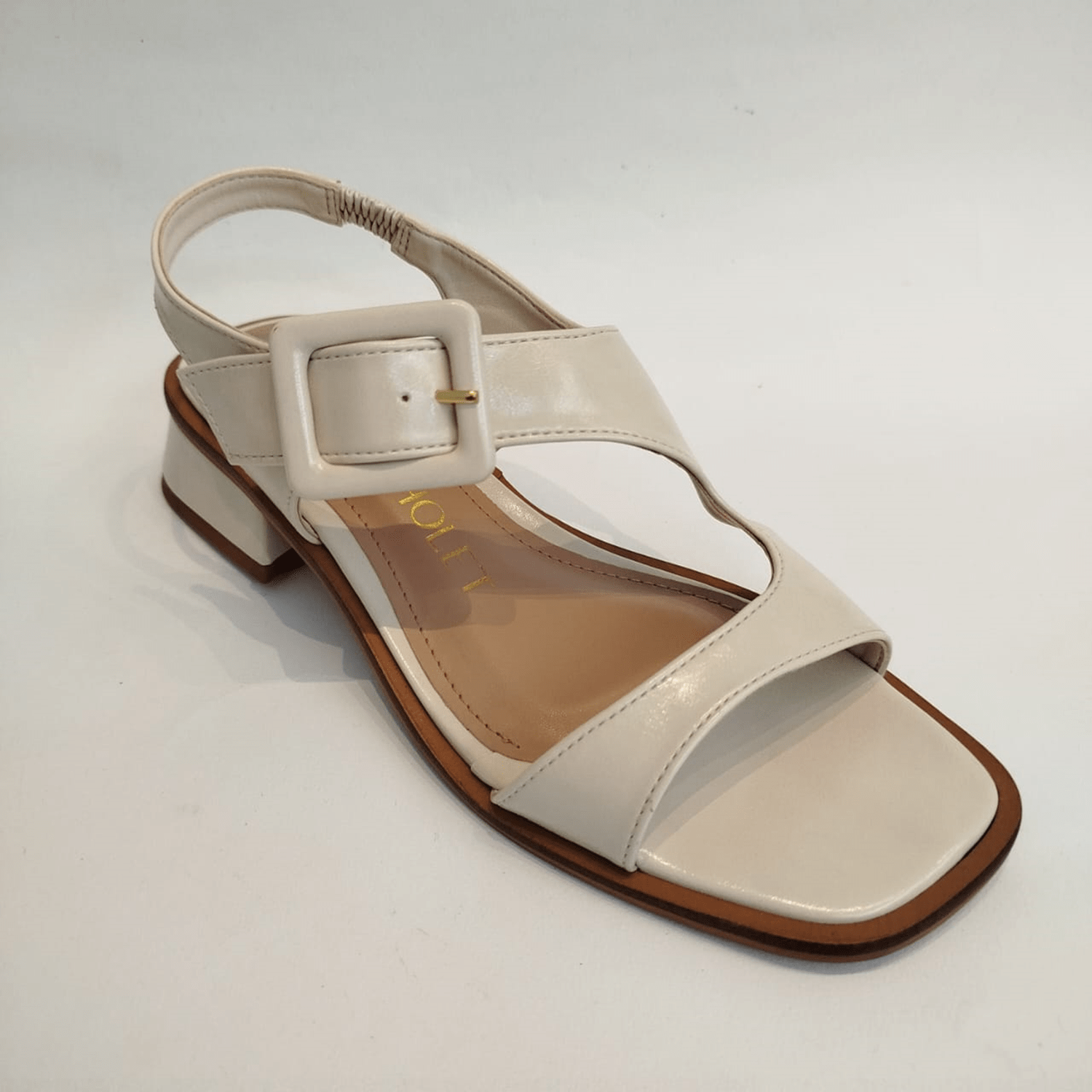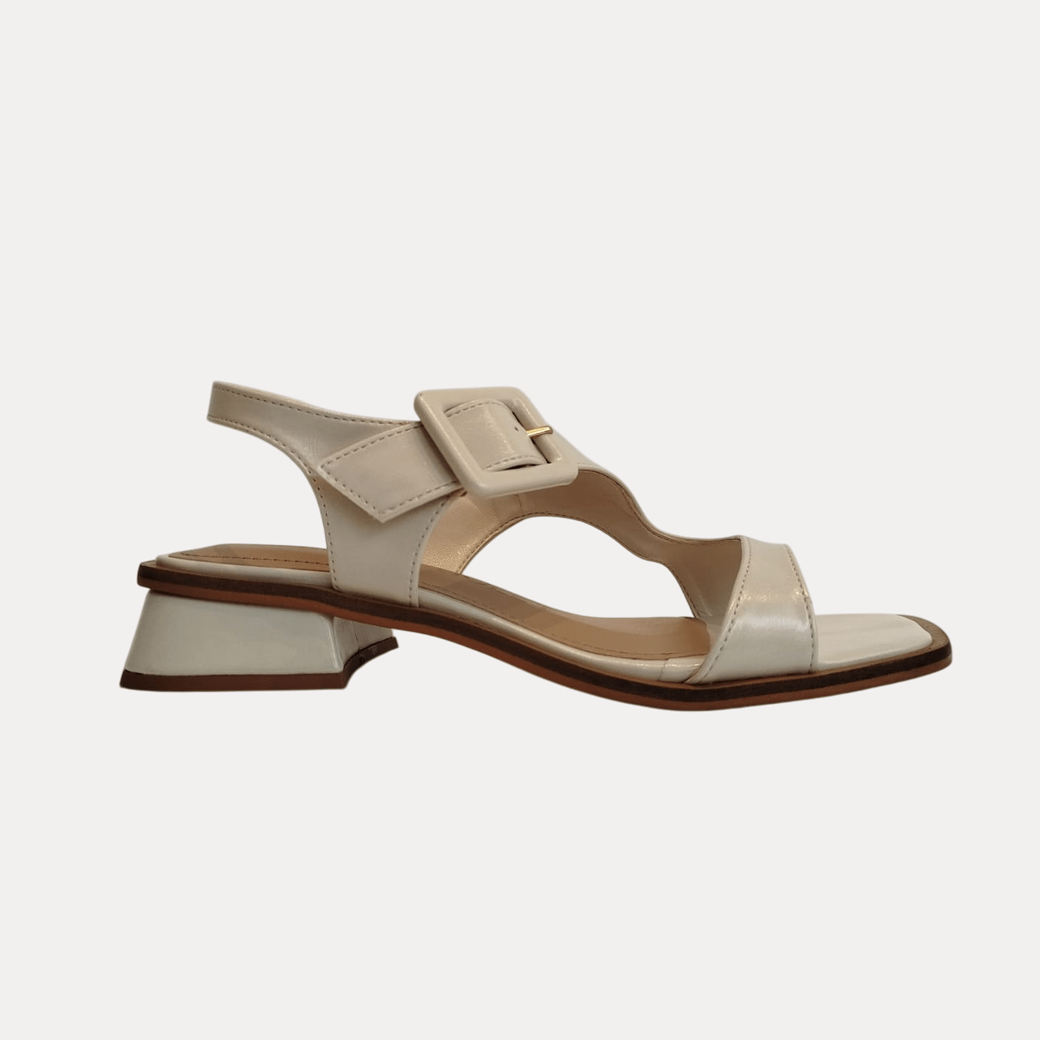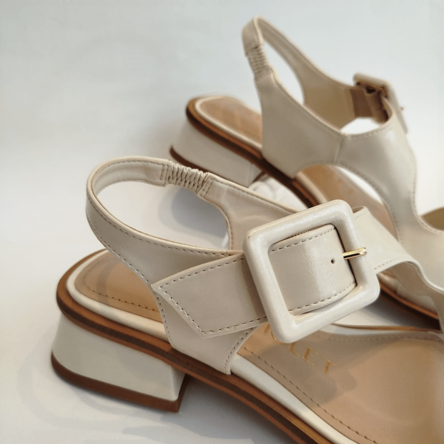 Sandália feminina de salto baixo em bloco. O calçado apresenta um bico levemente quadrado e uma palmilha de cor marrom claro. Possui duas tiras largas que se cruzam sobre o peito do pé e uma tira ajustável no calcanhar com elástico e uma fivela grande e quadrada, também na cor do cabedal, para fechamento e ajuste.