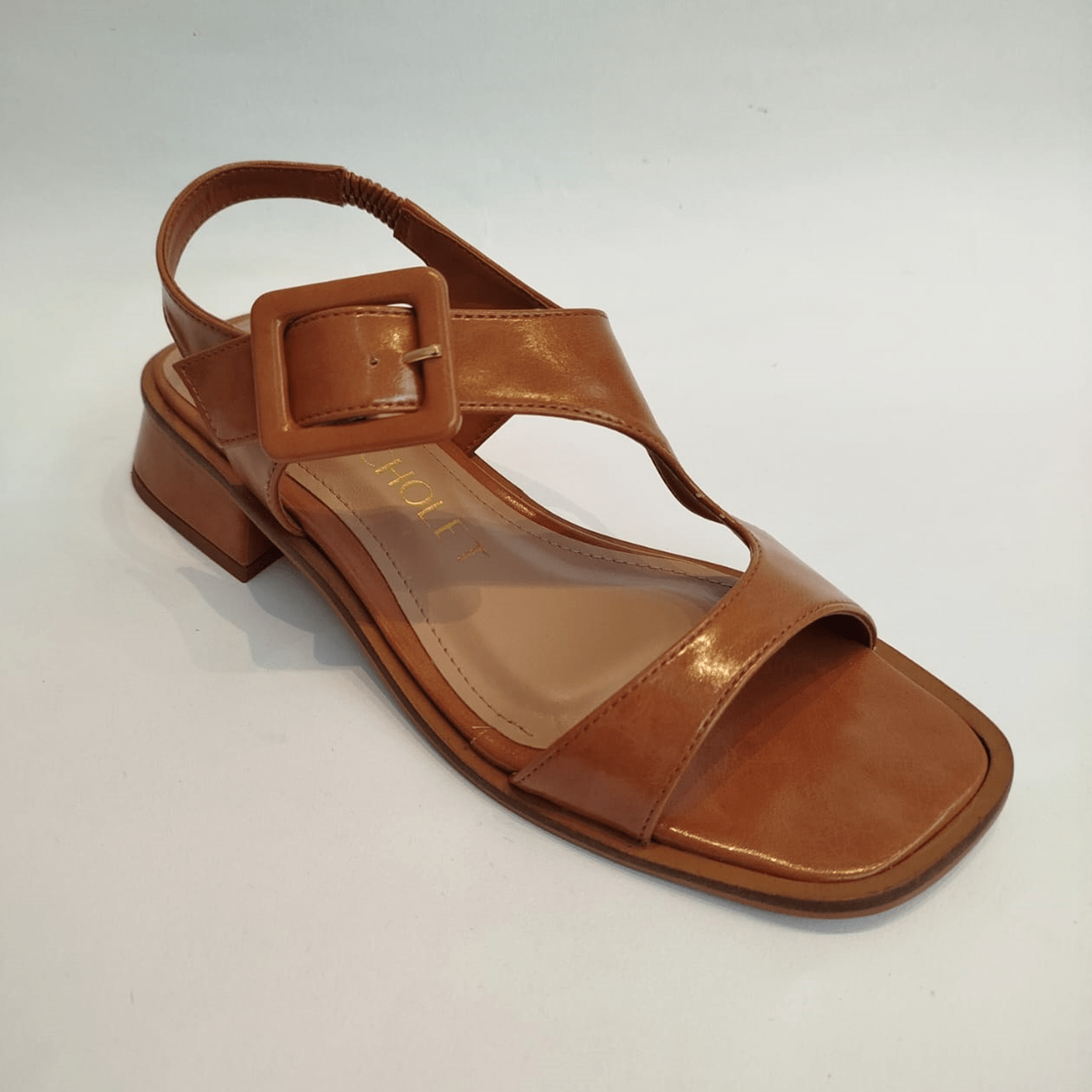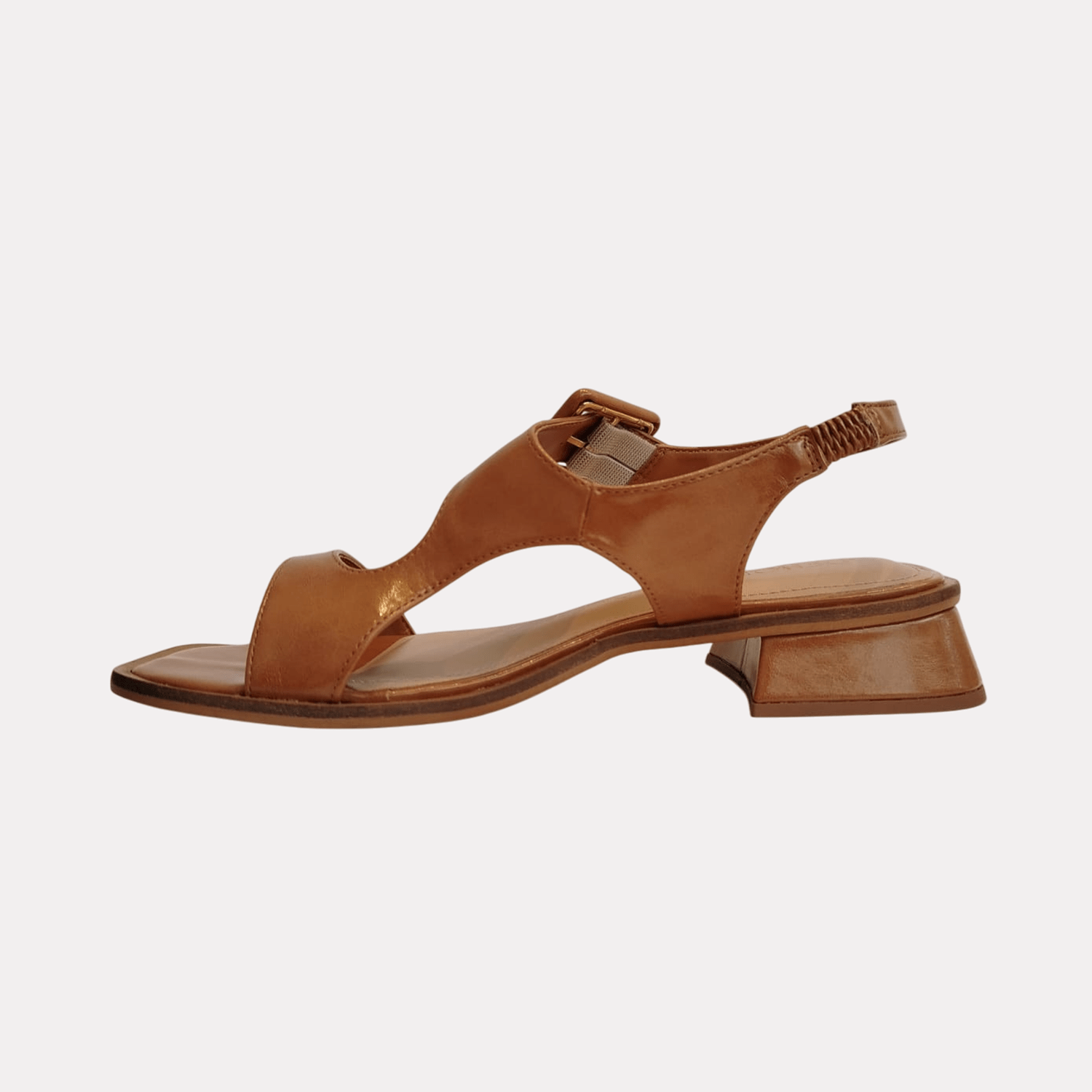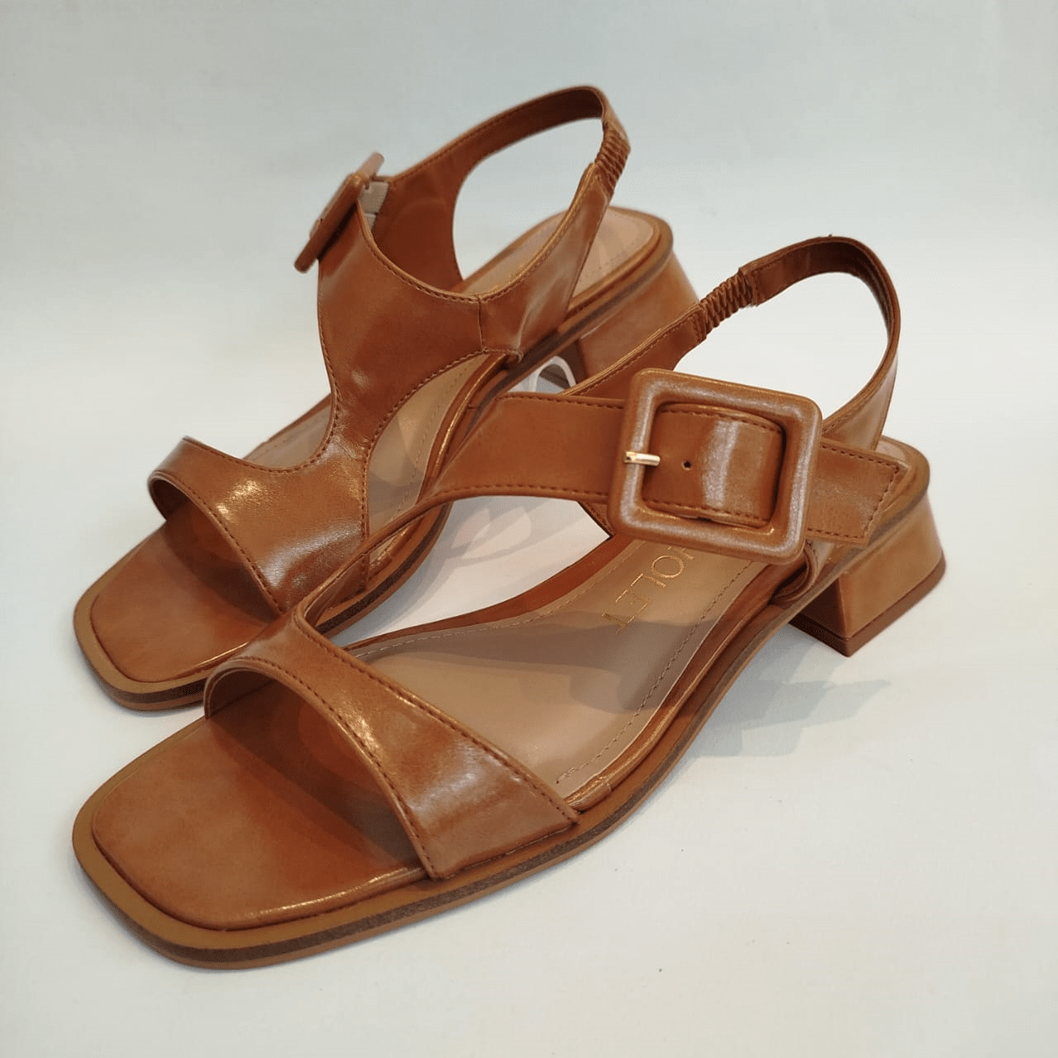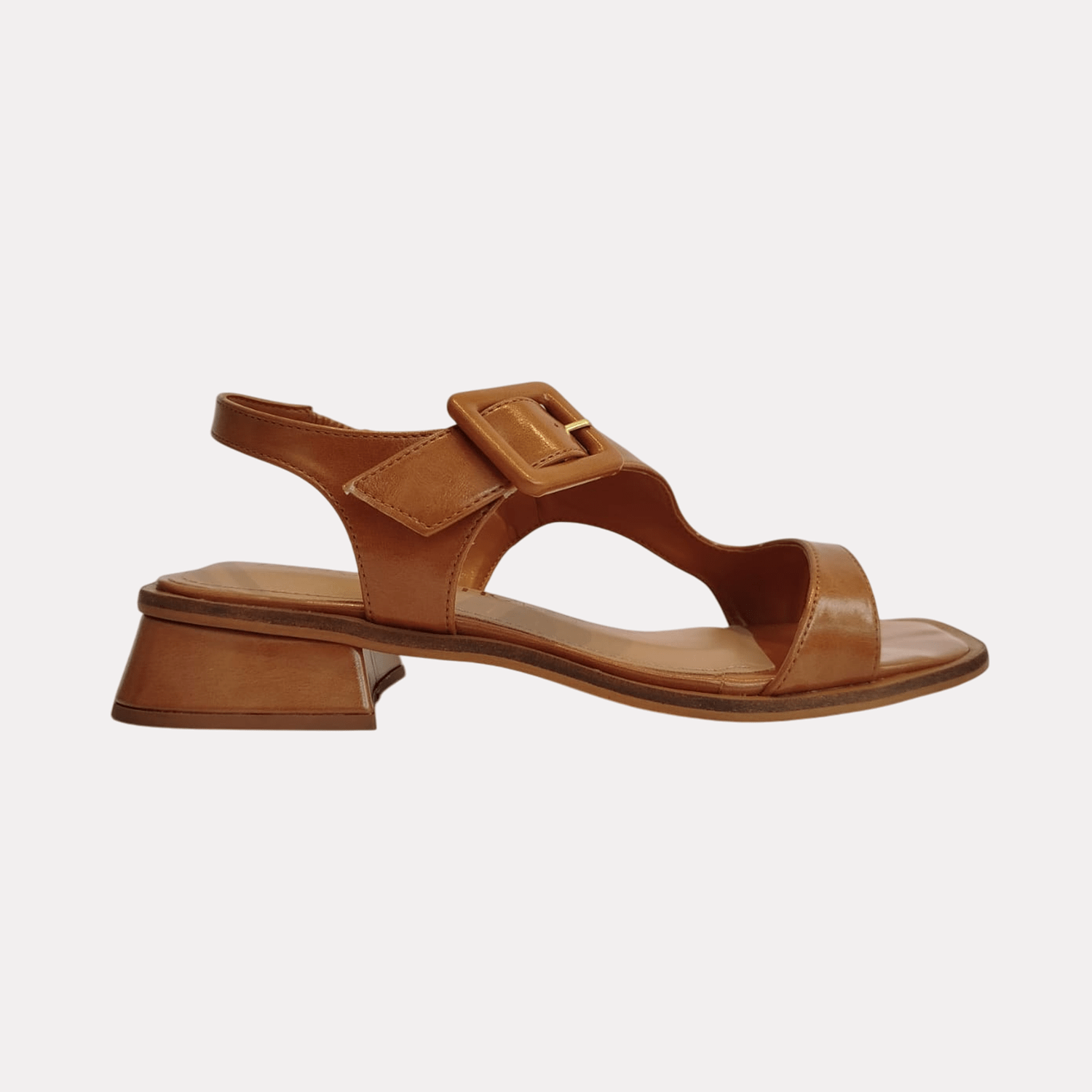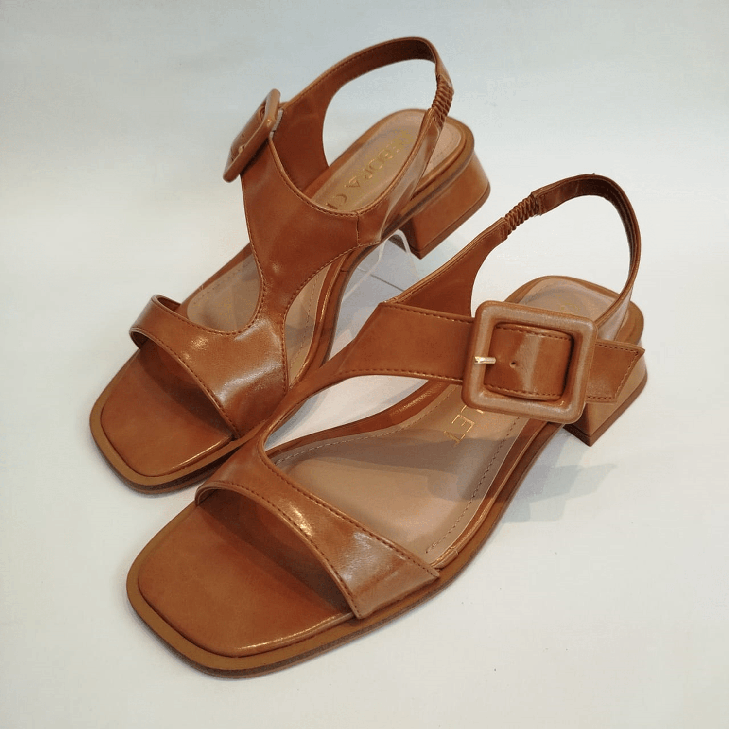 Sandália feminina de salto baixo em bloco. O calçado apresenta um bico levemente quadrado e uma palmilha de cor marrom claro. Possui duas tiras largas que se cruzam sobre o peito do pé e uma tira ajustável no calcanhar com elástico e uma fivela grande e quadrada, também na cor do cabedal, para fechamento e ajuste.
