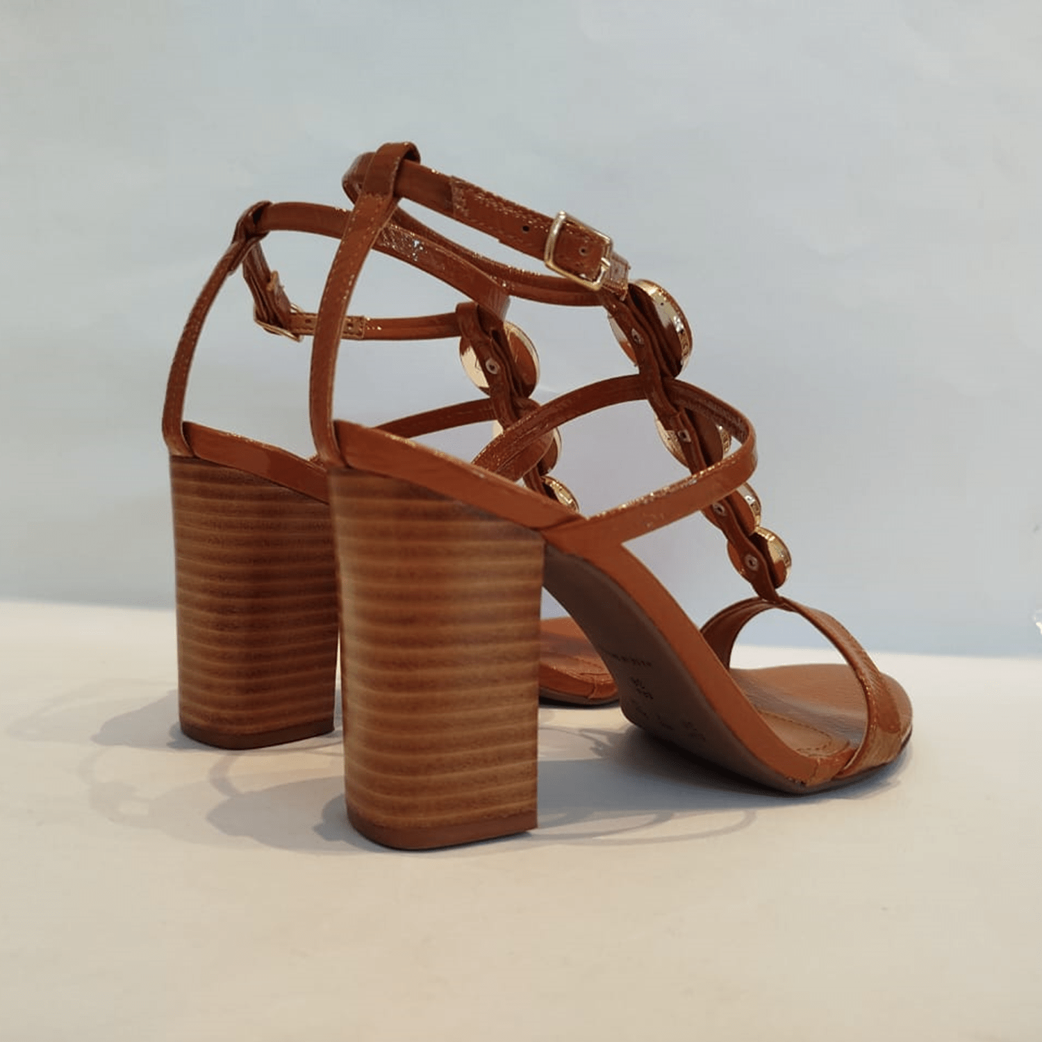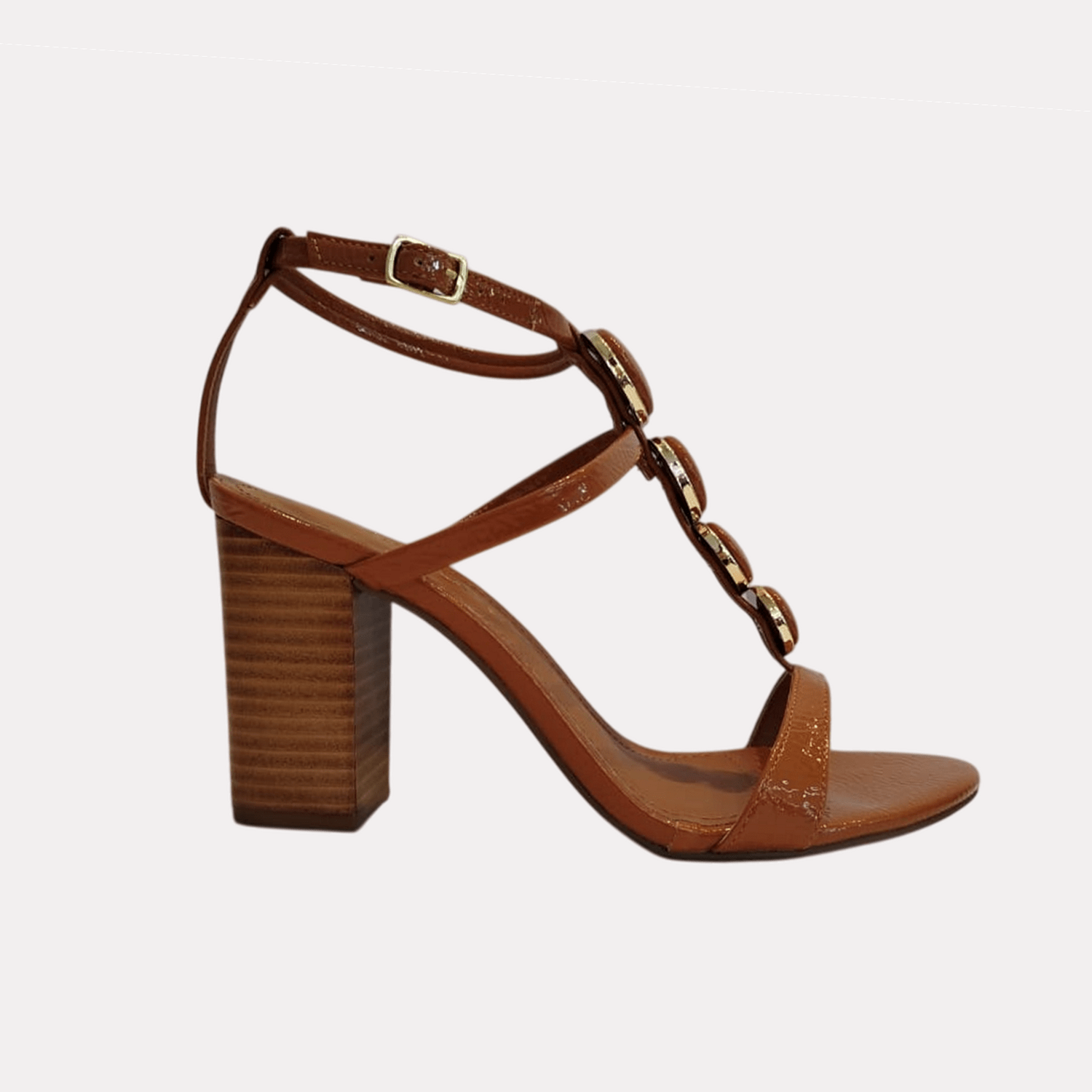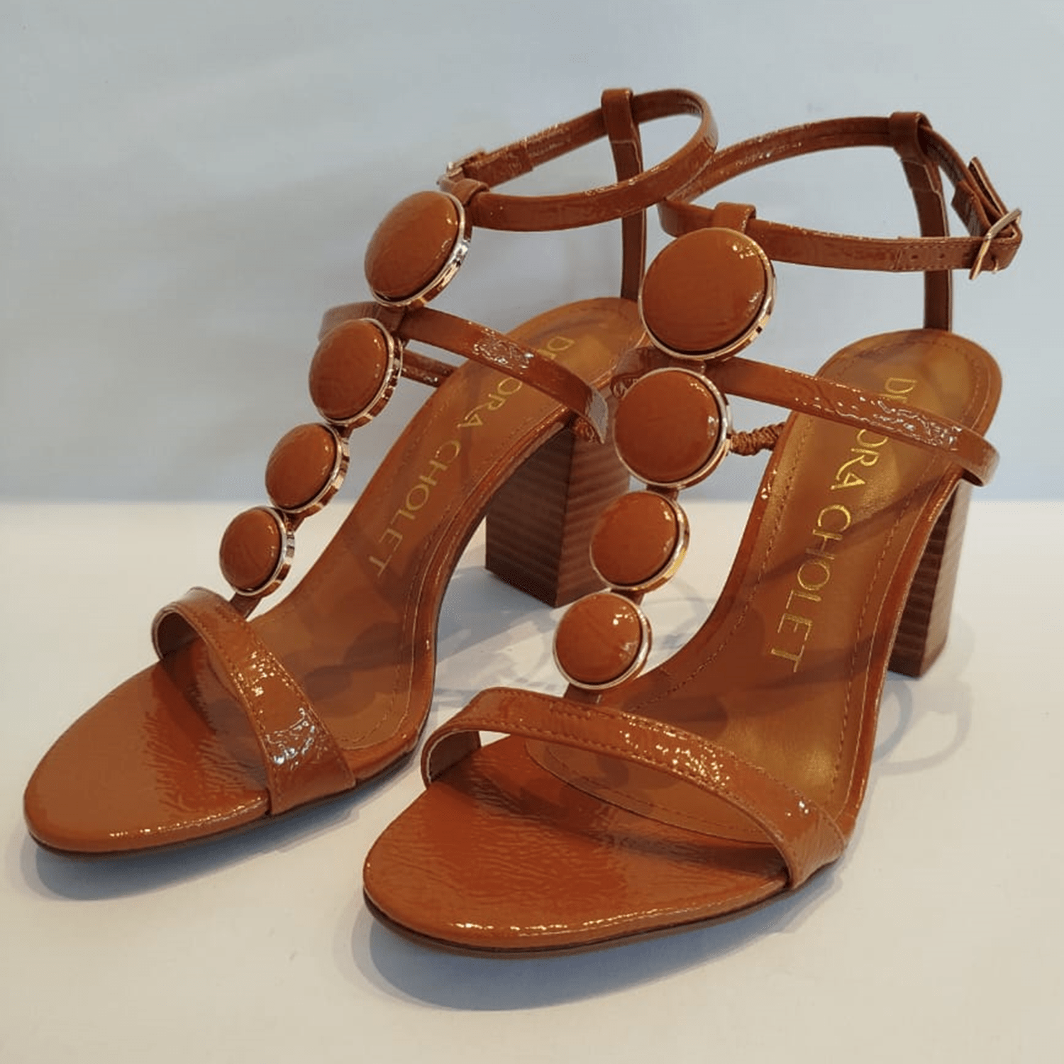 - Detalhes do modelo: Sandália salto bloco com fivela para ajuste no tornozelo. Adornada na frente com esferas que lembram botões forrados no mesmo material da sandália.