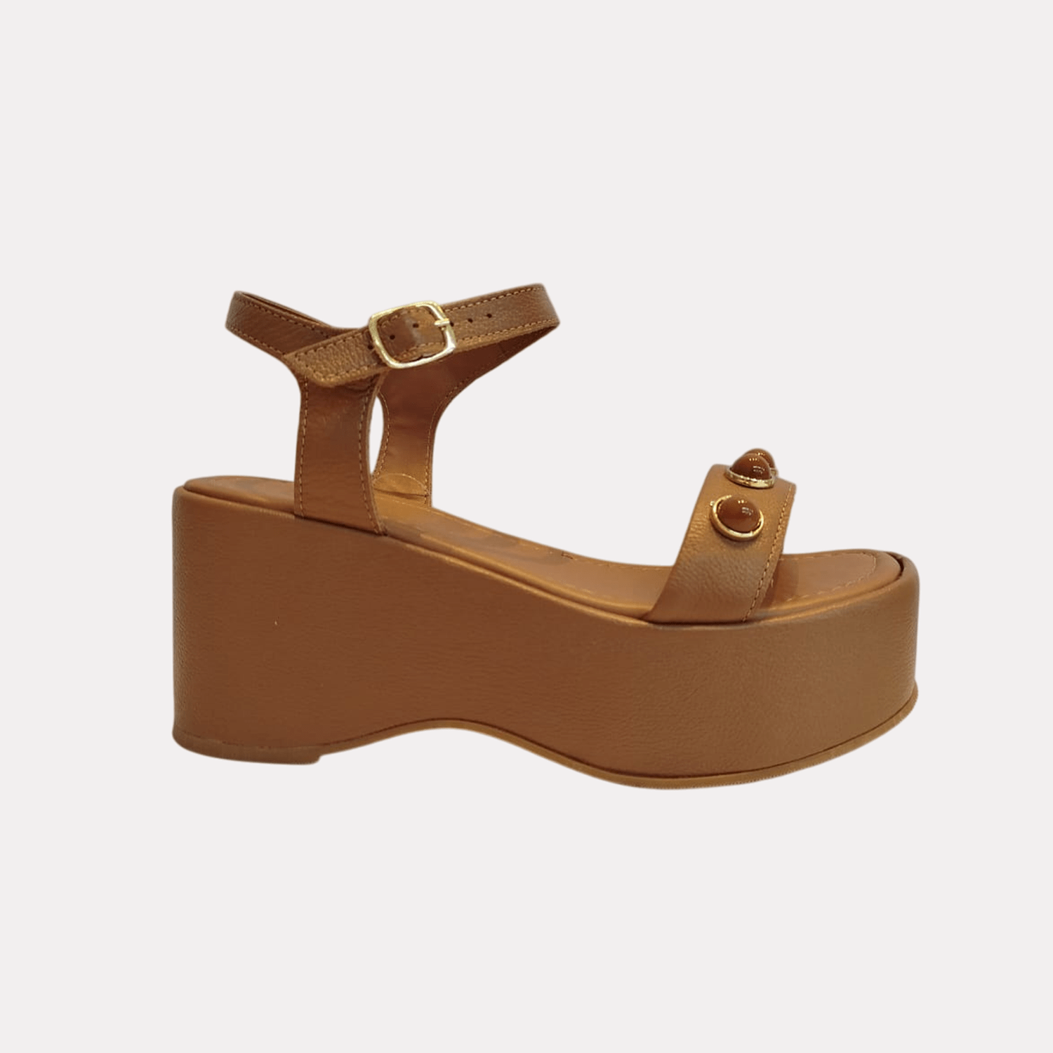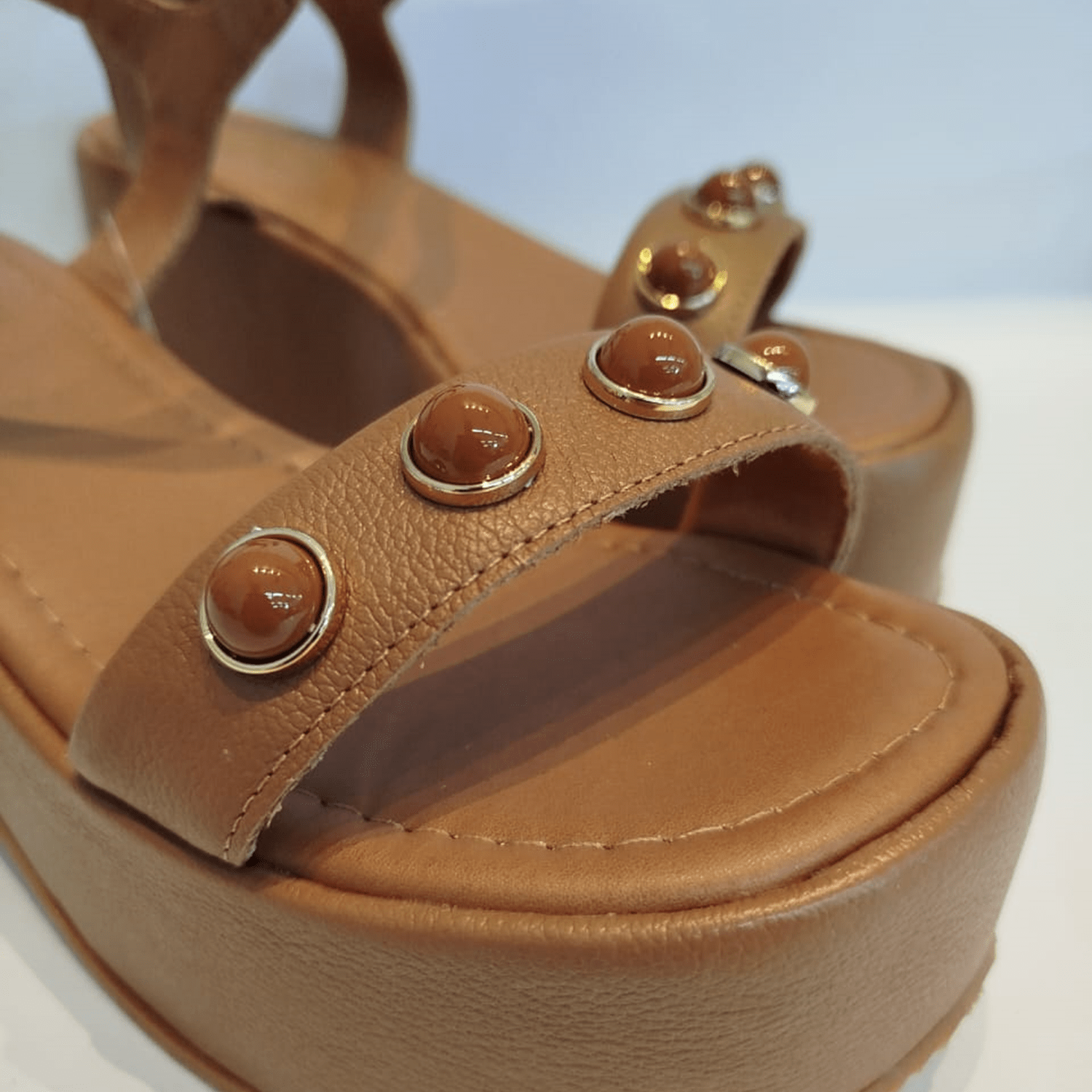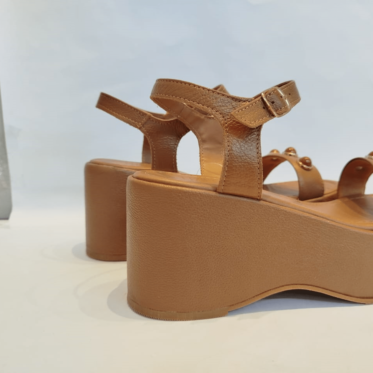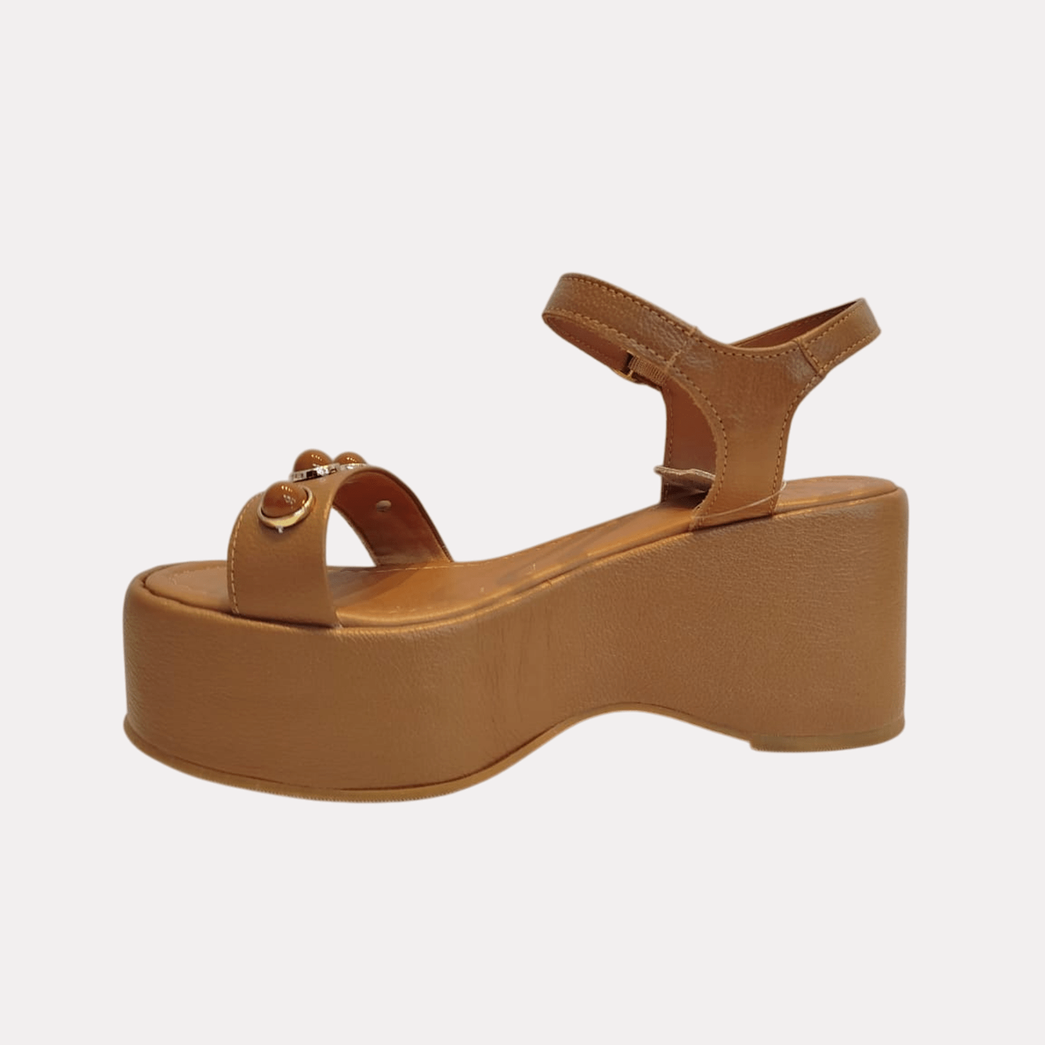 - Detalhes do modelo: Sandália plataforma na cor caramelo. O modelo tem um salto alto e robusto, com a plataforma se estendendo por toda a sola do sapato, o que proporciona mais estabilidade do que um salto fino. A sandália tem uma tira no tornozelo com uma fivela ajustável, além de uma tira na parte da frente do pé com detalhes aplicados na tira frontal.