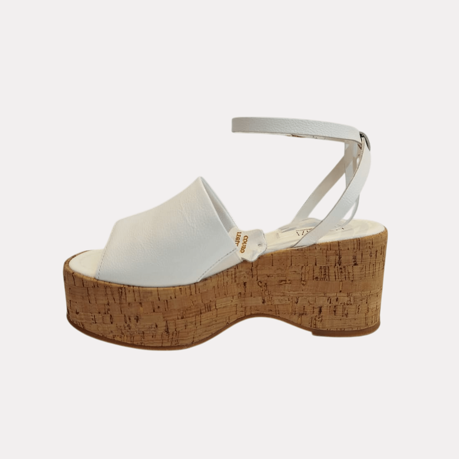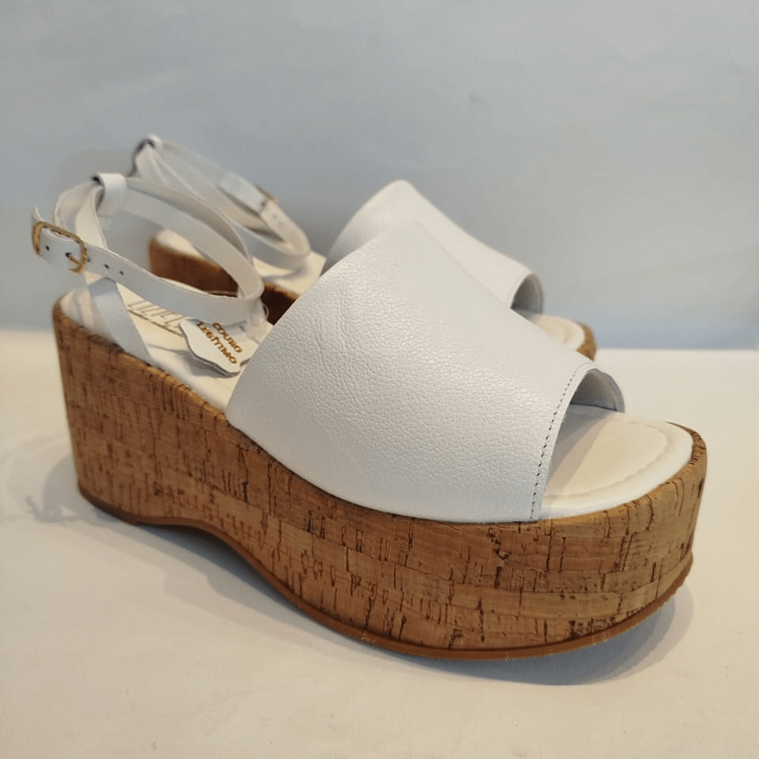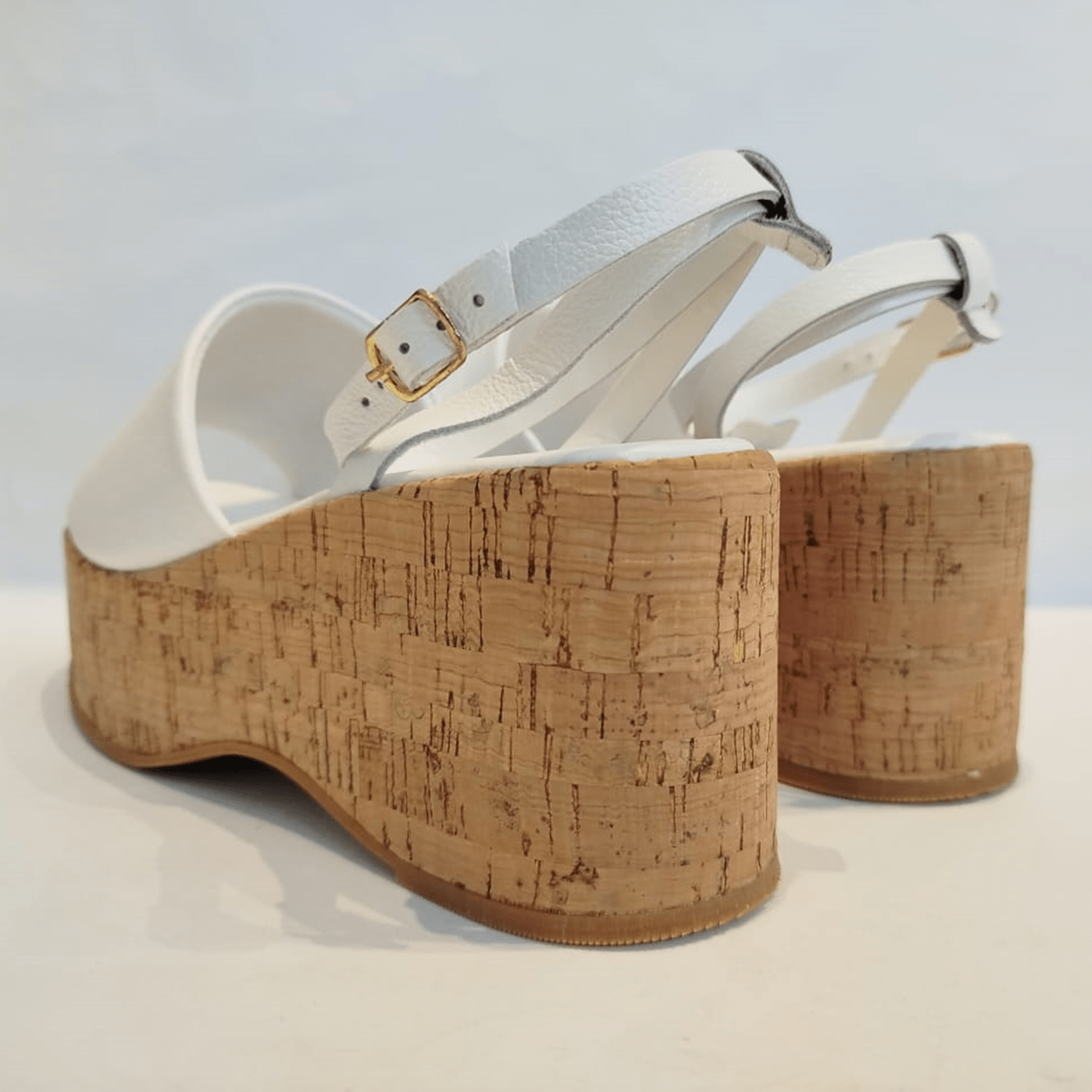 - Detalhes do modelo: Sandália plataforma com um salto alto e inteiro revestido de cortiça. A parte de cima é na cor branca com uma tira larga que cobre o peito do pé e uma tira fina no tornozelo com fivela. A combinação do branco com a cortiça dá um visual leve e de verão ao calçado.