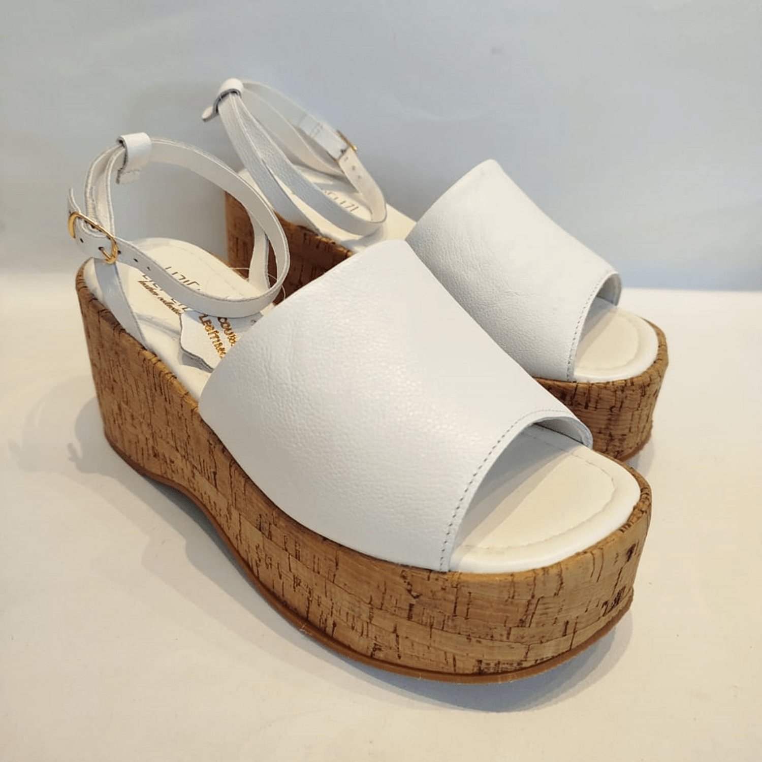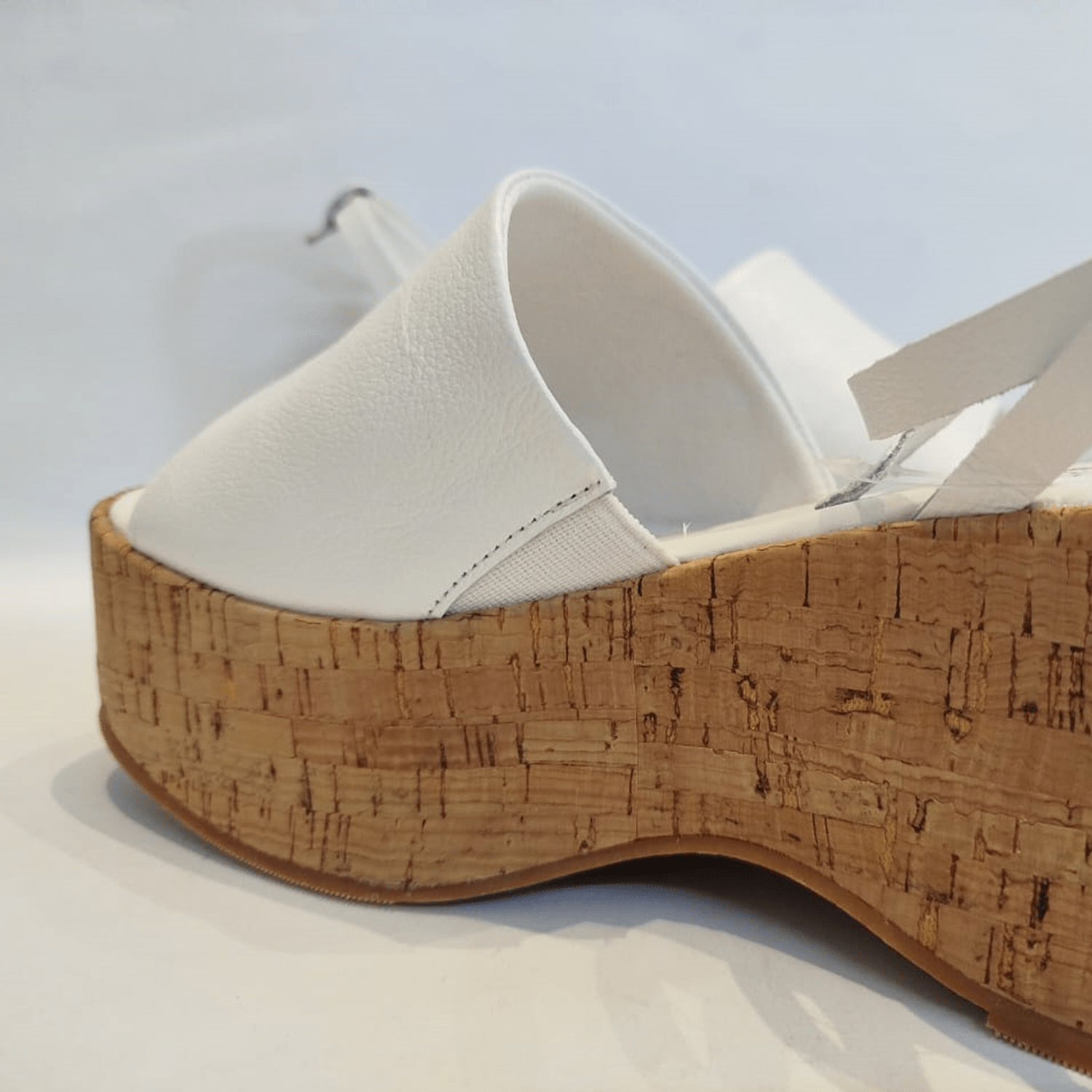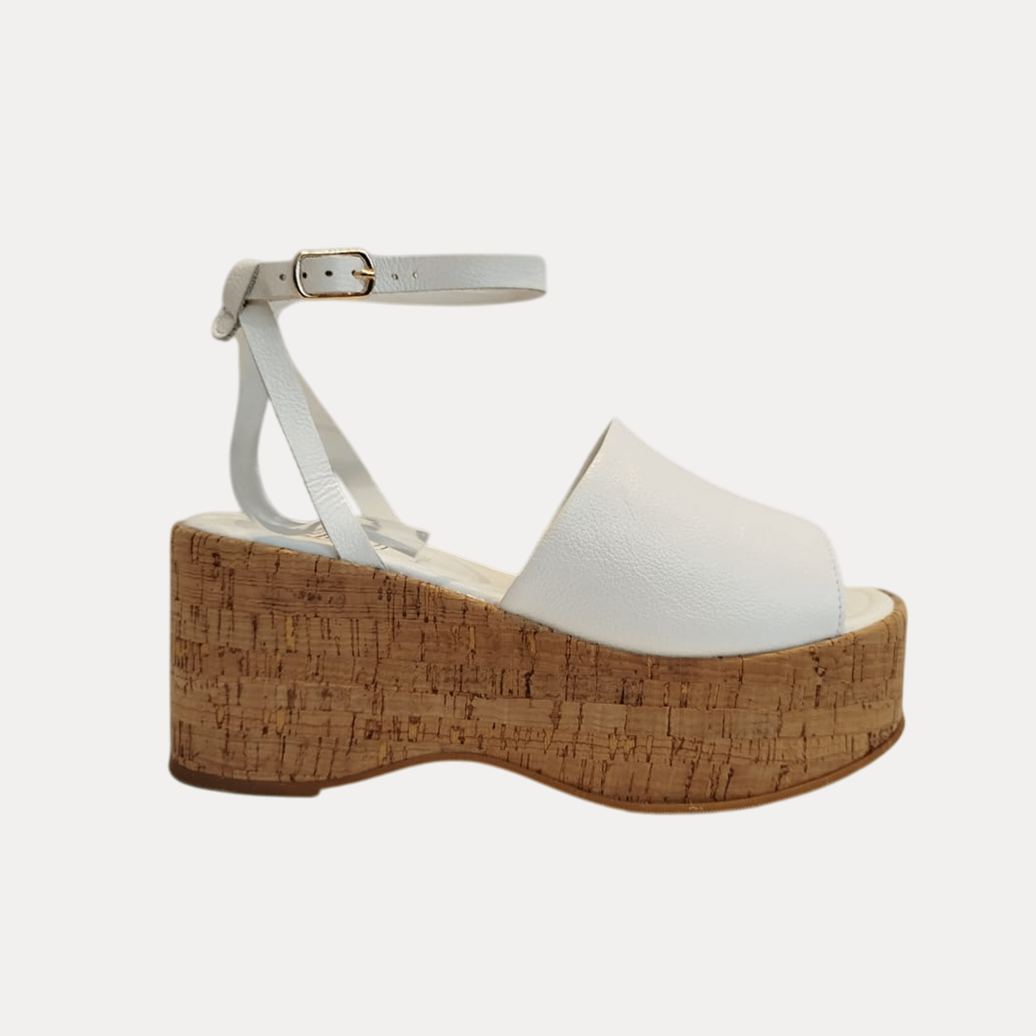 - Detalhes do modelo: Sandália plataforma com um salto alto e inteiro revestido de cortiça. A parte de cima é na cor branca com uma tira larga que cobre o peito do pé e uma tira fina no tornozelo com fivela. A combinação do branco com a cortiça dá um visual leve e de verão ao calçado.