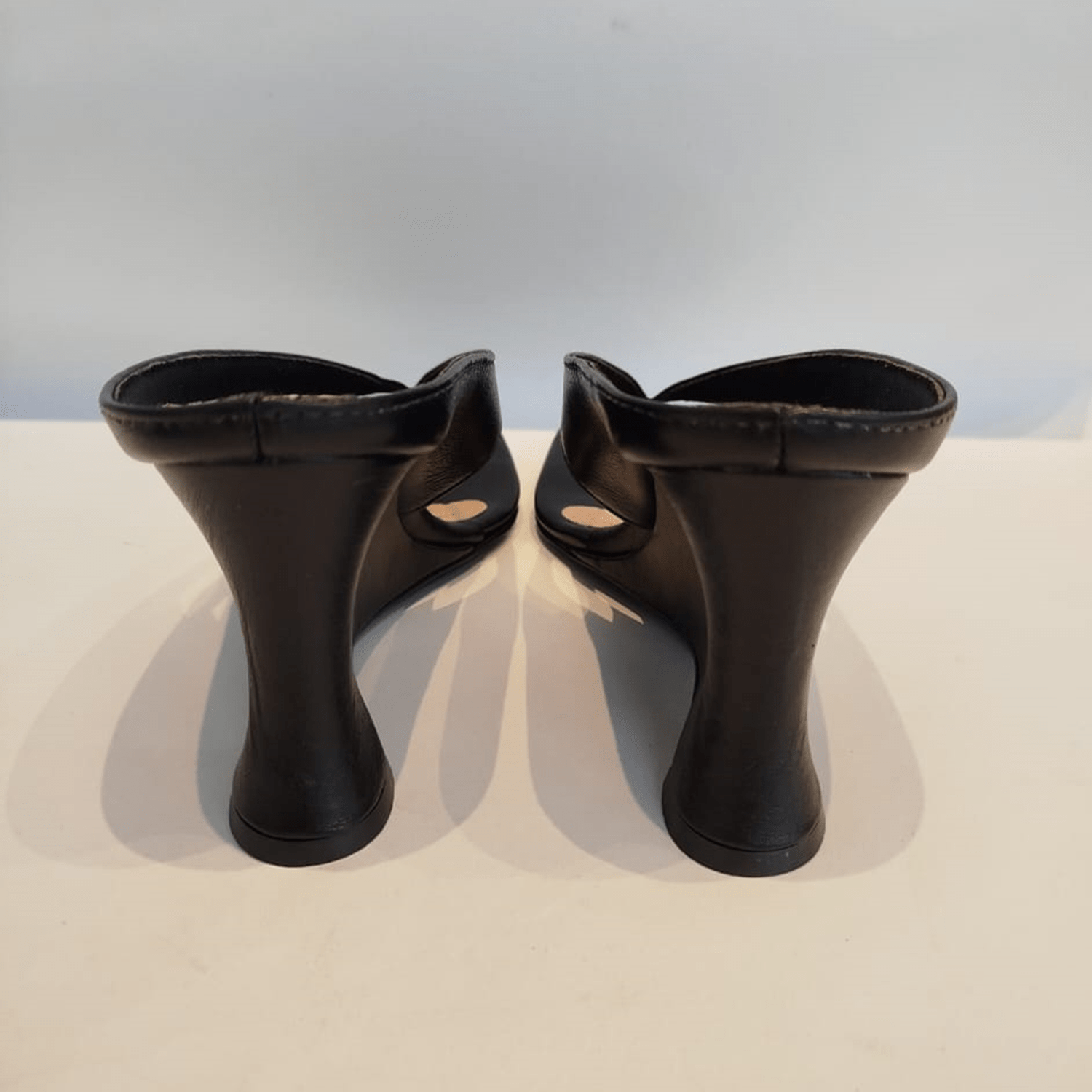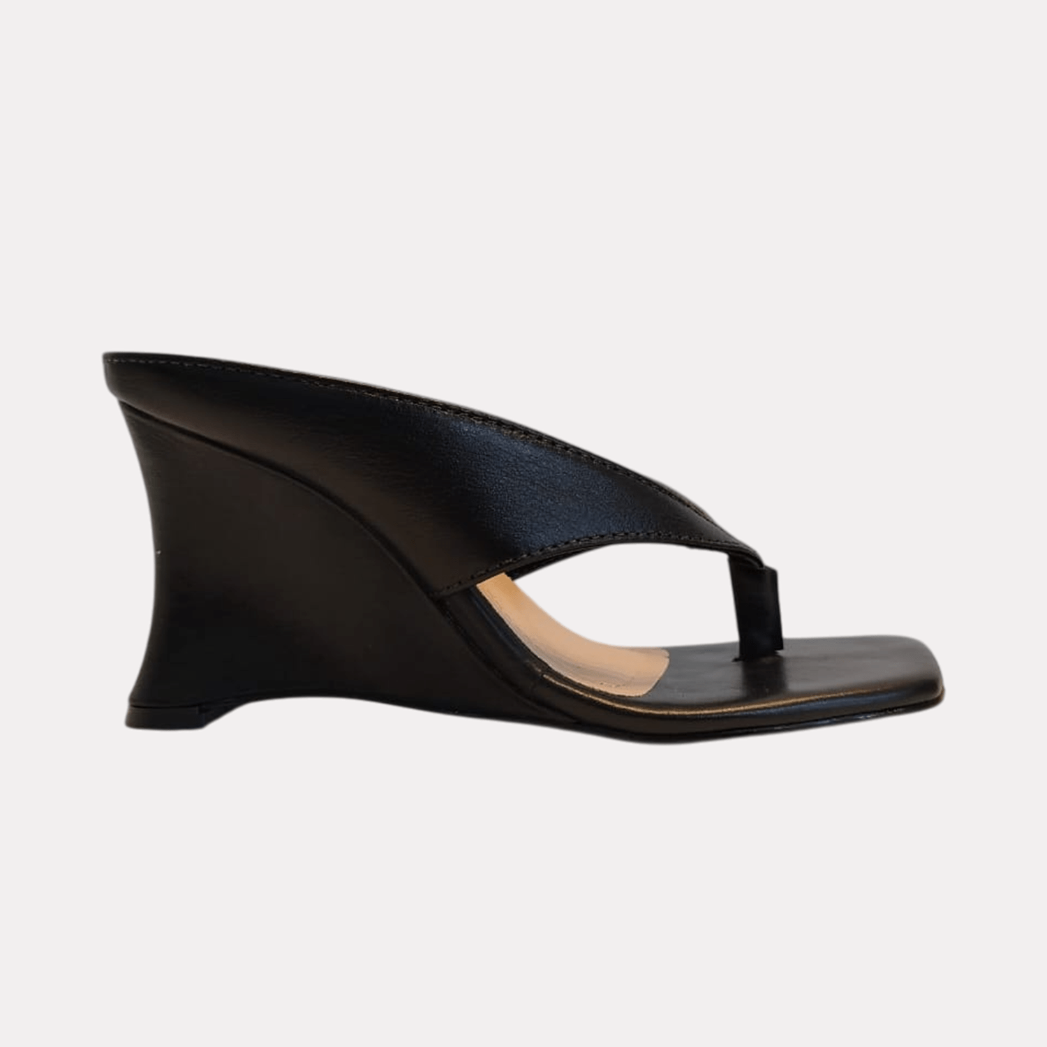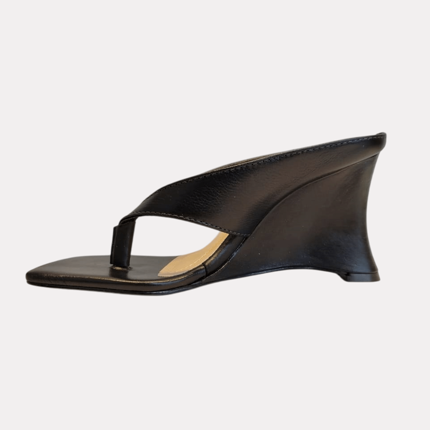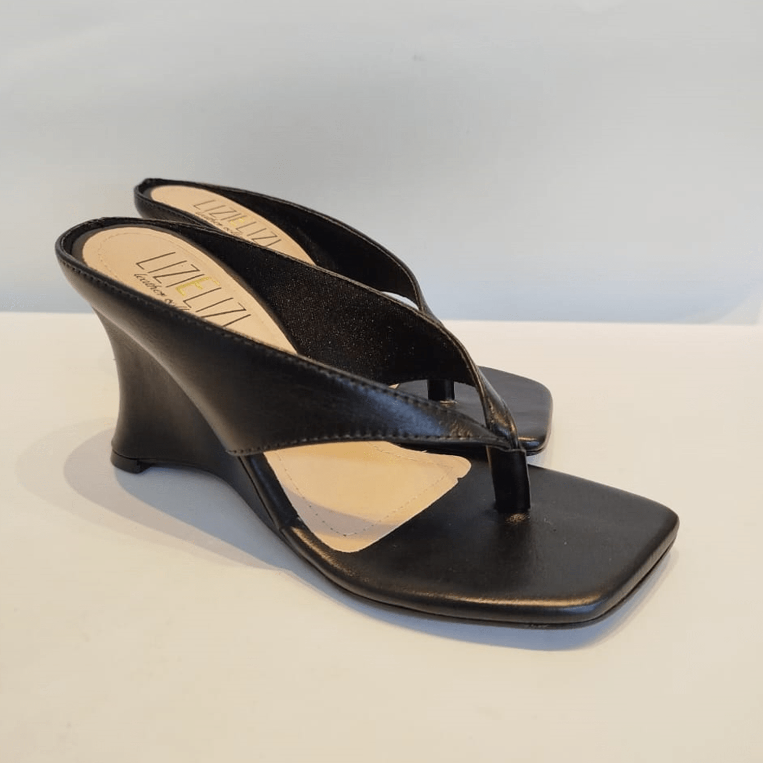 - Detalhes do modelo: Sandália de salto anabela. O modelo tem bico quadrado, com uma tira de dedo fina e uma tira mais larga sobre o peito do pé. O salto anabela é tem design diferenciado, em formato esculpido.