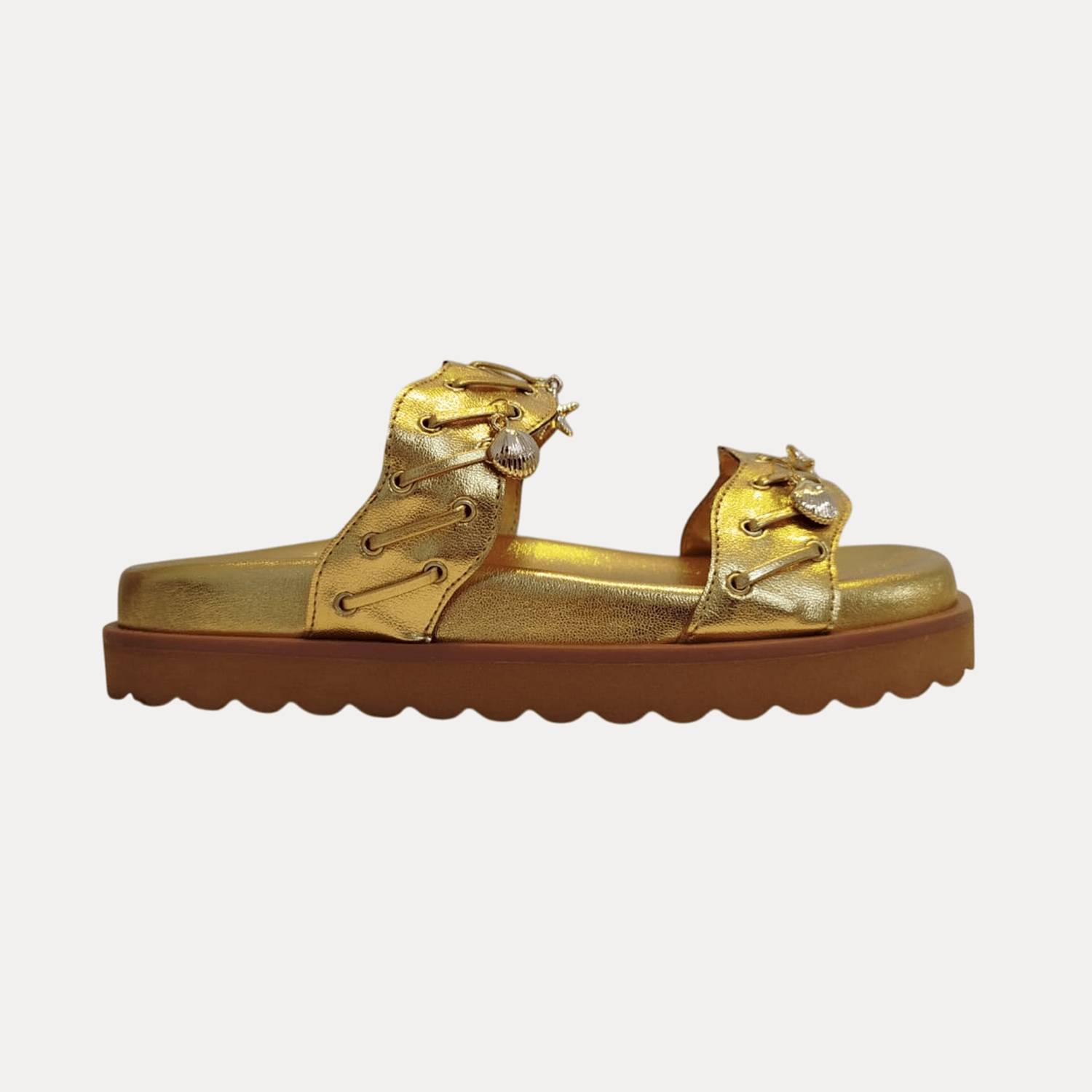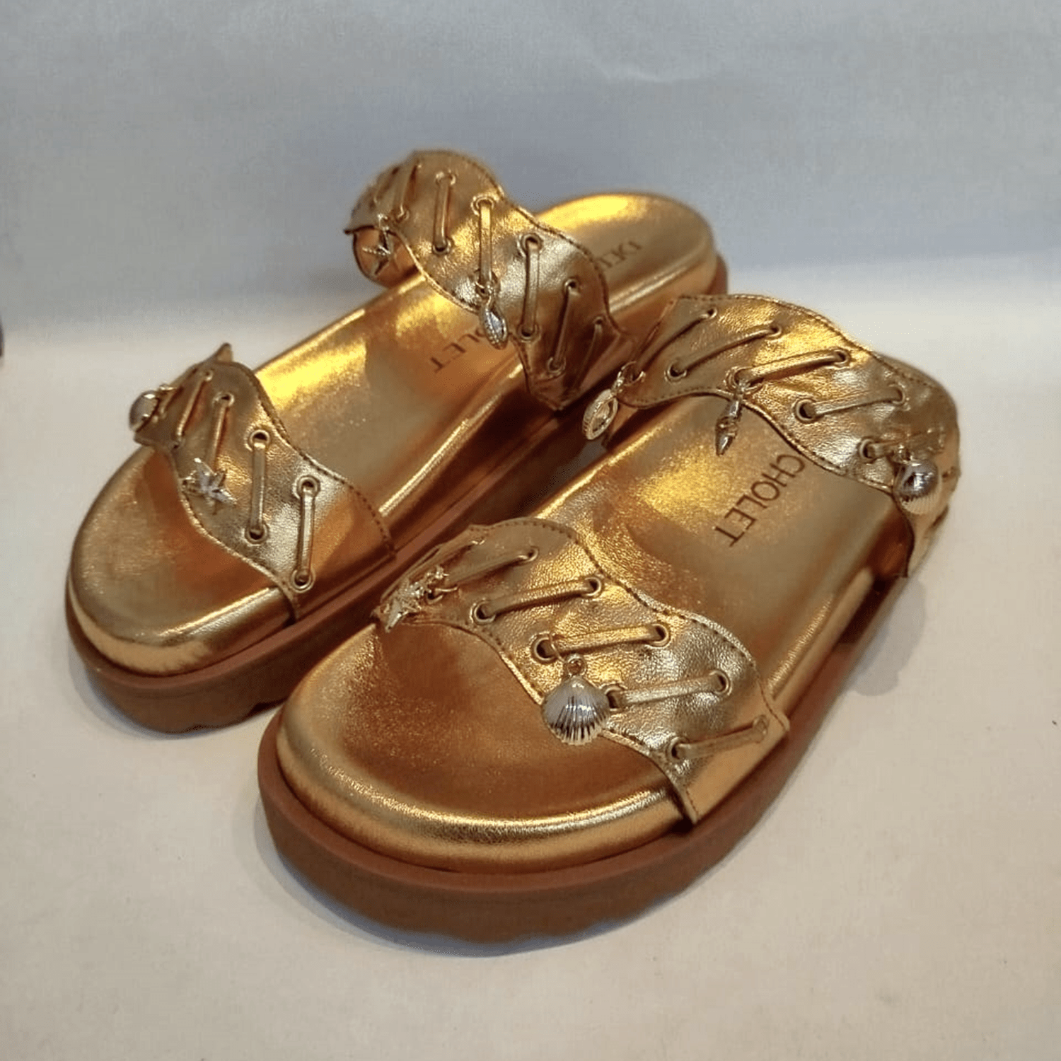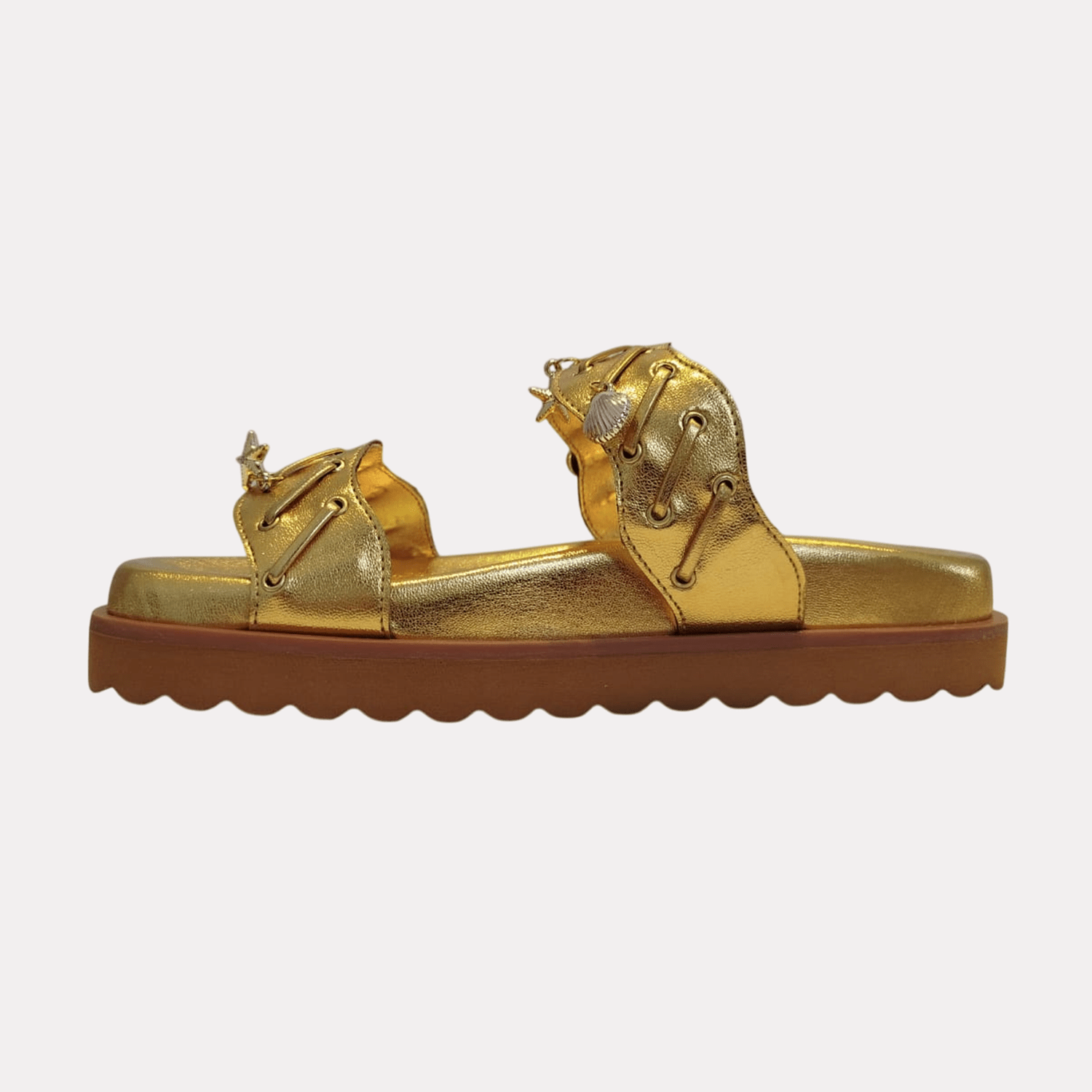 - Detalhes do modelo: Papete feminina com um design moderno e robusto. Possui duas tiras largas adornadas e com aplicação de pingentes metais em formato de conchas e estrelas do mar. Solado com design que acomoda e se adapta aos pés.
