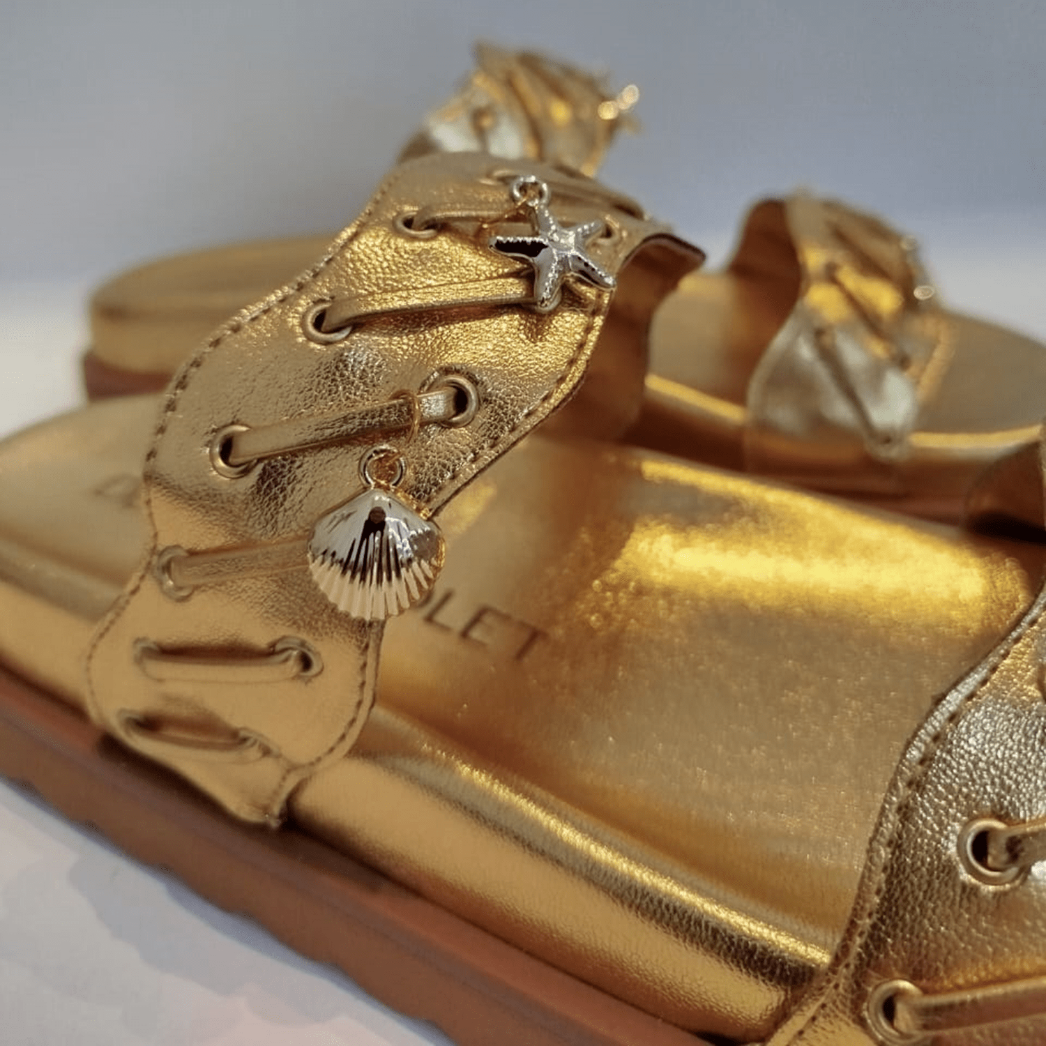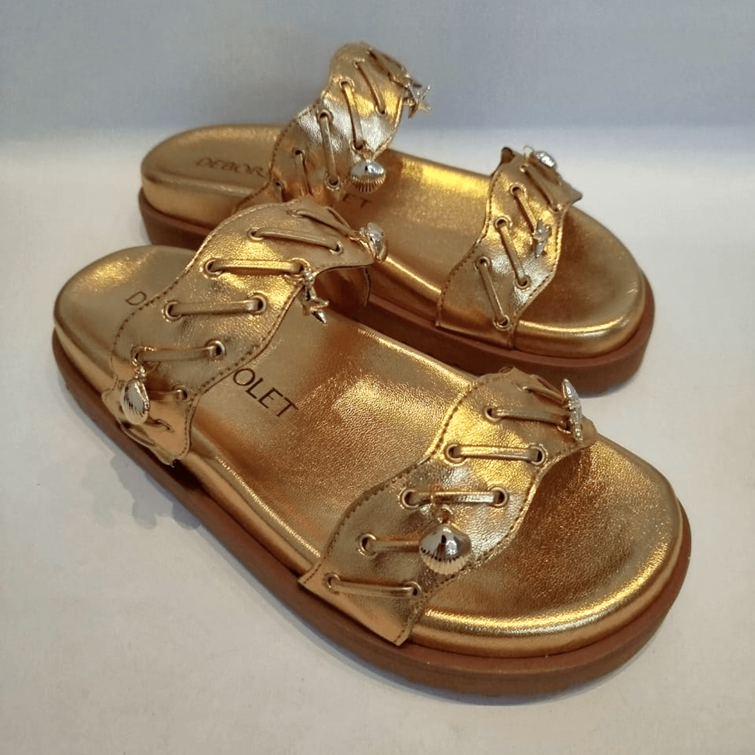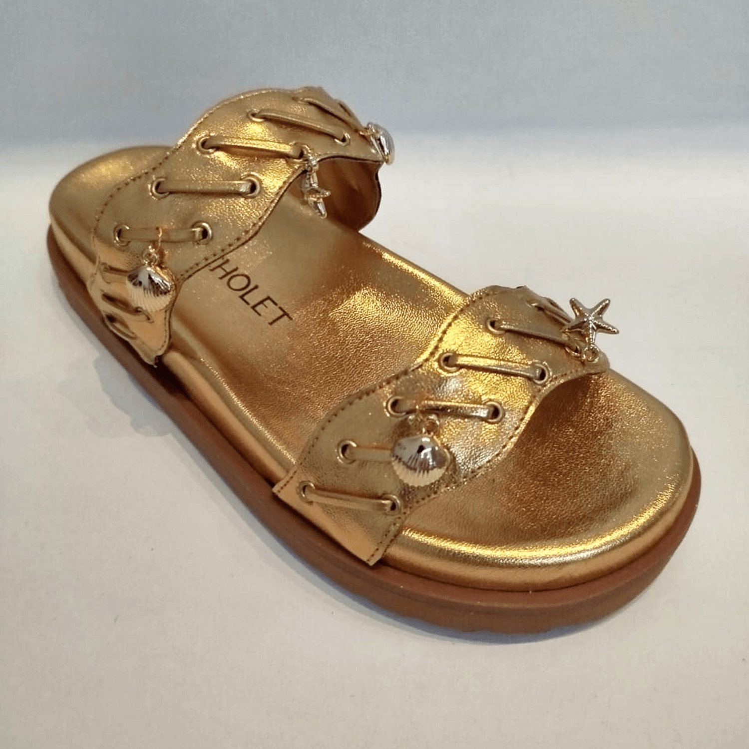 - Detalhes do modelo: Papete feminina com um design moderno e robusto. Possui duas tiras largas adornadas e com aplicação de pingentes metais em formato de conchas e estrelas do mar. Solado com design que acomoda e se adapta aos pés.