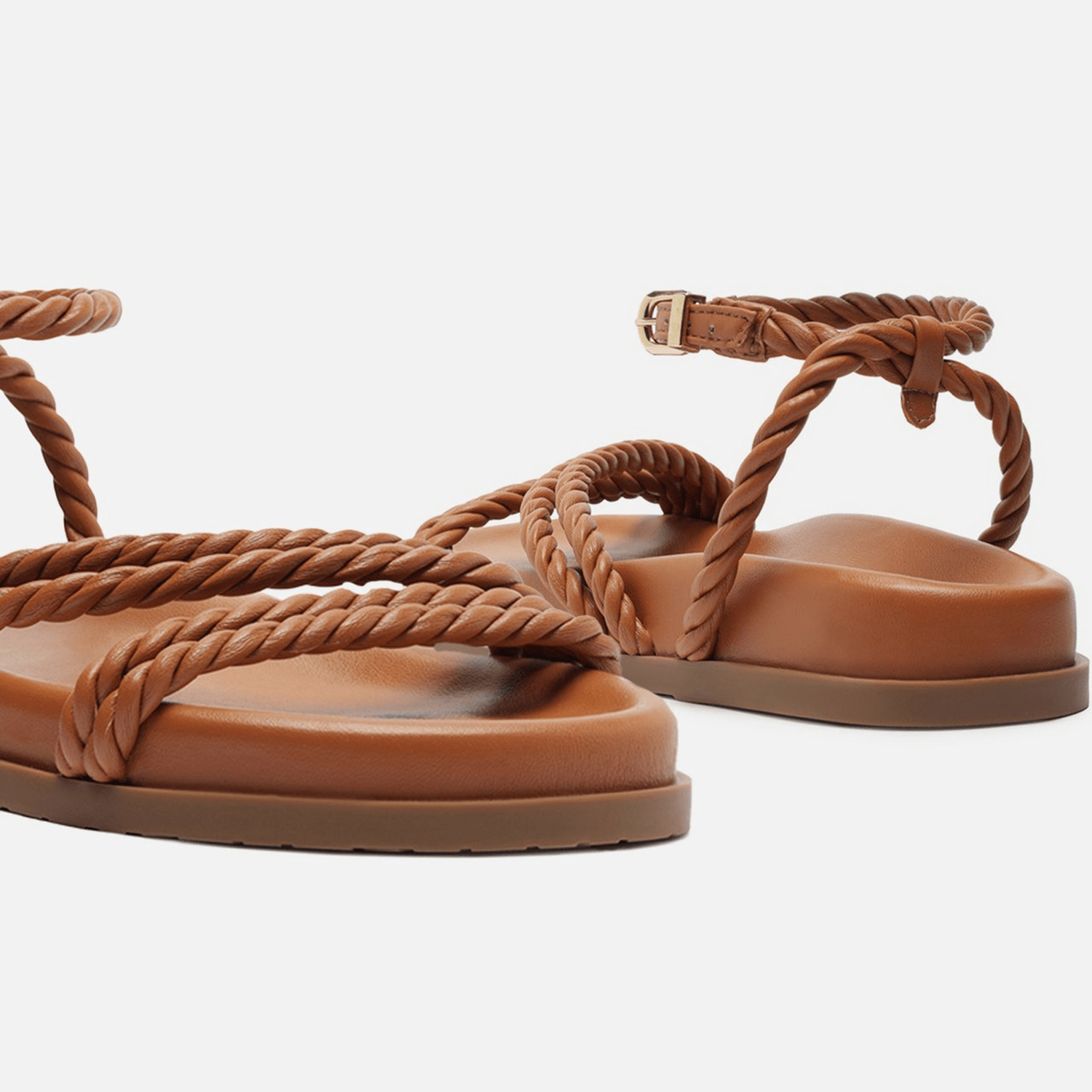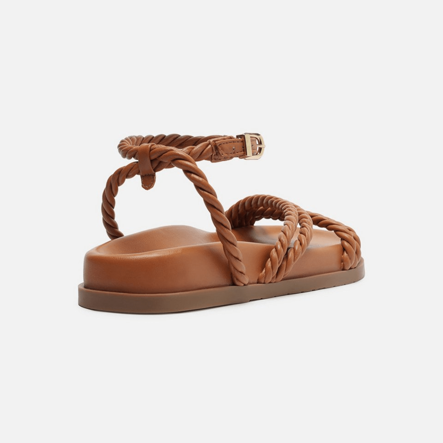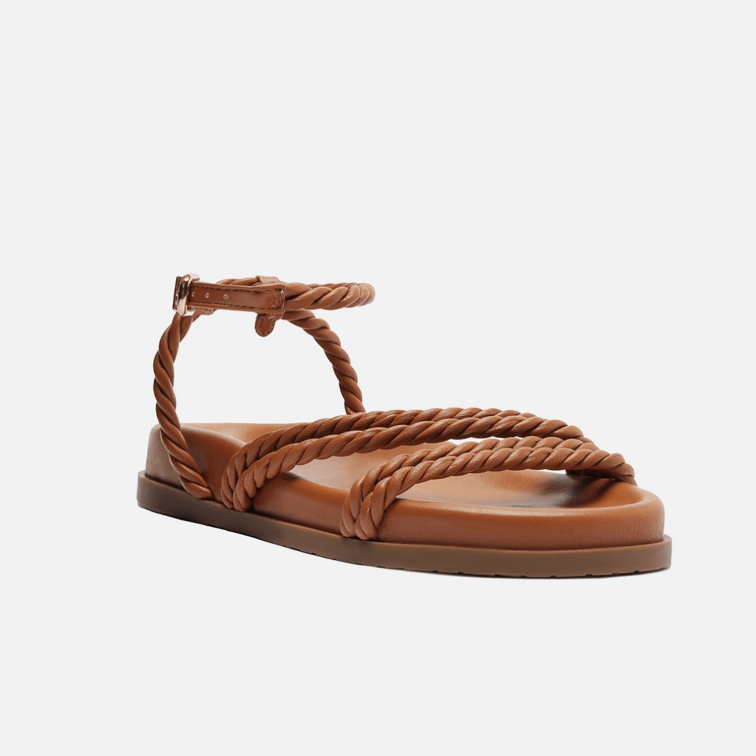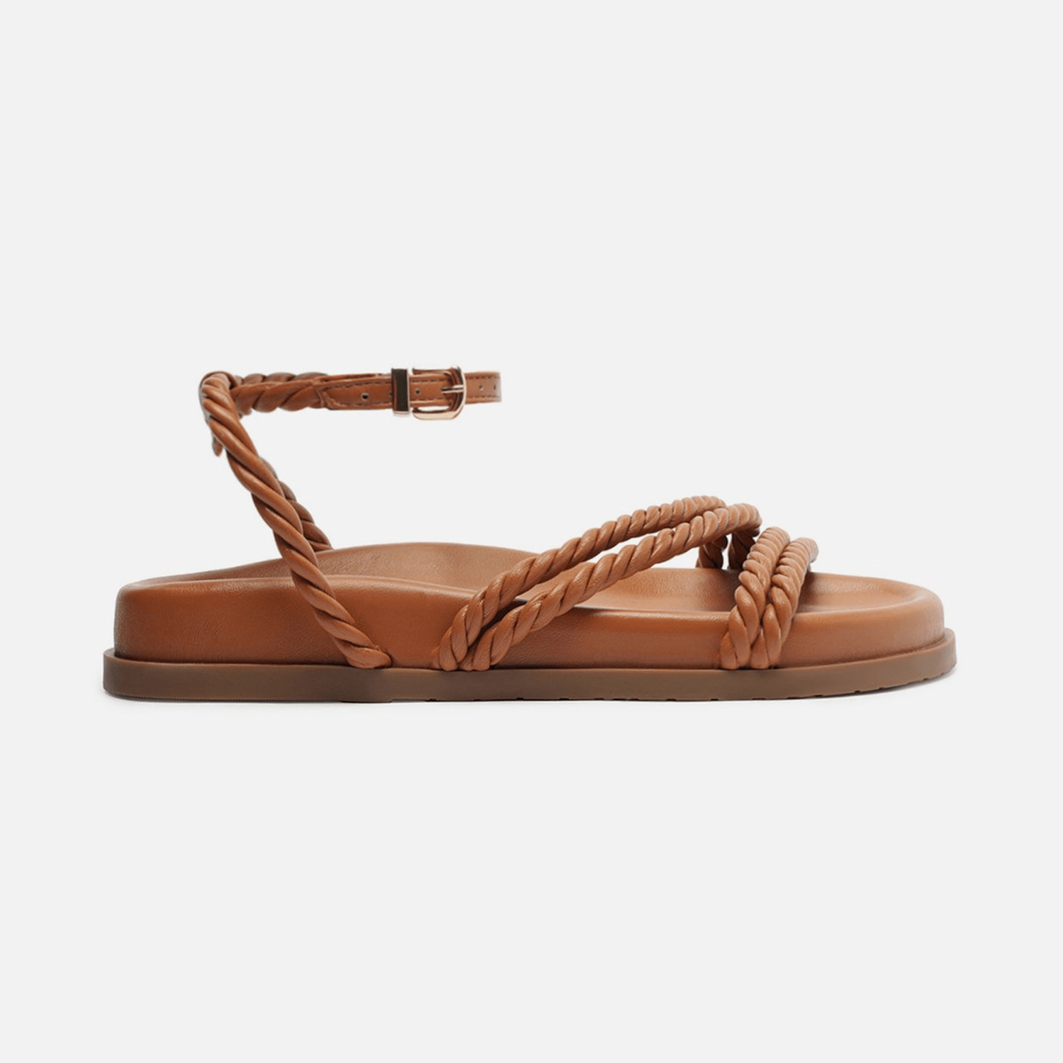 Sandália papete marrom. O modelo tem salto rasteiro e palmilha com formato anatômico e inscrição do nome da marca. Possui solado flatform, base emborrachada marrom e bico redondo. Traz tiras largas trancadas sobre os dedos e o peito do pé. Com tira em torno do calcanhar e fecho em fivela quadrada lateral, deixa todo o pé à mostra.