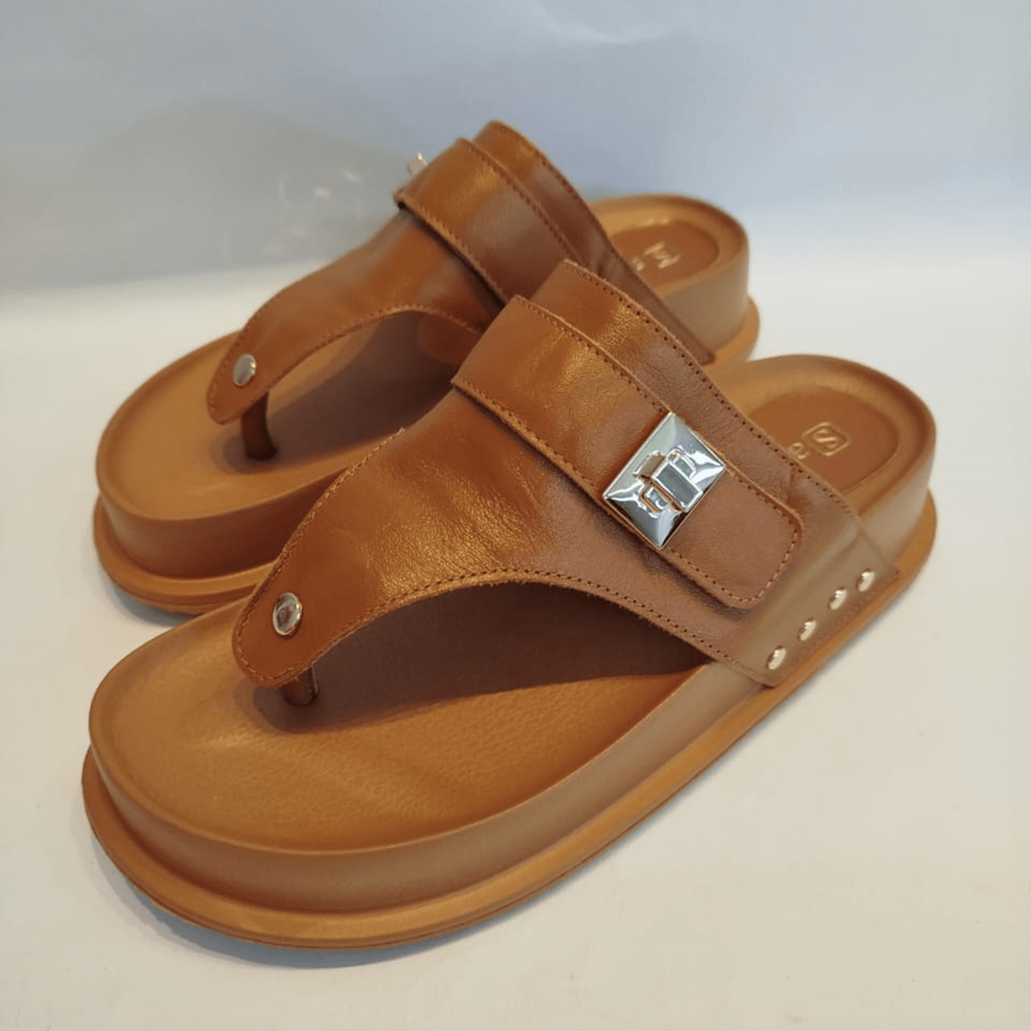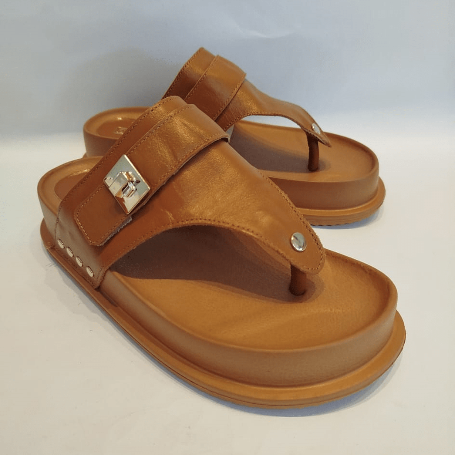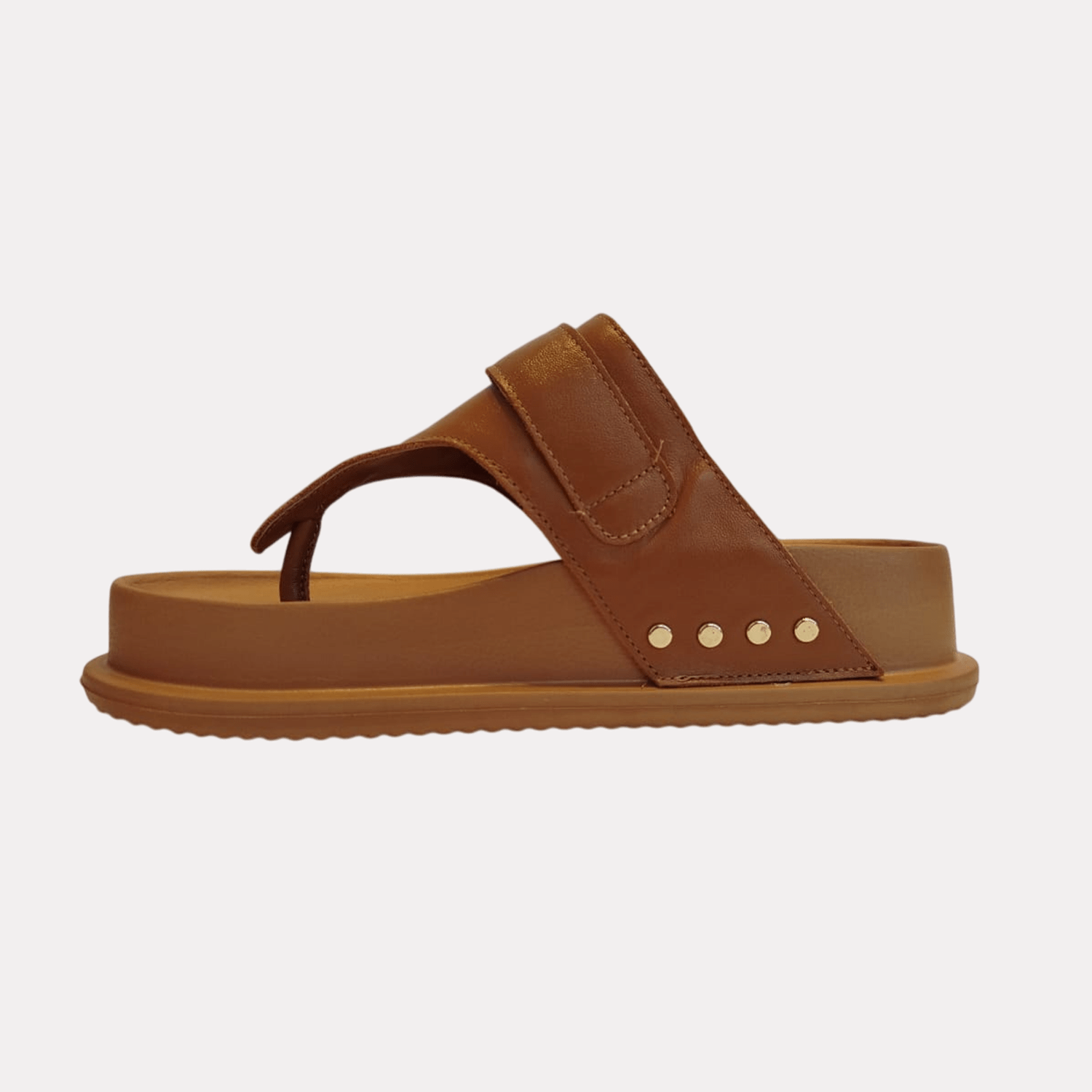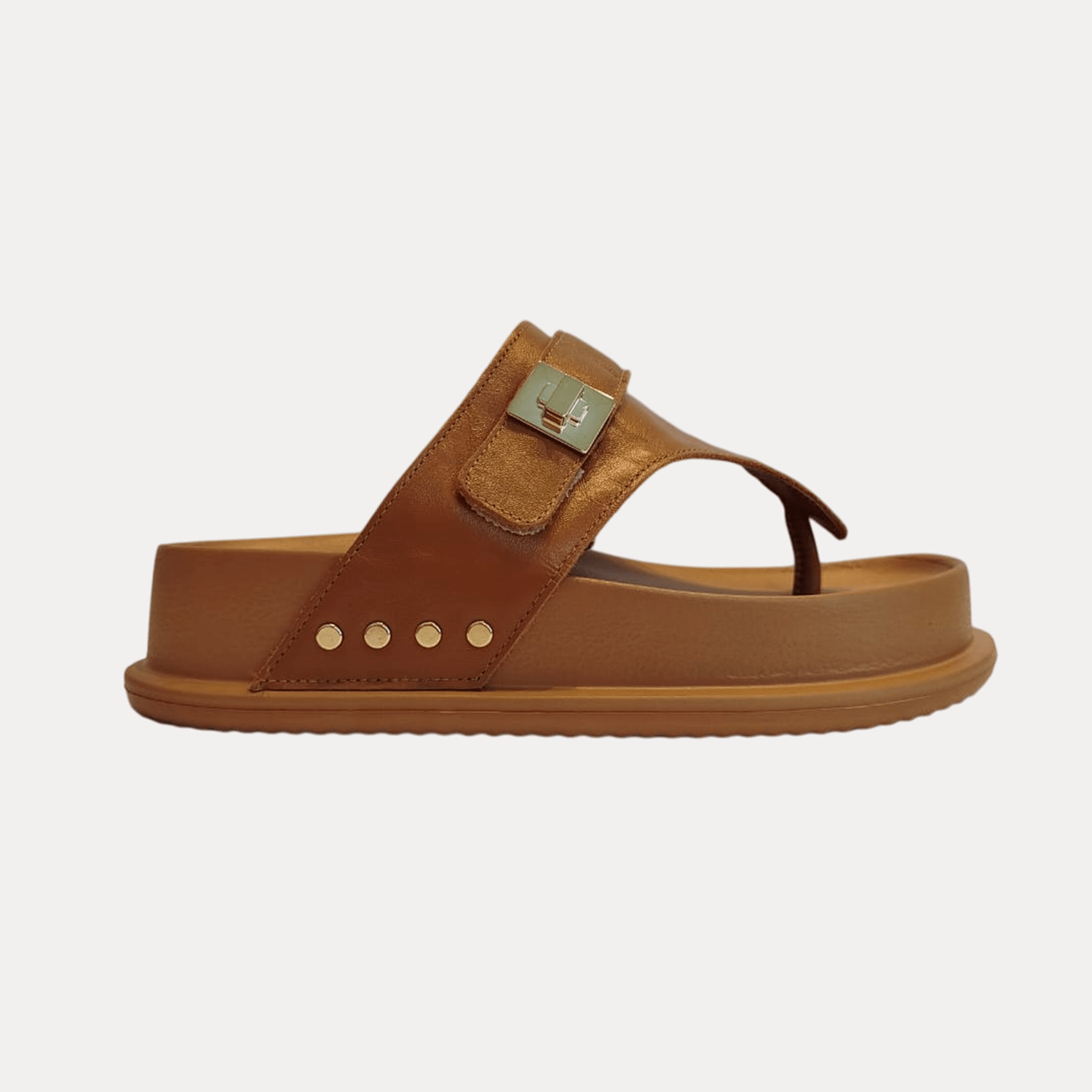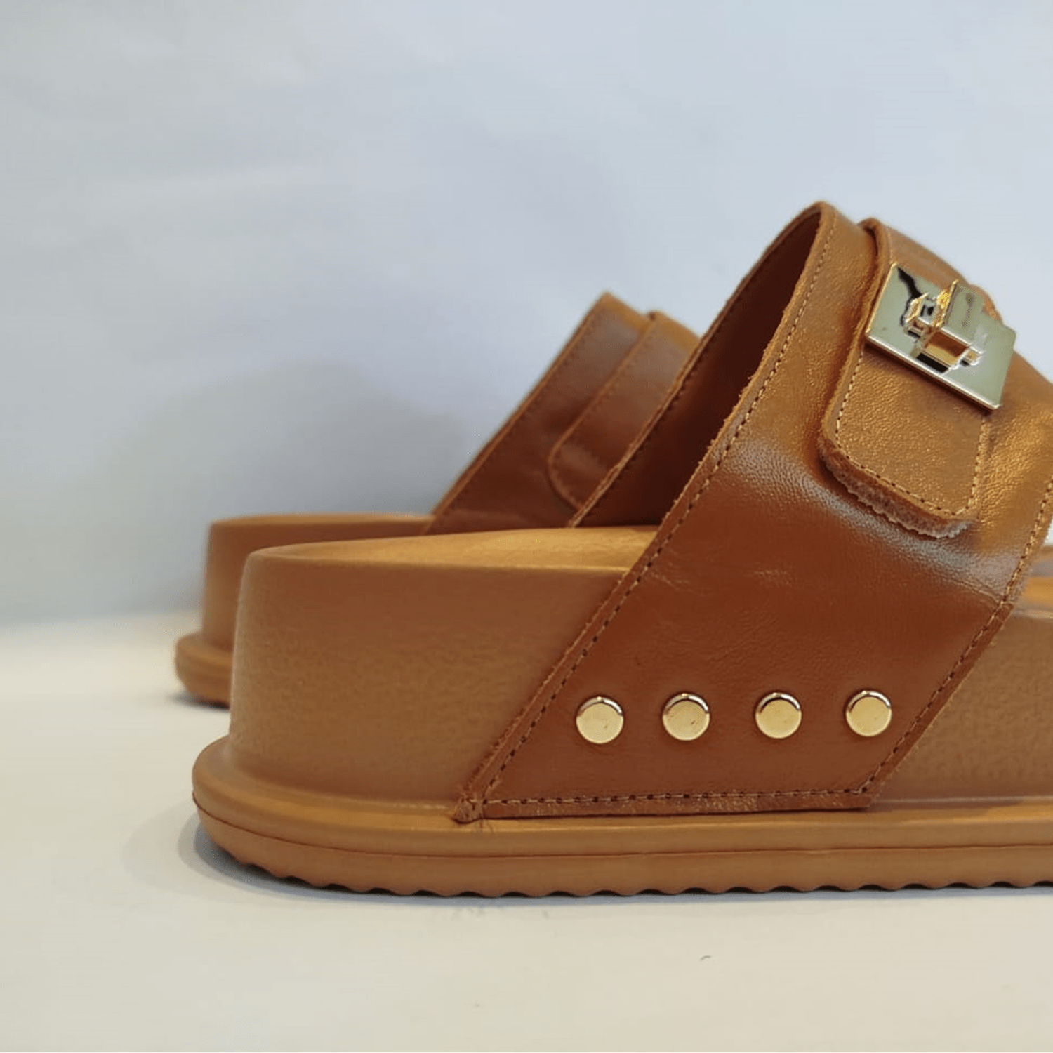 - Detalhes do modelo: Papete feminina com um design moderno e robusto. A tira sobre o pé é feita de couro com detalhe em metal dourado. Na lateral, ela é decorada com tachas redondas douradas. Solado com design que acomoda e se adapta aos pés.