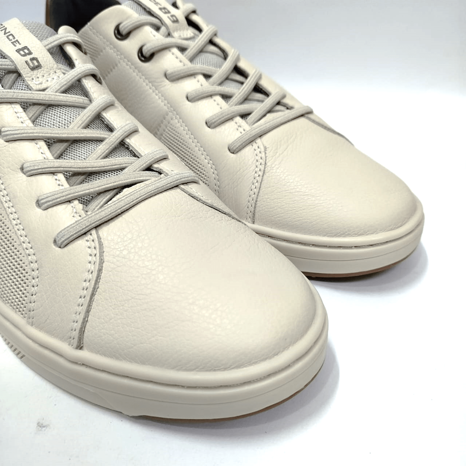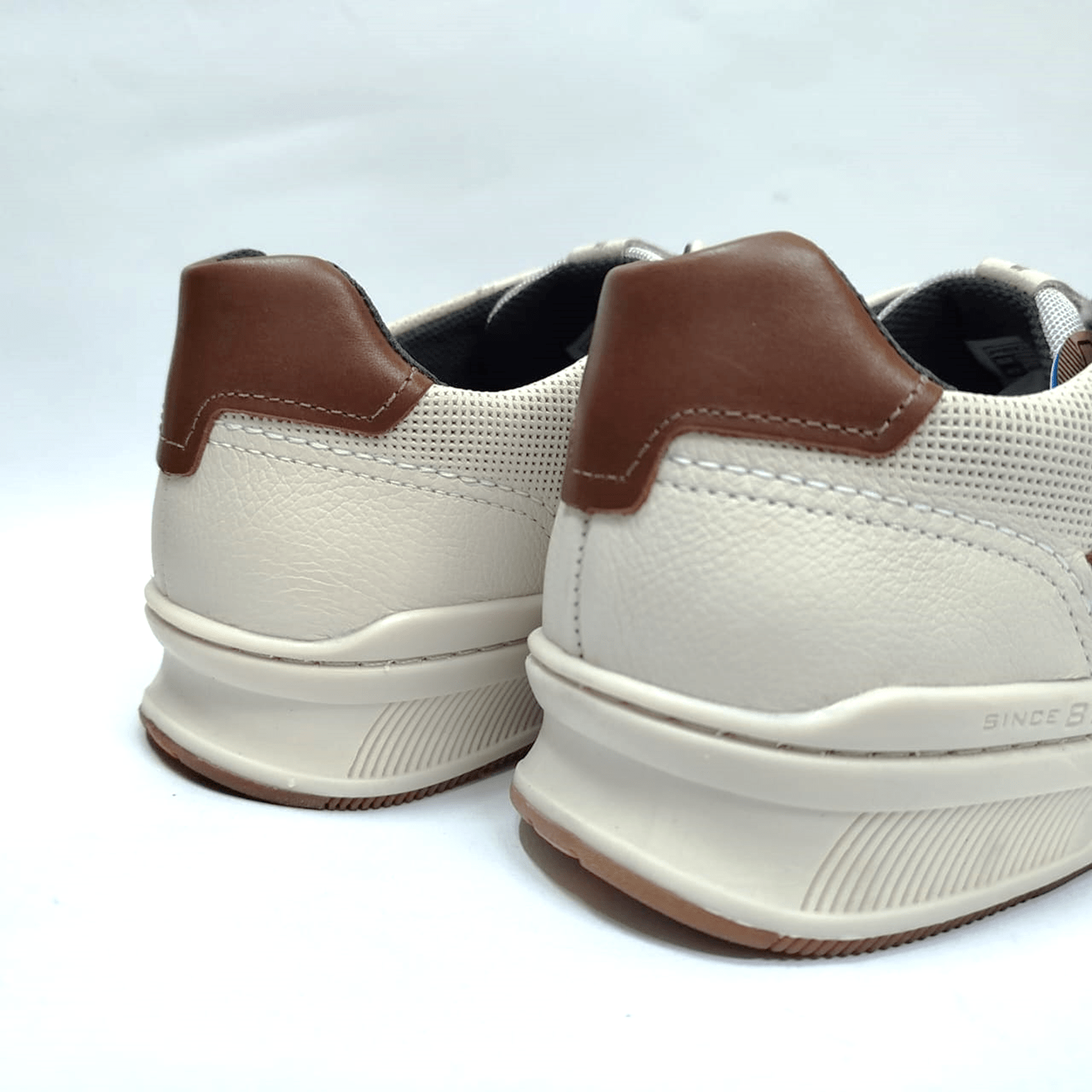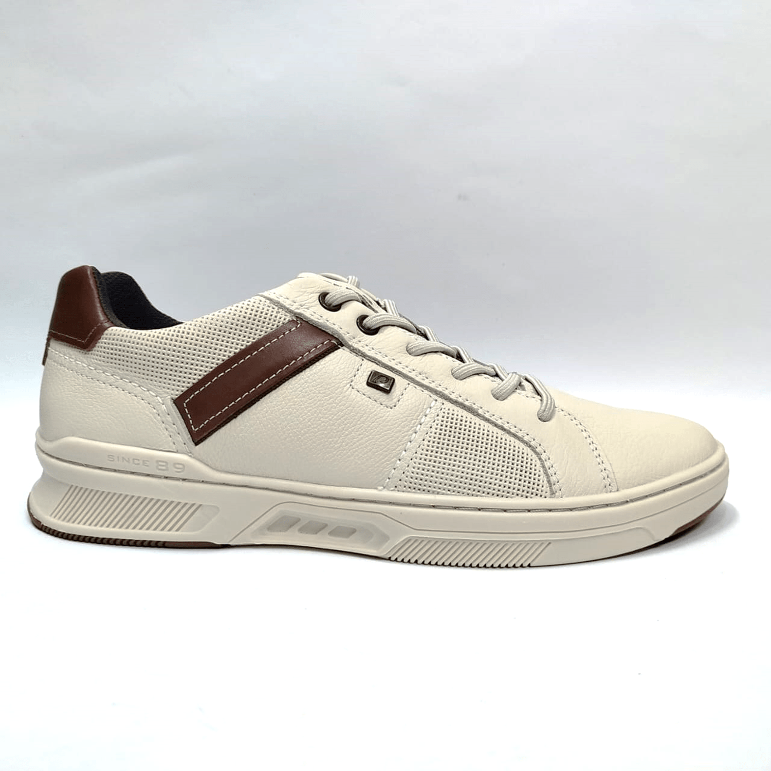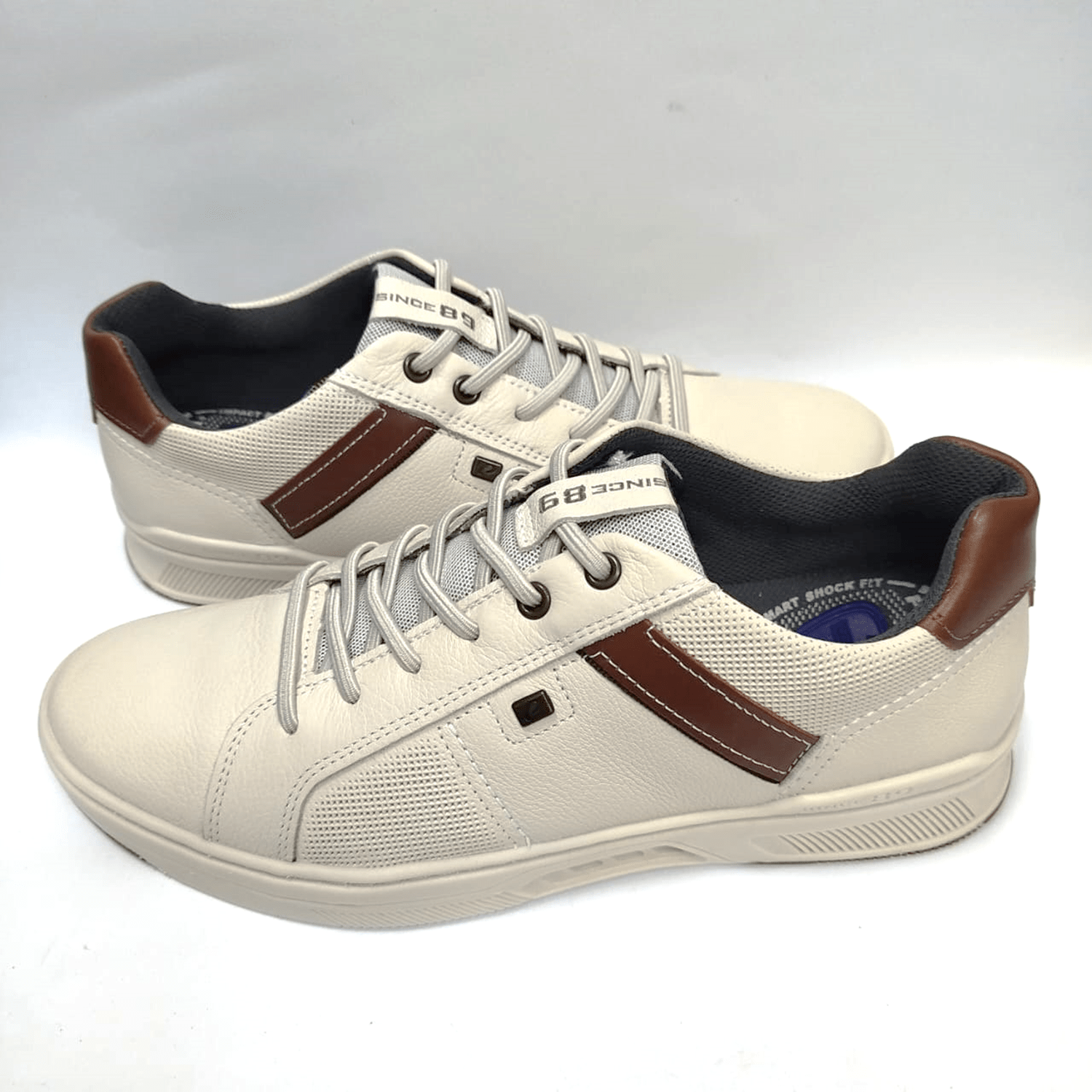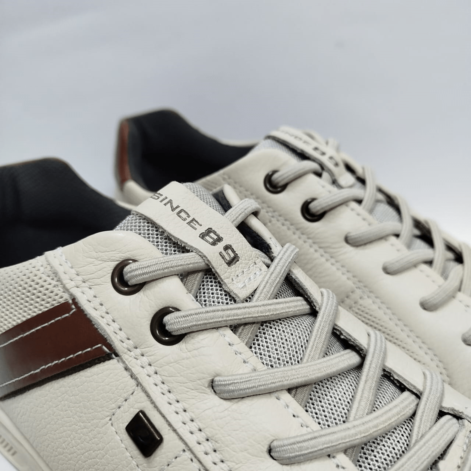 - Detalhes do modelo: Sapatênis em couro, recortes na cor conhaque e cadarço elástico.