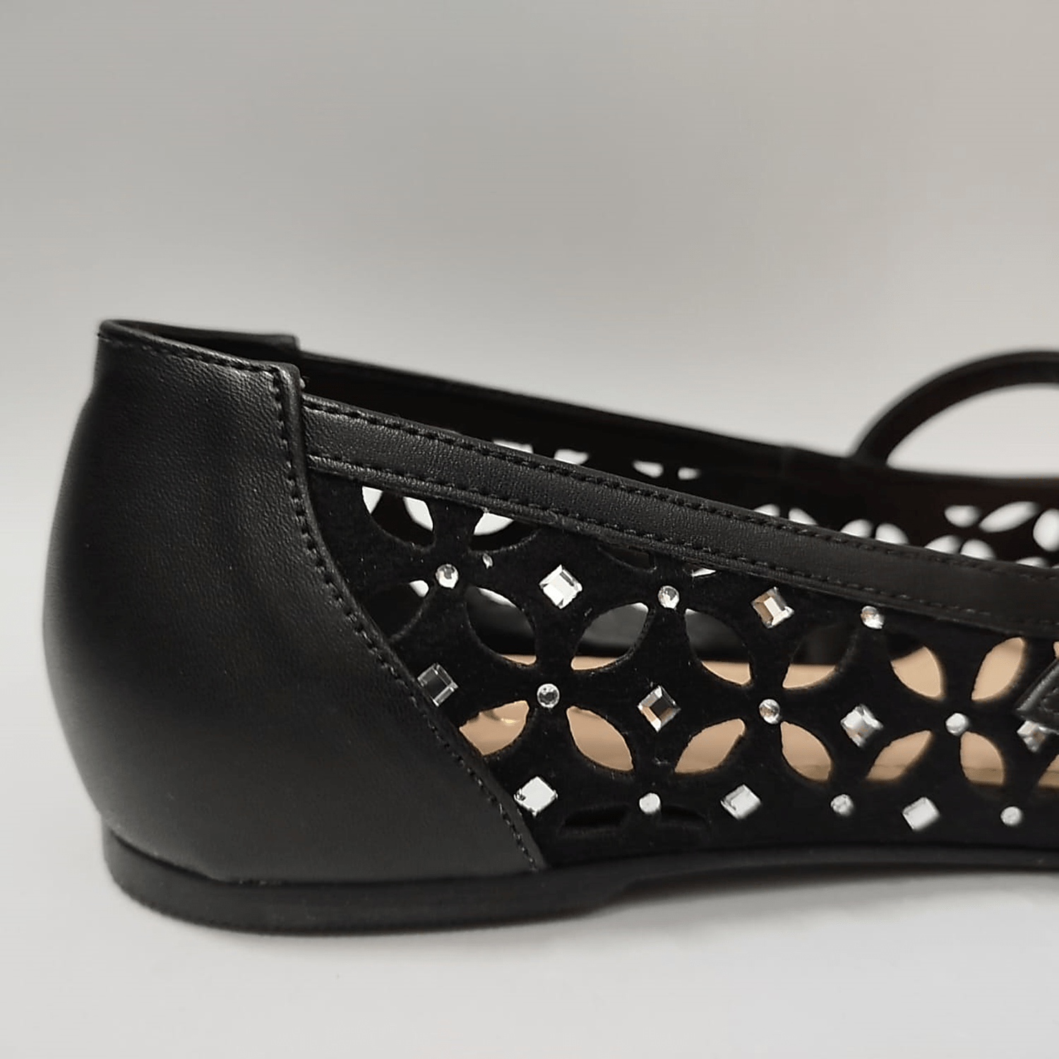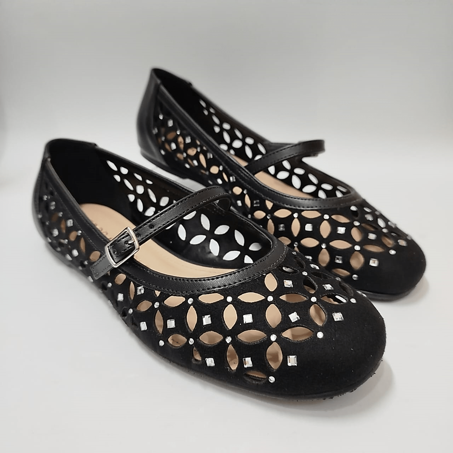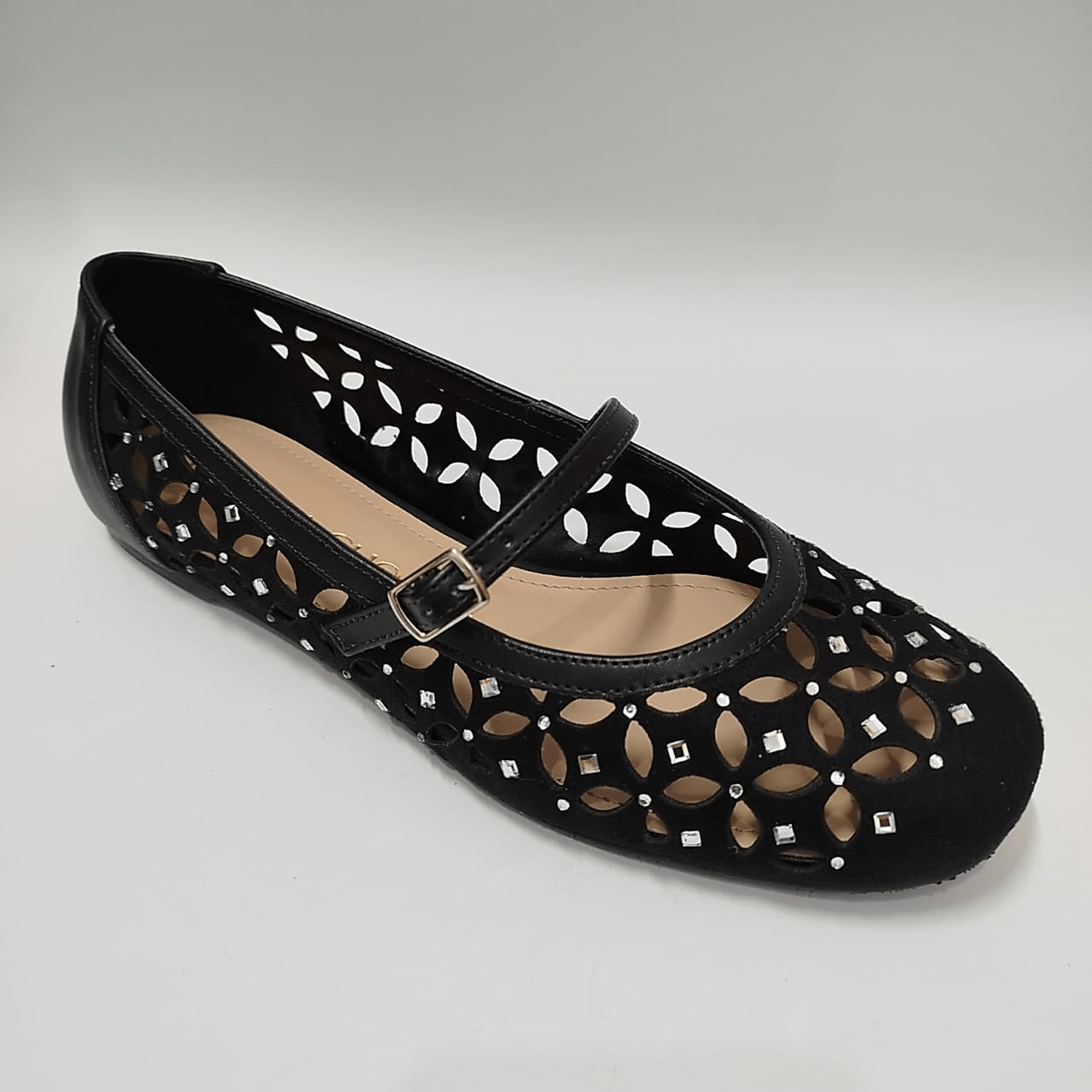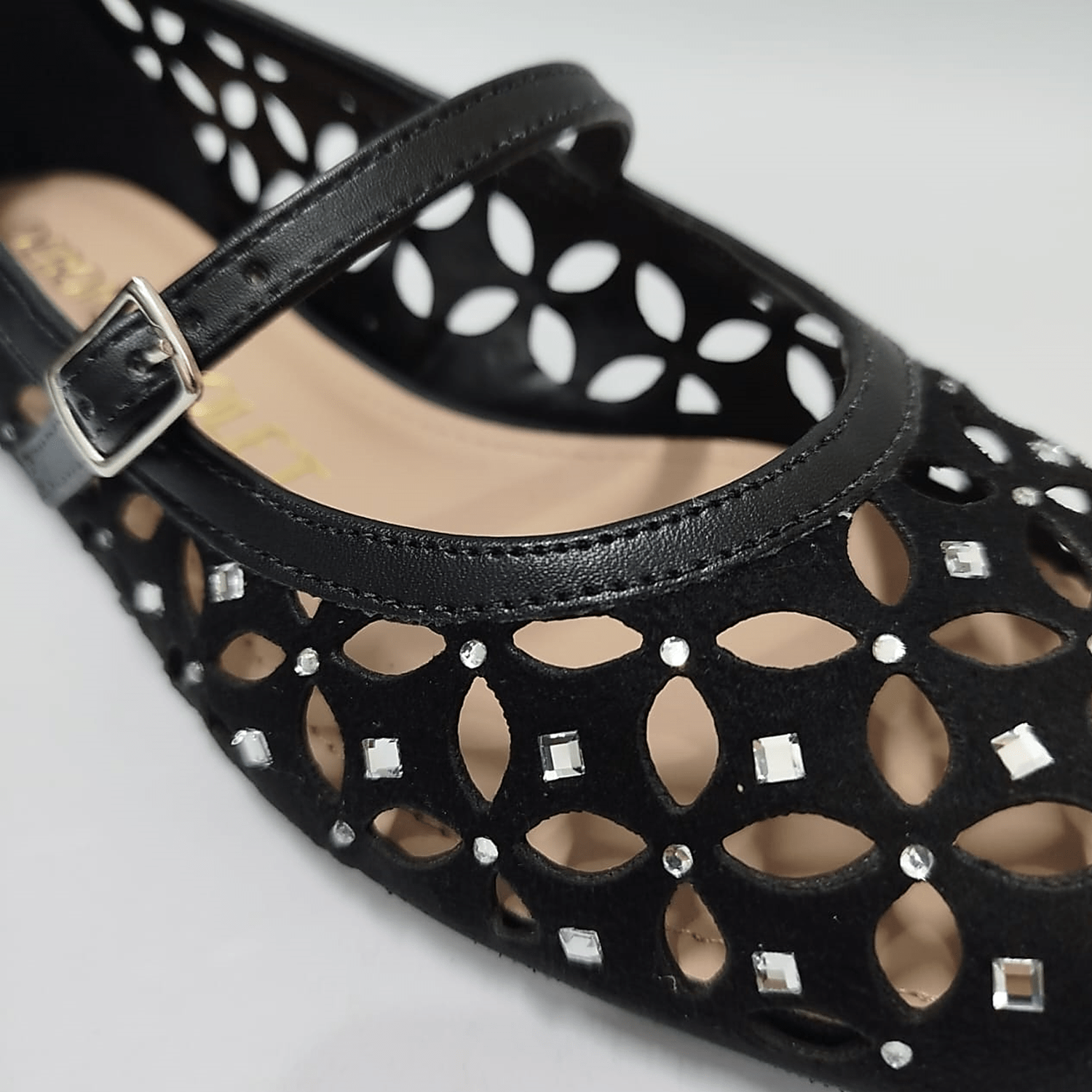 Sapatilha em camurça preta vazada com aplicação de cristais que dão um toque diferenciado ao calçado.