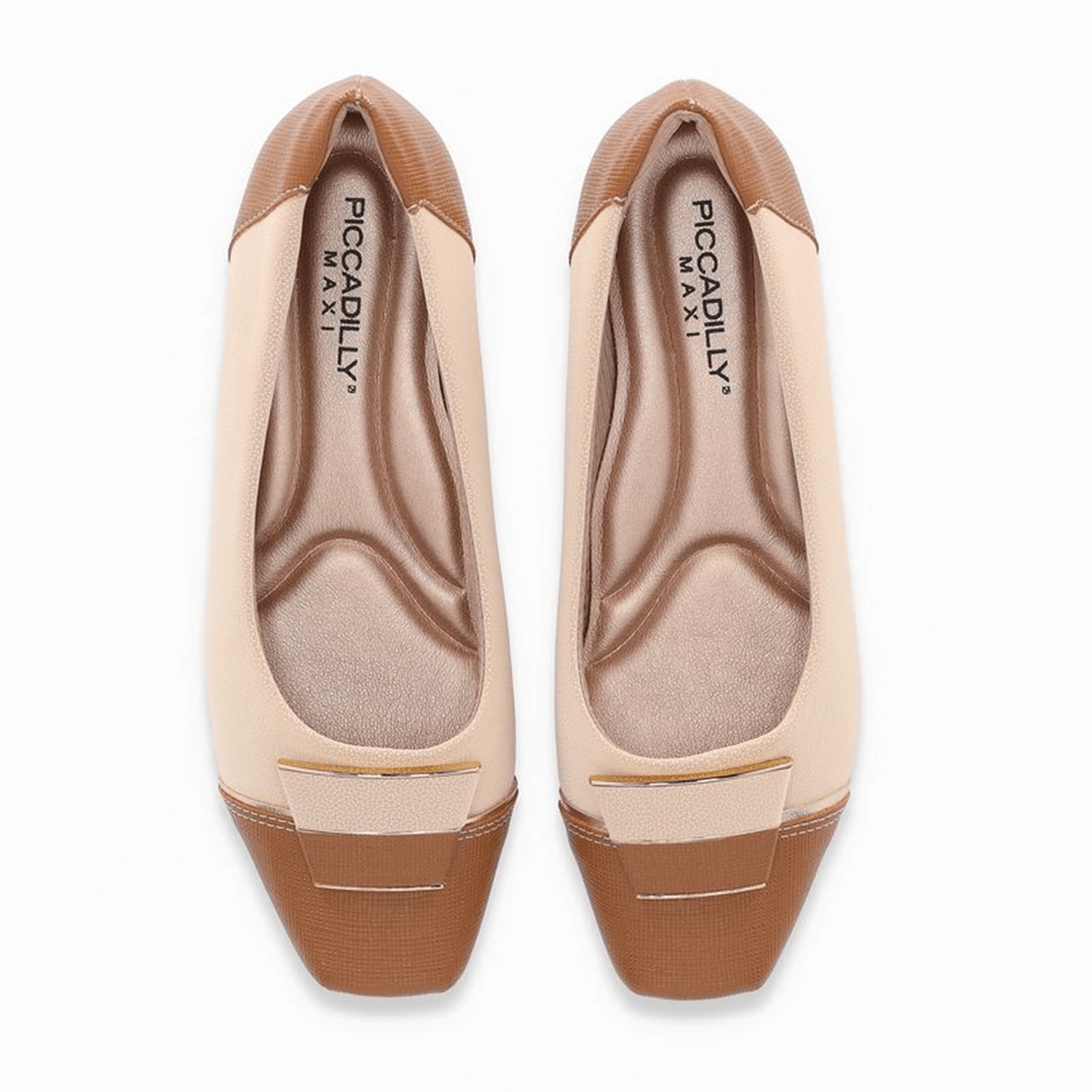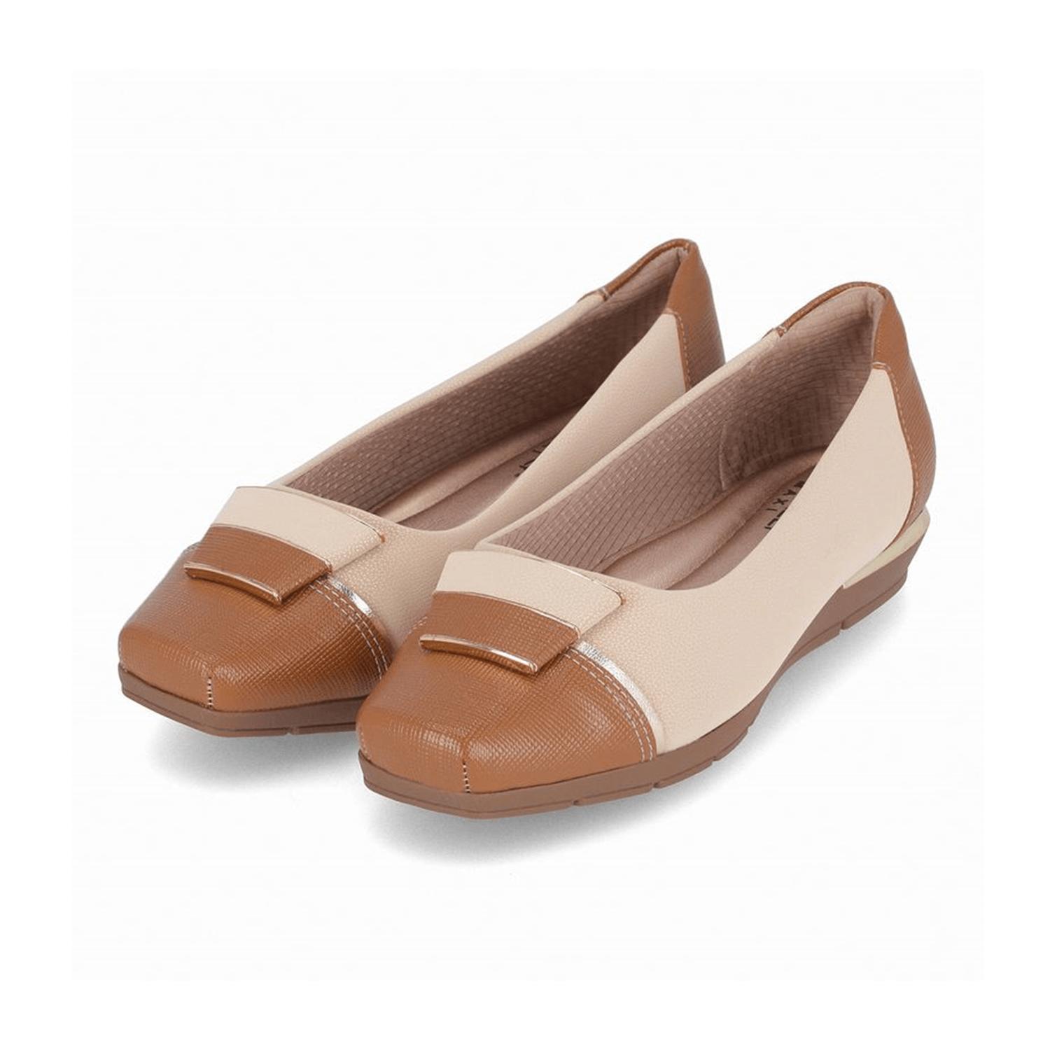 - Detalhes do modelo: Sapatilha feminina com bico quadrado e detalhe na parte frontal, onde uma faixa bege se sobrepõe a uma faixa caramelo, criando um adorno em forma de aplique. Acabamento e detalhes em dourado.