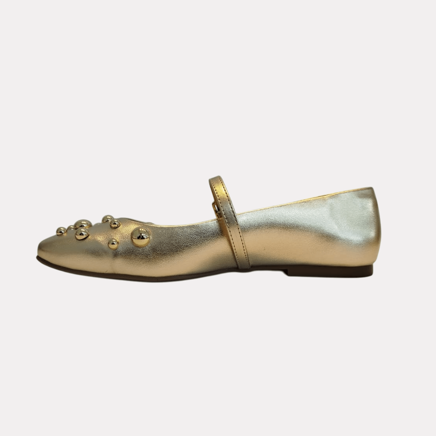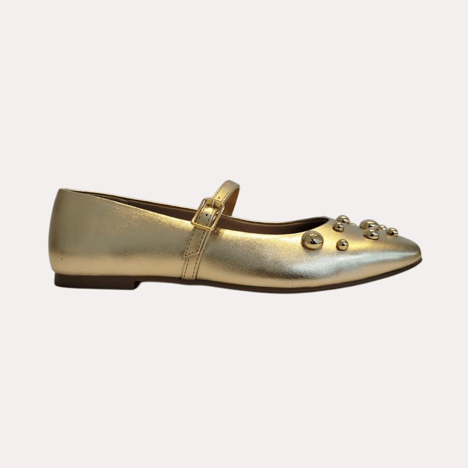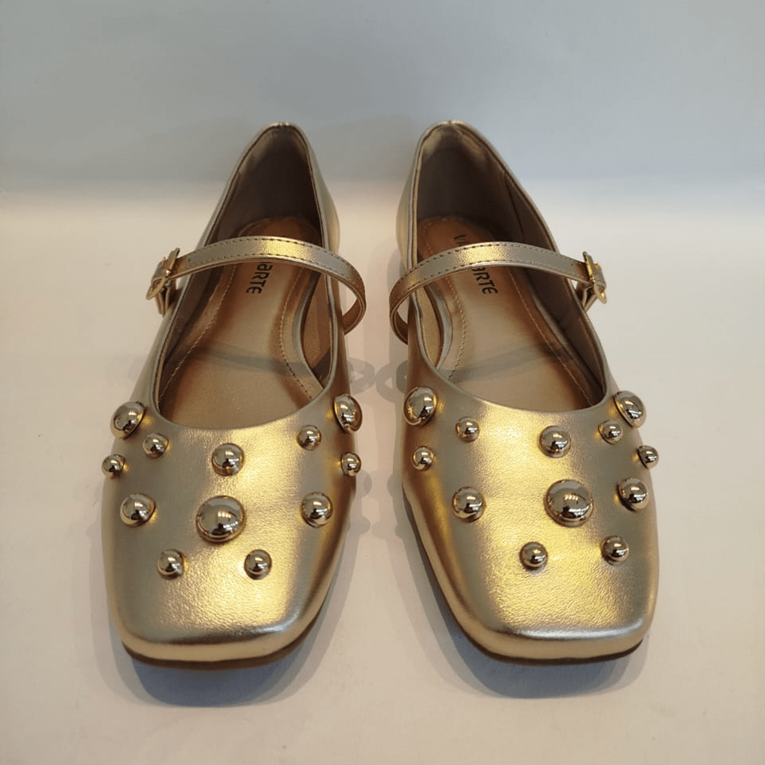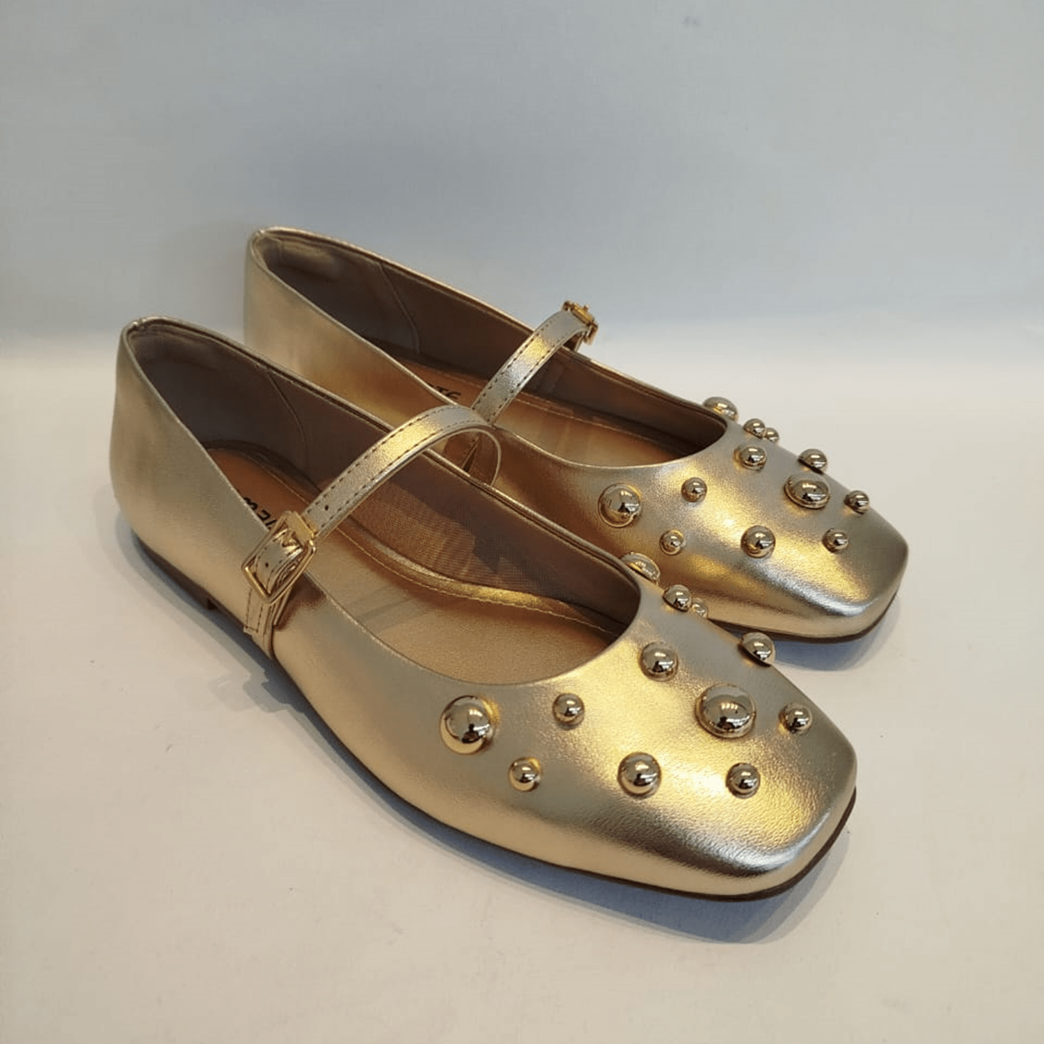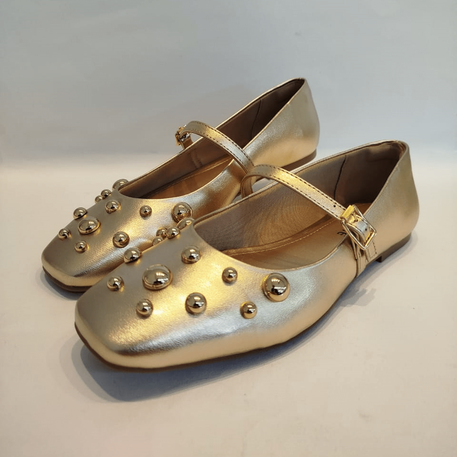 - Detalhes do modelo: Sapatilha feminina estilo Mary Jane ou Sapato Boneca. O calçado tem uma tira fina sobre o peito do pé, com fechamento por fivela dourada. O destaque do modelo são as tachas metálicas douradas de diferentes tamanhos, que estão distribuídas de forma irregular por todo o sapato.