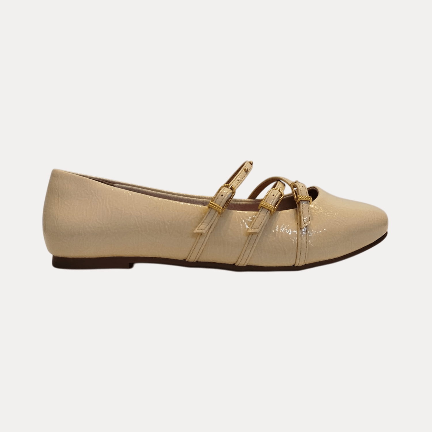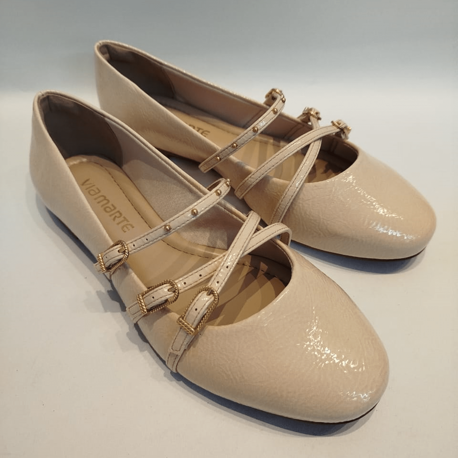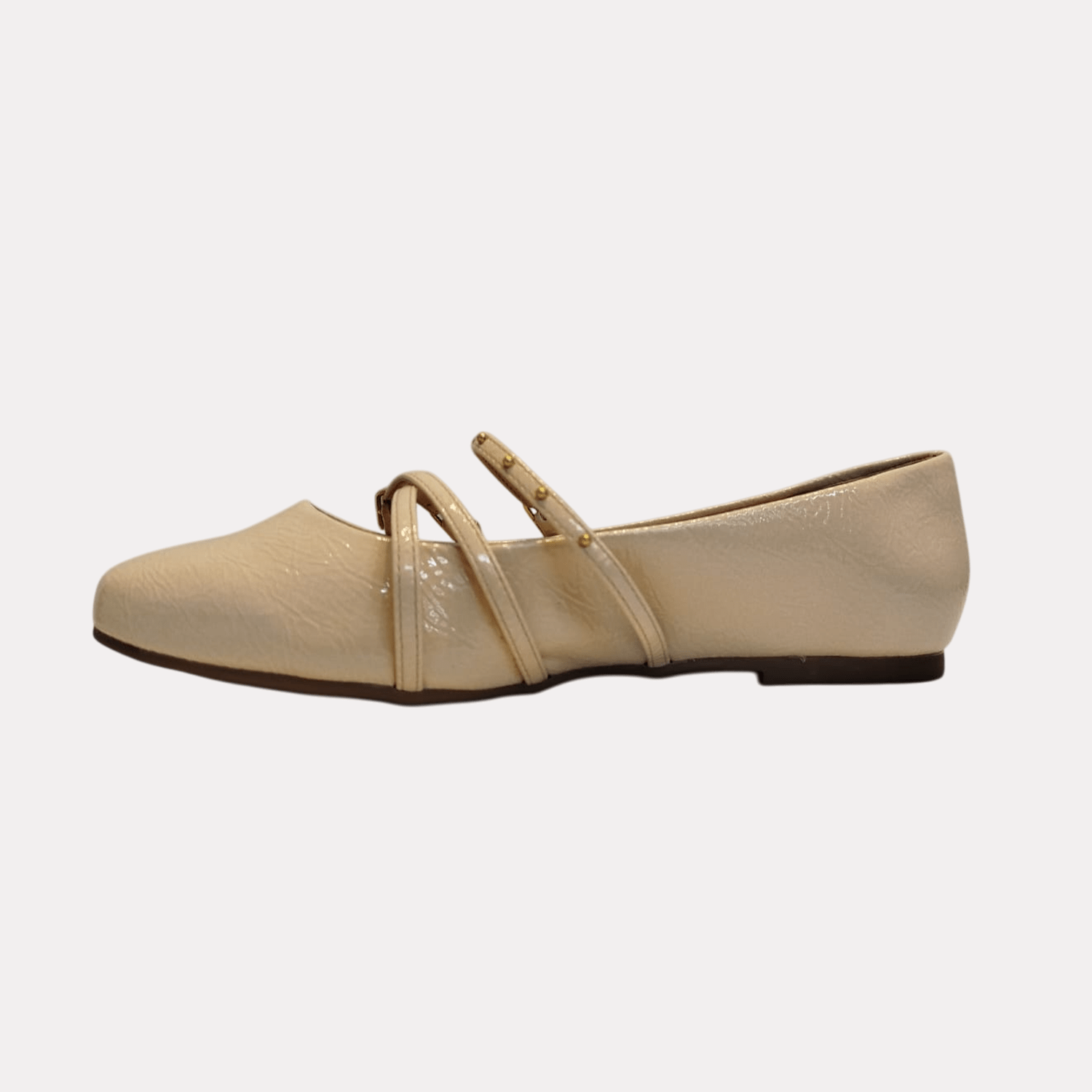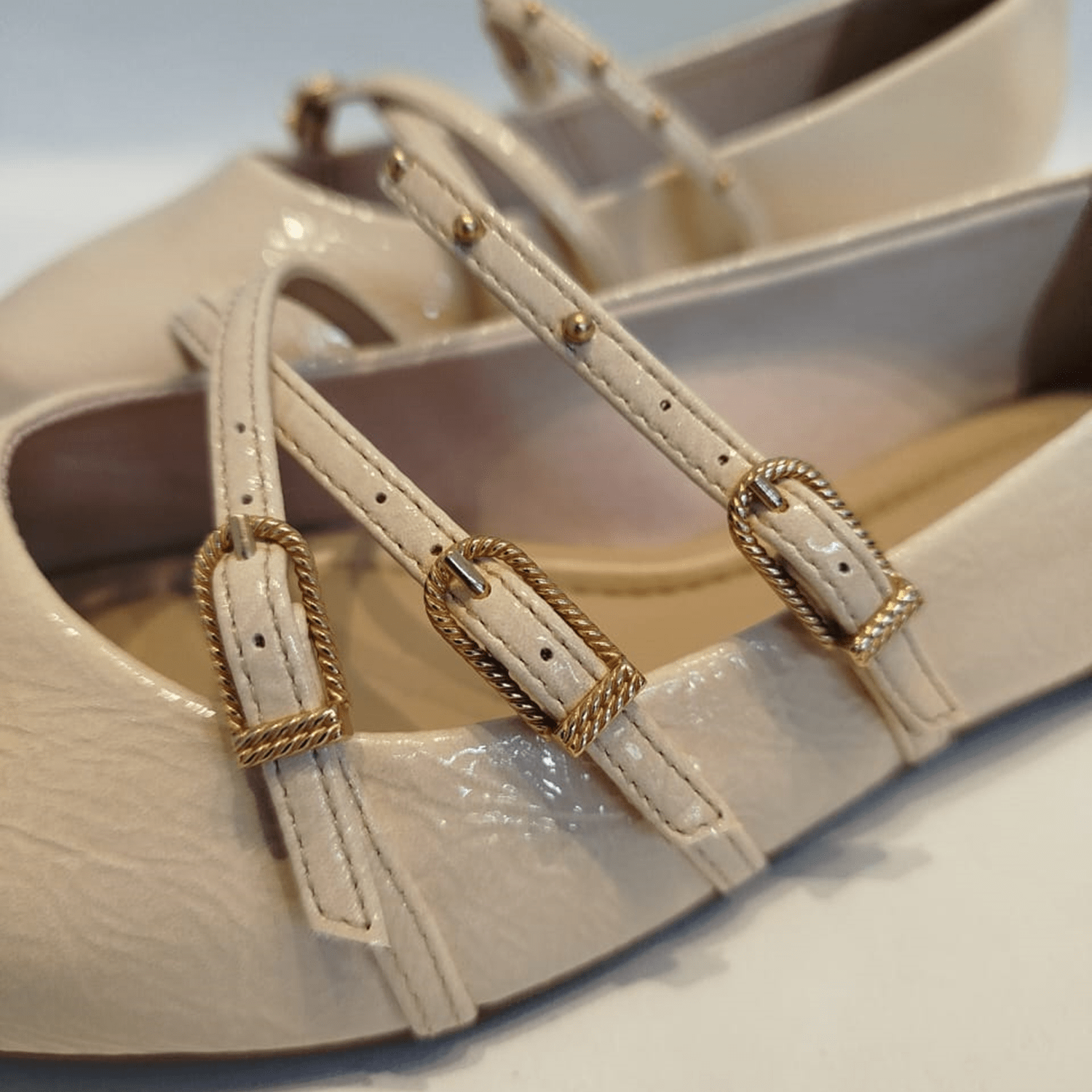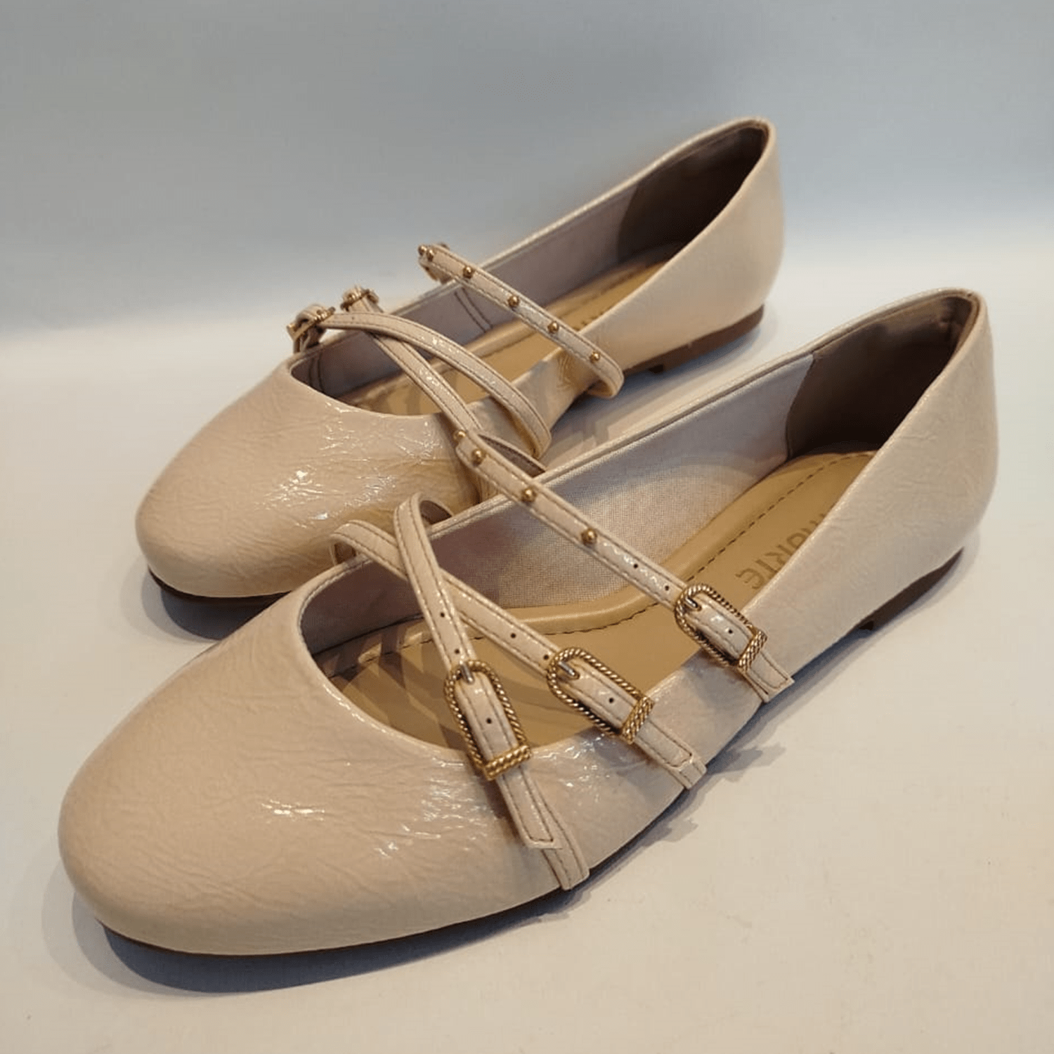 - Detalhes do modelo: Sapatilha de bico arredondado com acabamento envernizado. A principal característica do design são as tiras cruzadas sobre o peito do pé, que se prendem por meio de fivelas douradas. Além disso, as tiras são adornadas com pequenos tachas metálicas na cor dourada.