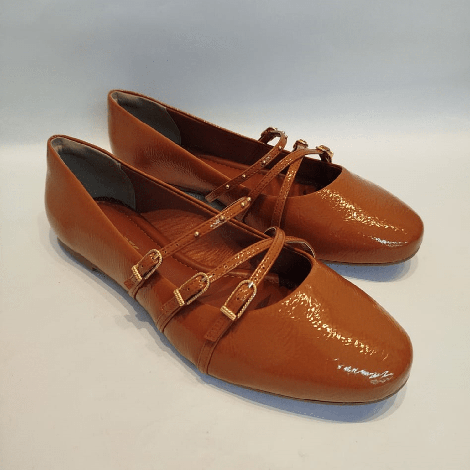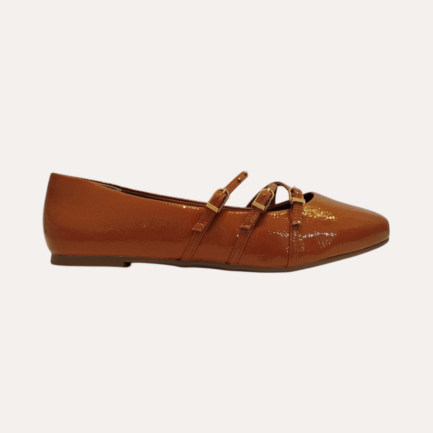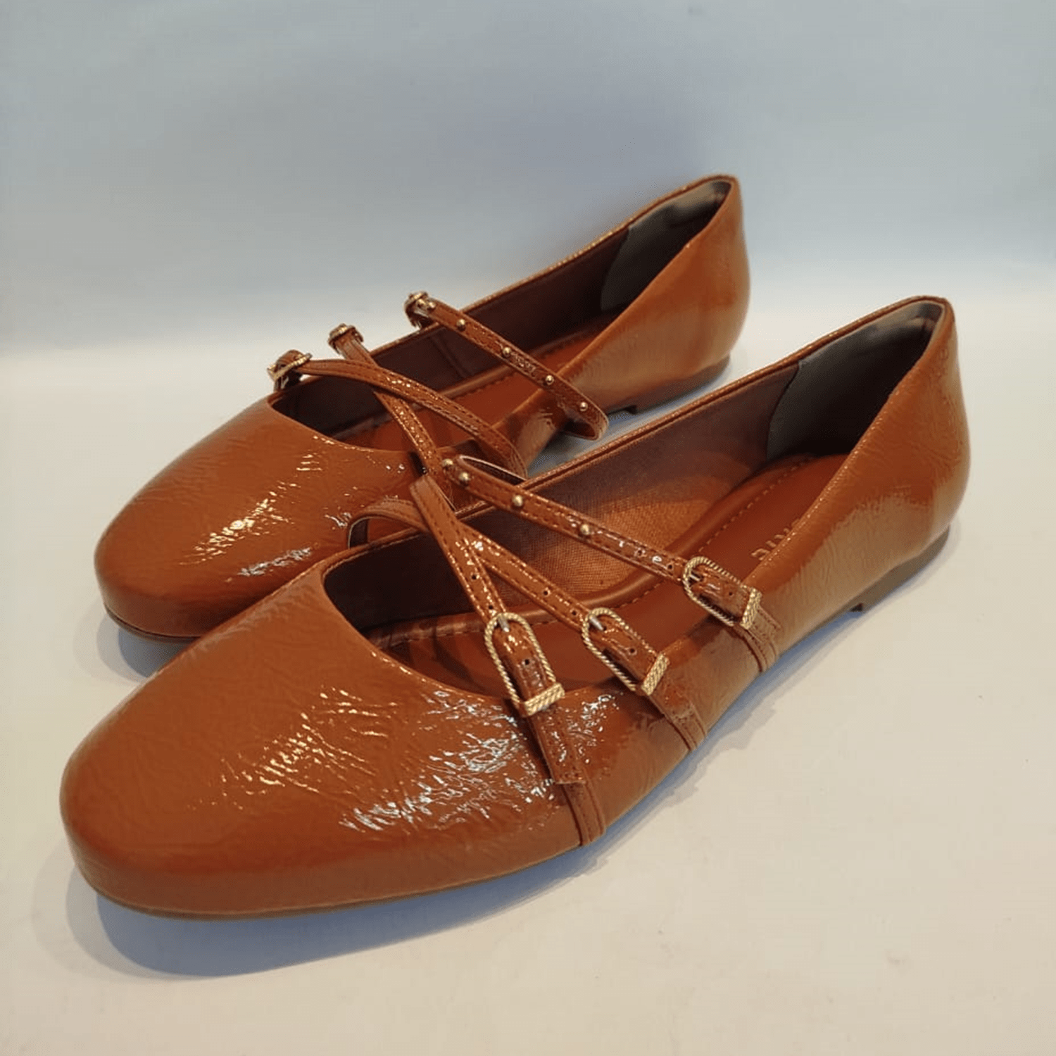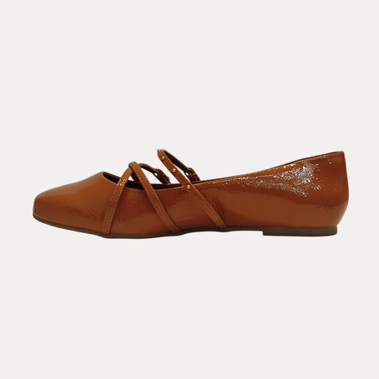- Detalhes do modelo: Sapatilha de bico arredondado com acabamento envernizado. A principal característica do design são as tiras cruzadas sobre o peito do pé, que se prendem por meio de fivelas douradas. Além disso, as tiras são adornadas com pequenos tachas metálicas na cor dourada.