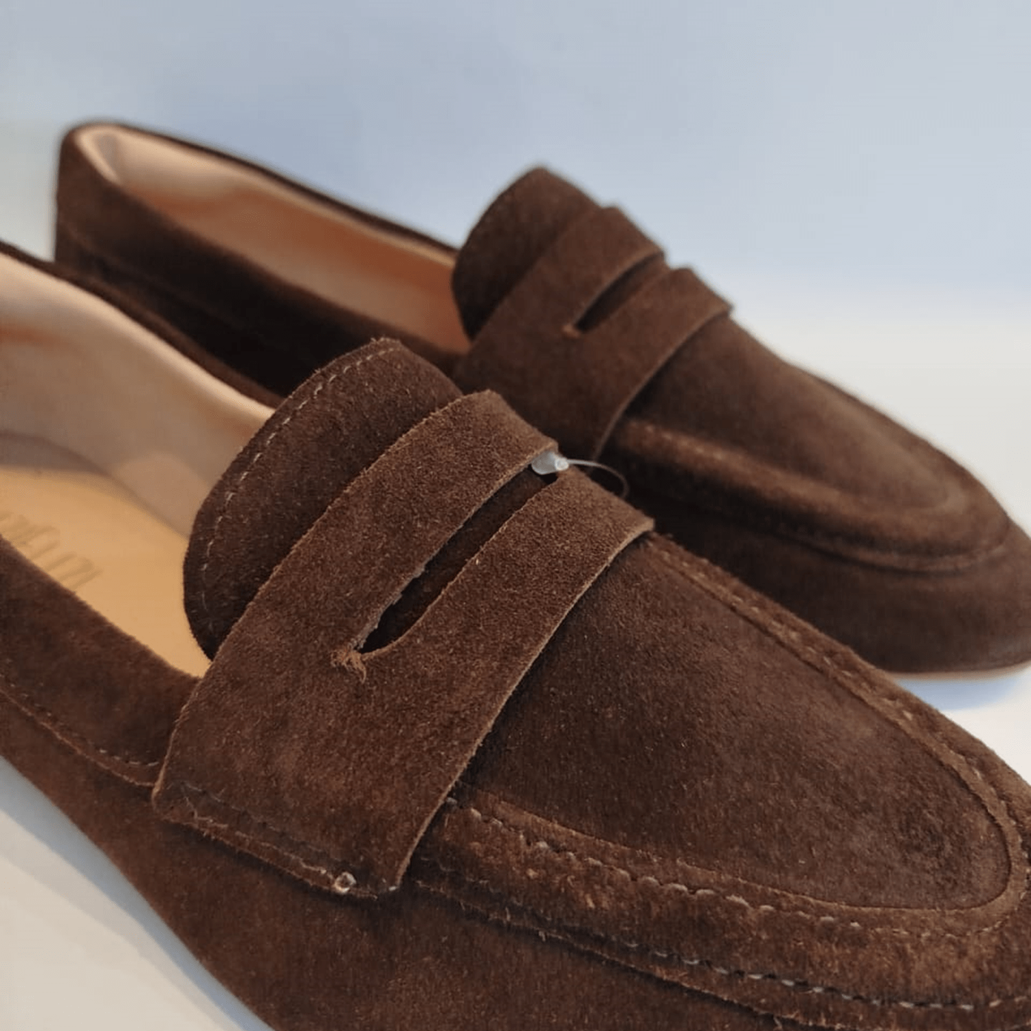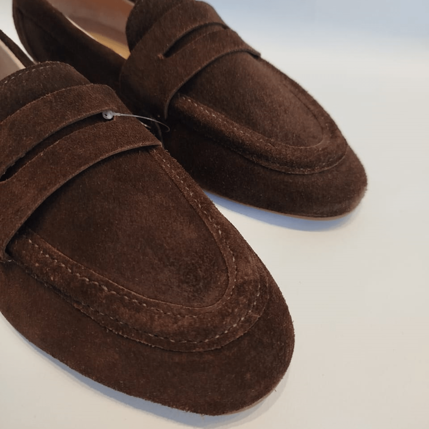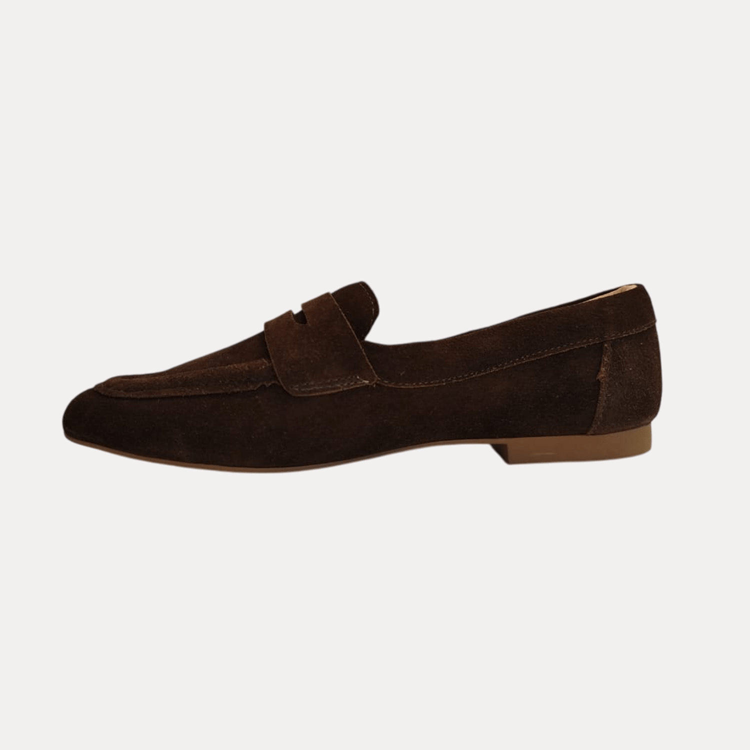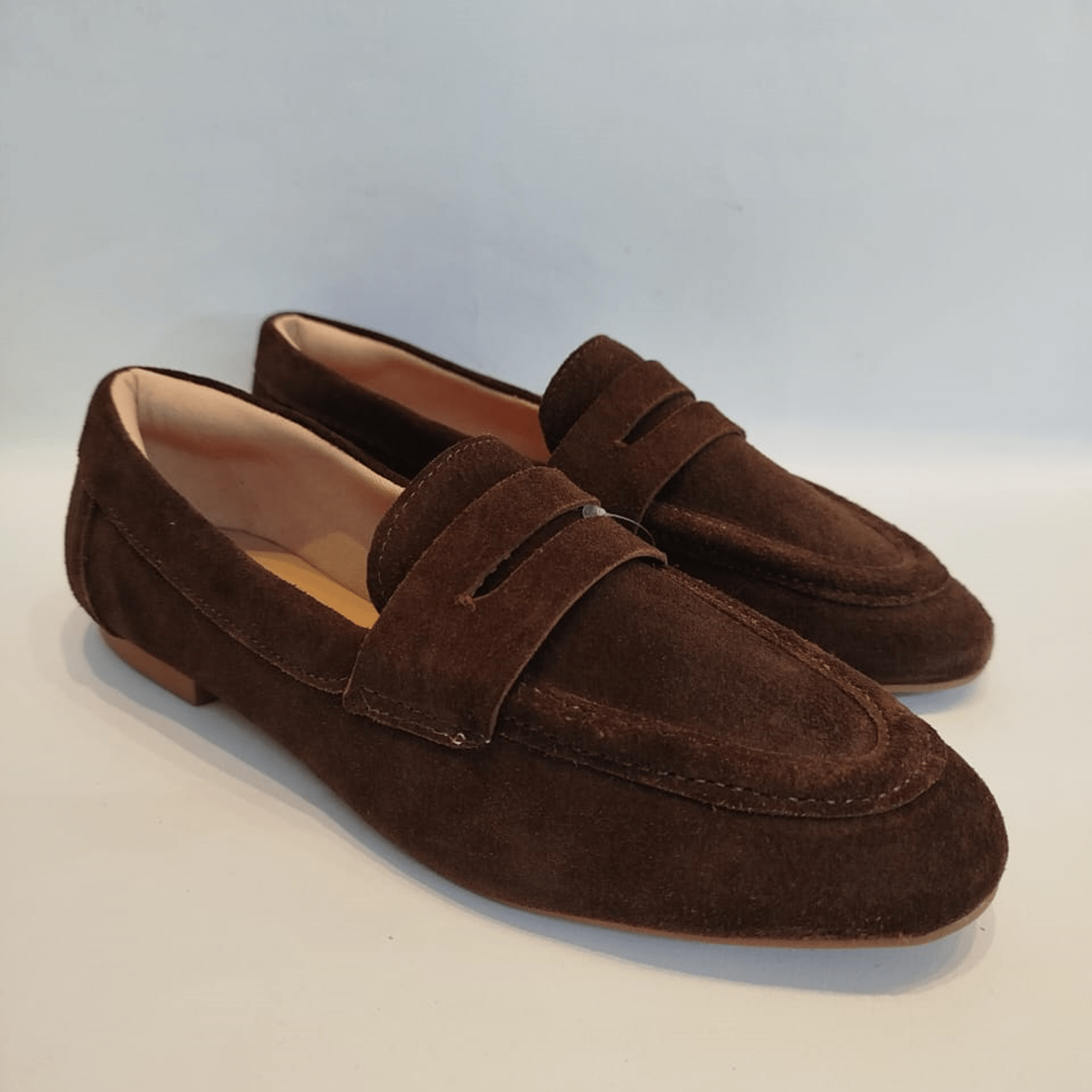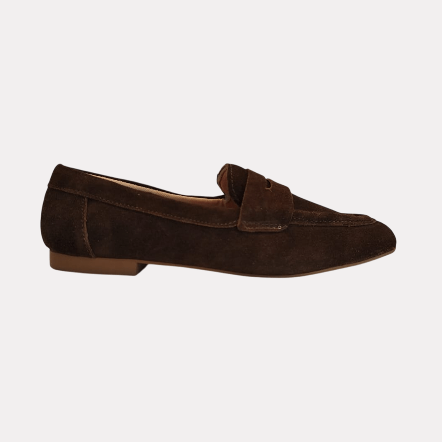 - Detalhes do modelo: Sapato Feminino de camurça estilo mocassim penny loafer. Eles têm um bico elegante em forma de amêndoa e um perfil baixo. A costura é bem visível ao redor da parte superior do sapato, principalmente na ponta, o que adiciona um toque decorativo e estrutural. No geral, este é um sapato casual, clássico e elegante, ideal para um visual confortável e sofisticado.